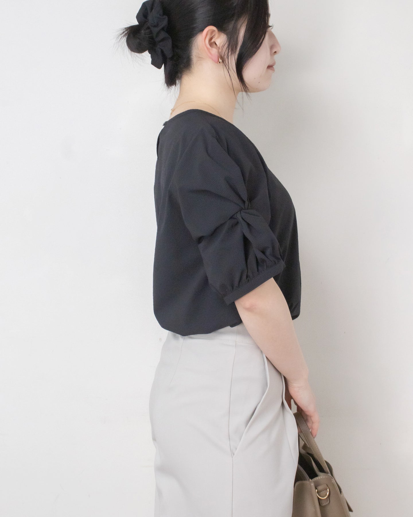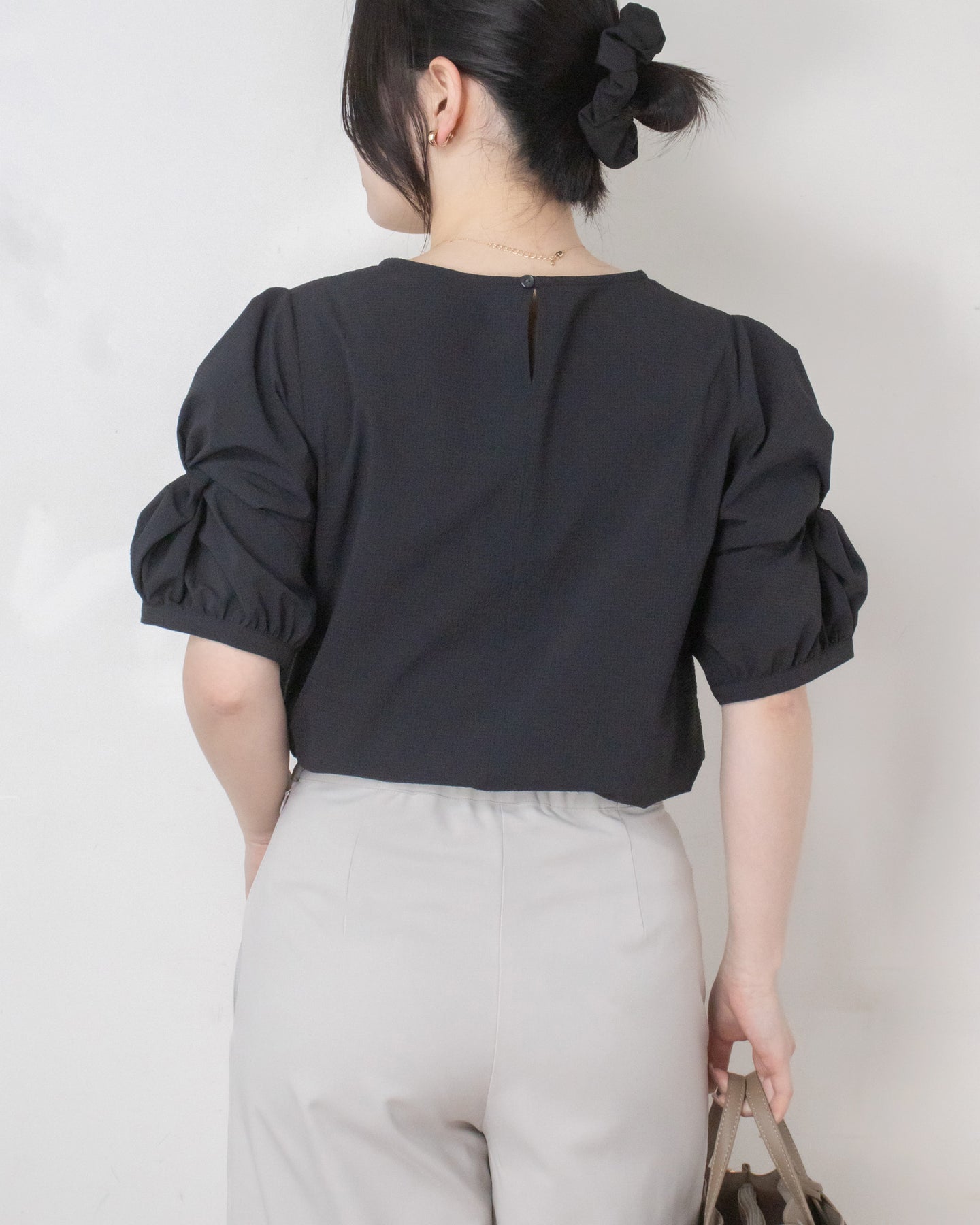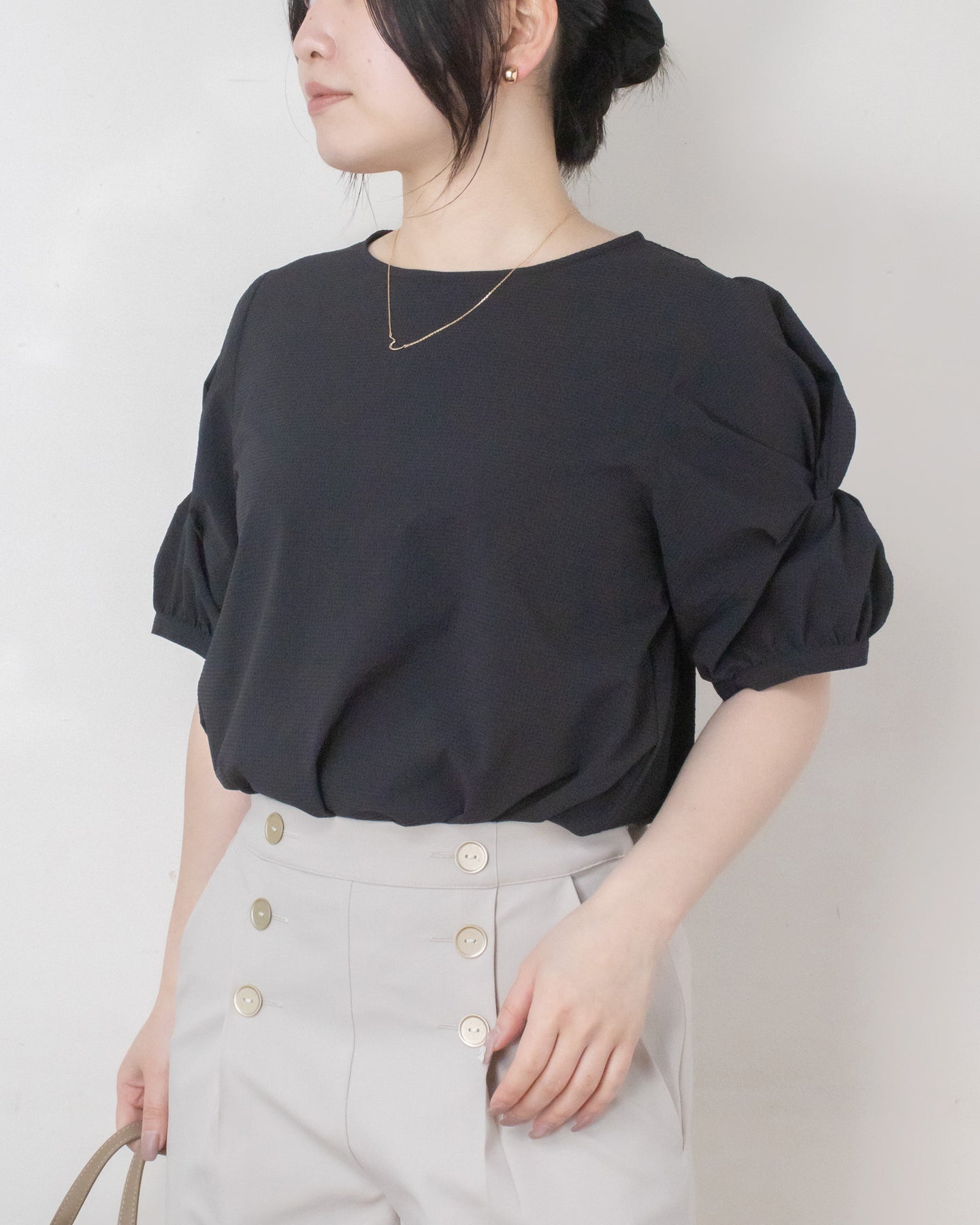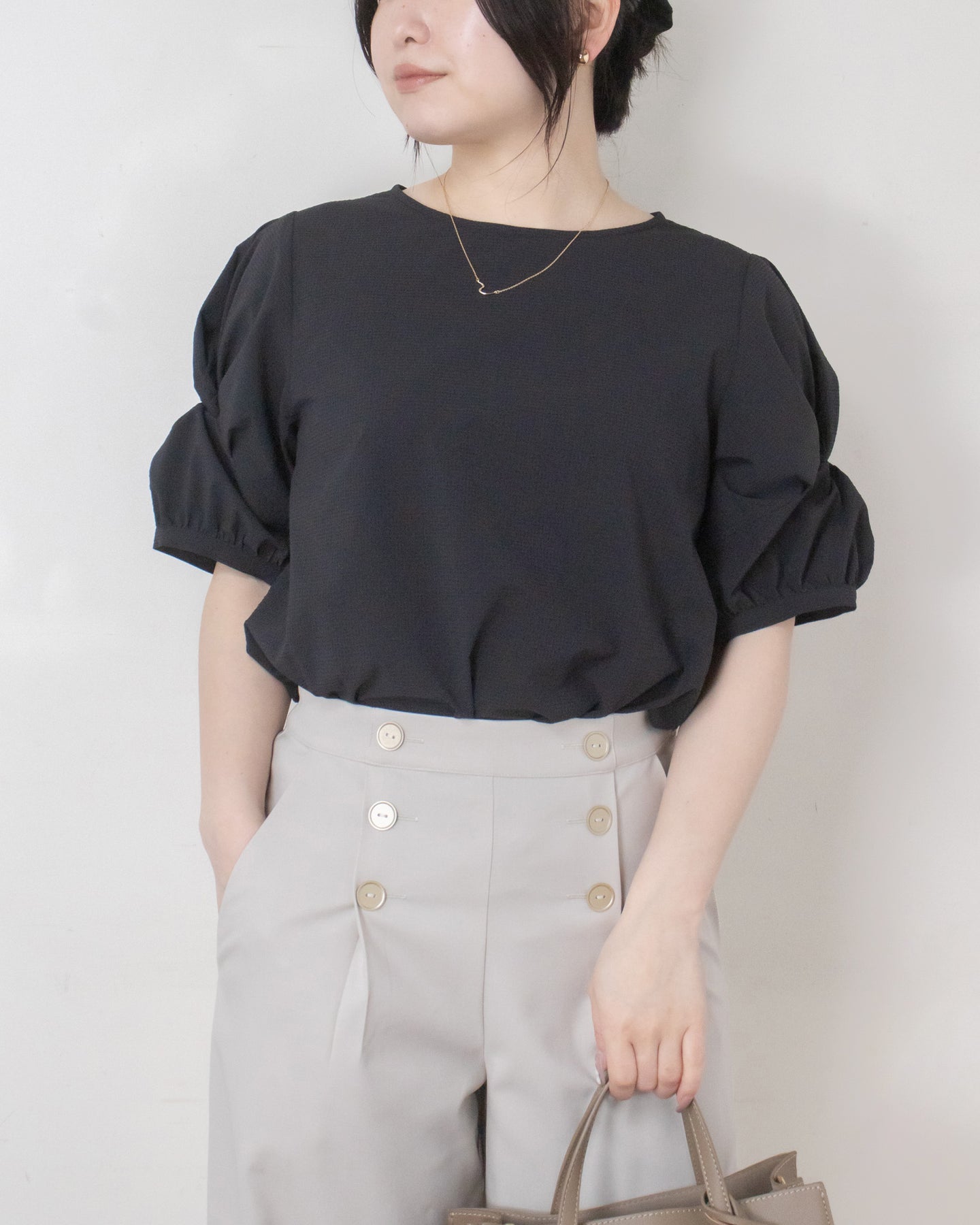 ■デザイン ねじりデザインの袖が目を引く、立体感のあるブラウス。 袖にはねじりに加えてタックやギャザーを組み合わせ、程よい丸みのあるシルエットに仕上げました。 ボリュームのある袖に対してカフスは細めにすることで、重たく見えないバランスに調整。 シンプルながら一枚で着映えするデザインです。 素材は吸汗速乾機能付きのドライタッチ素材を使用しており、暑い季節でもさらっと快適に着ていただけます。