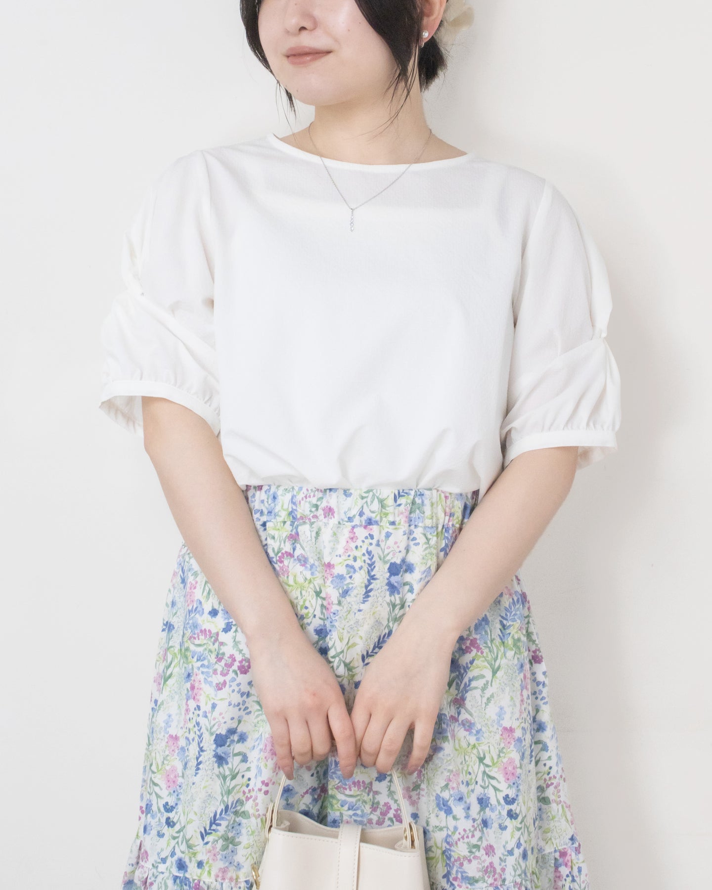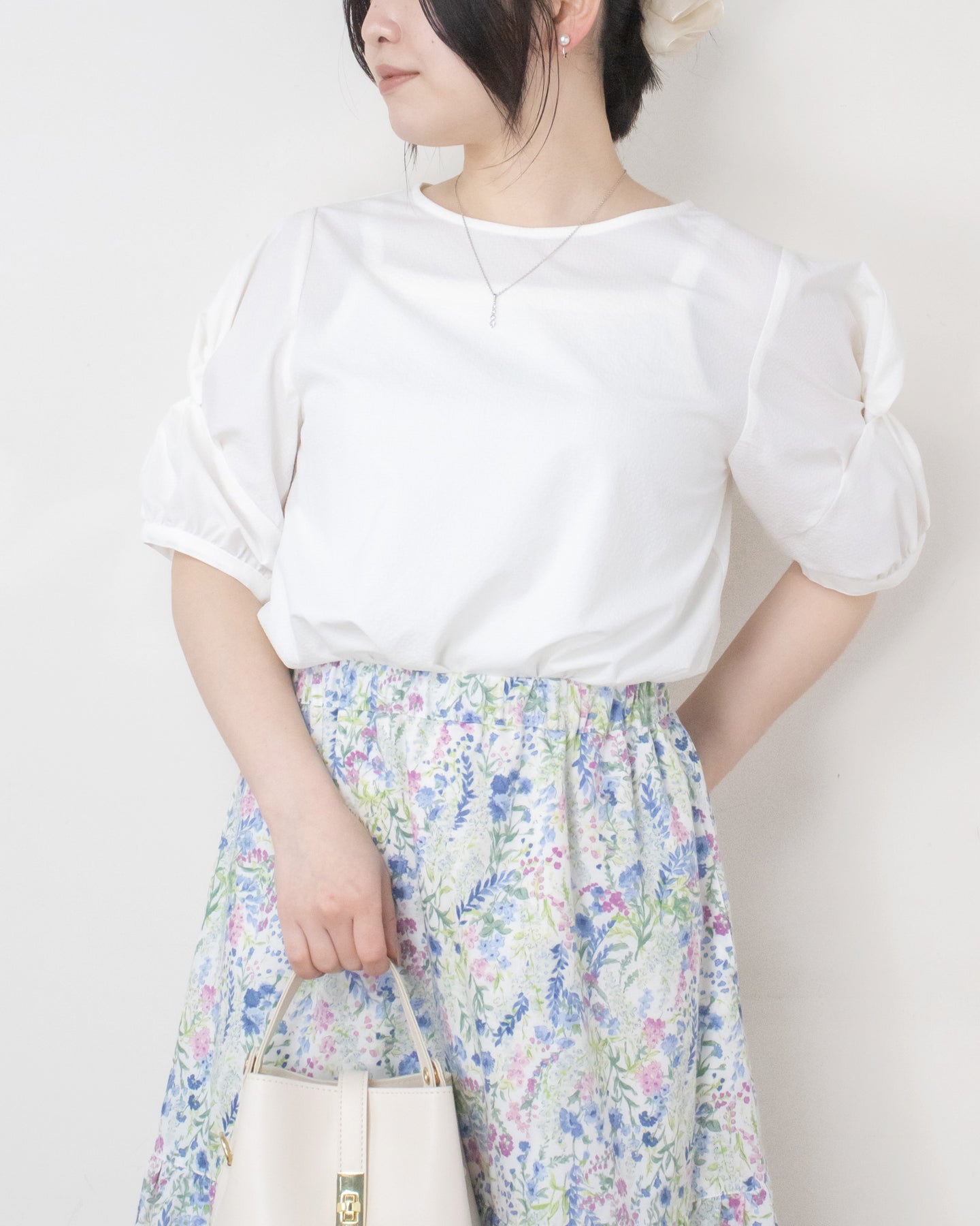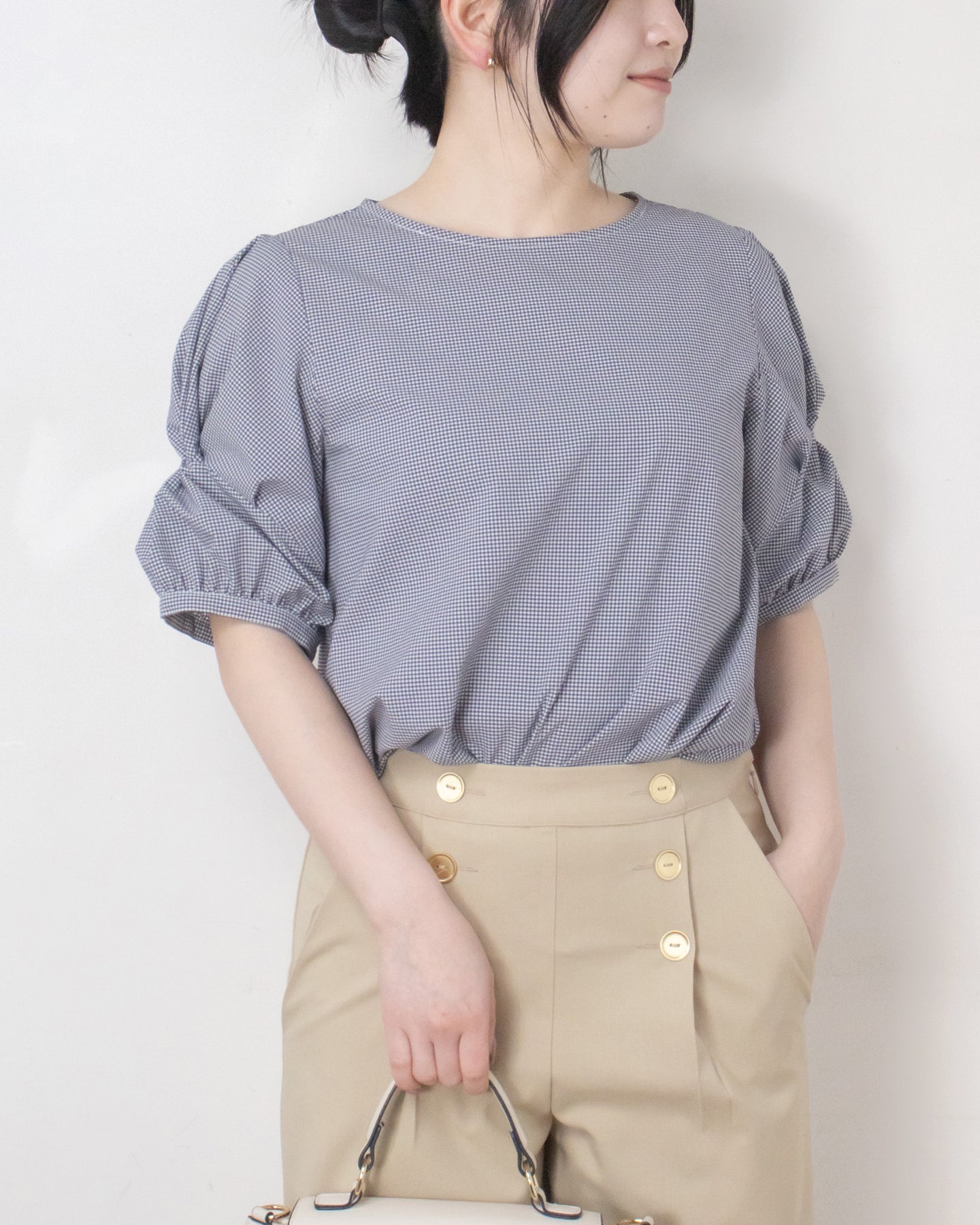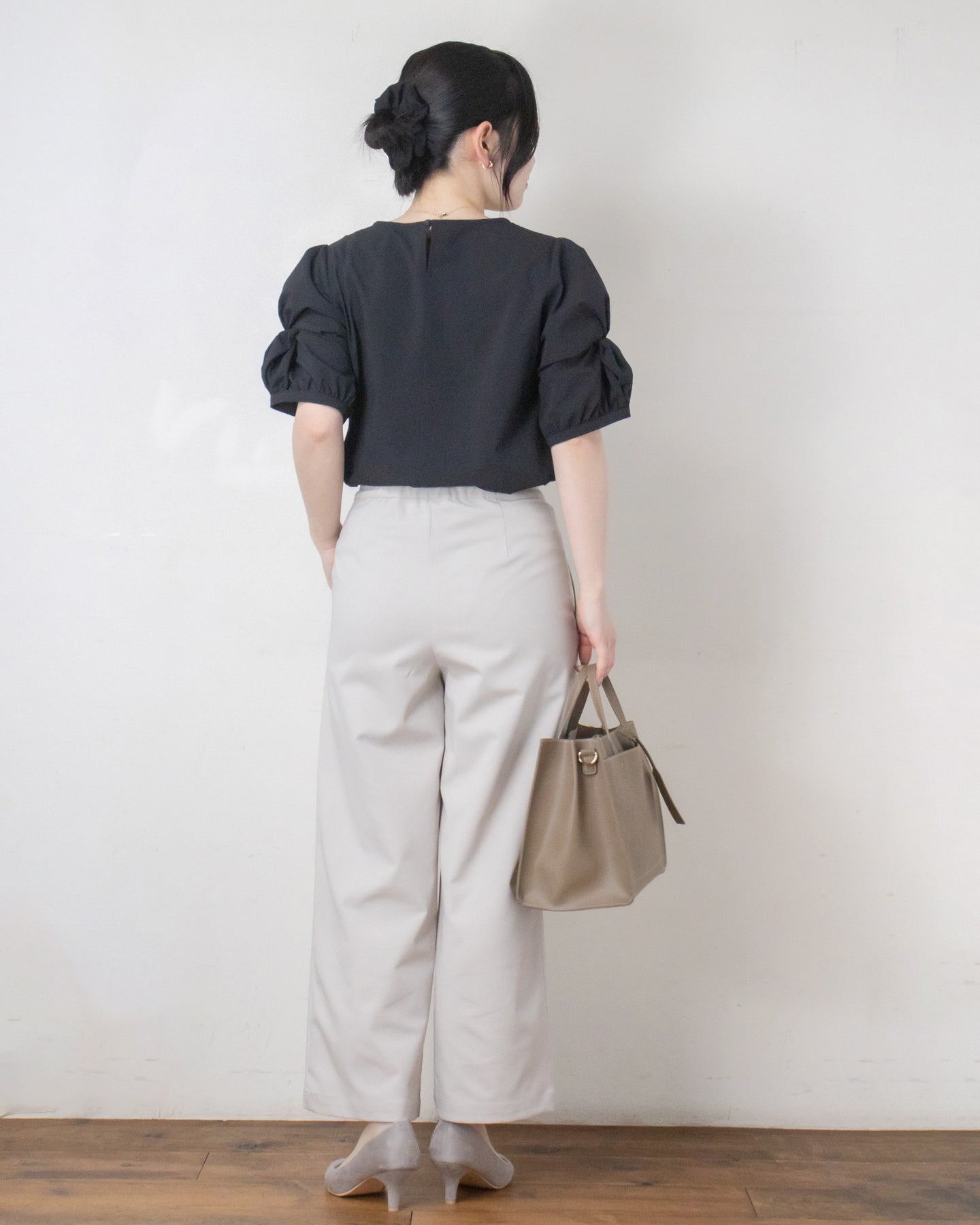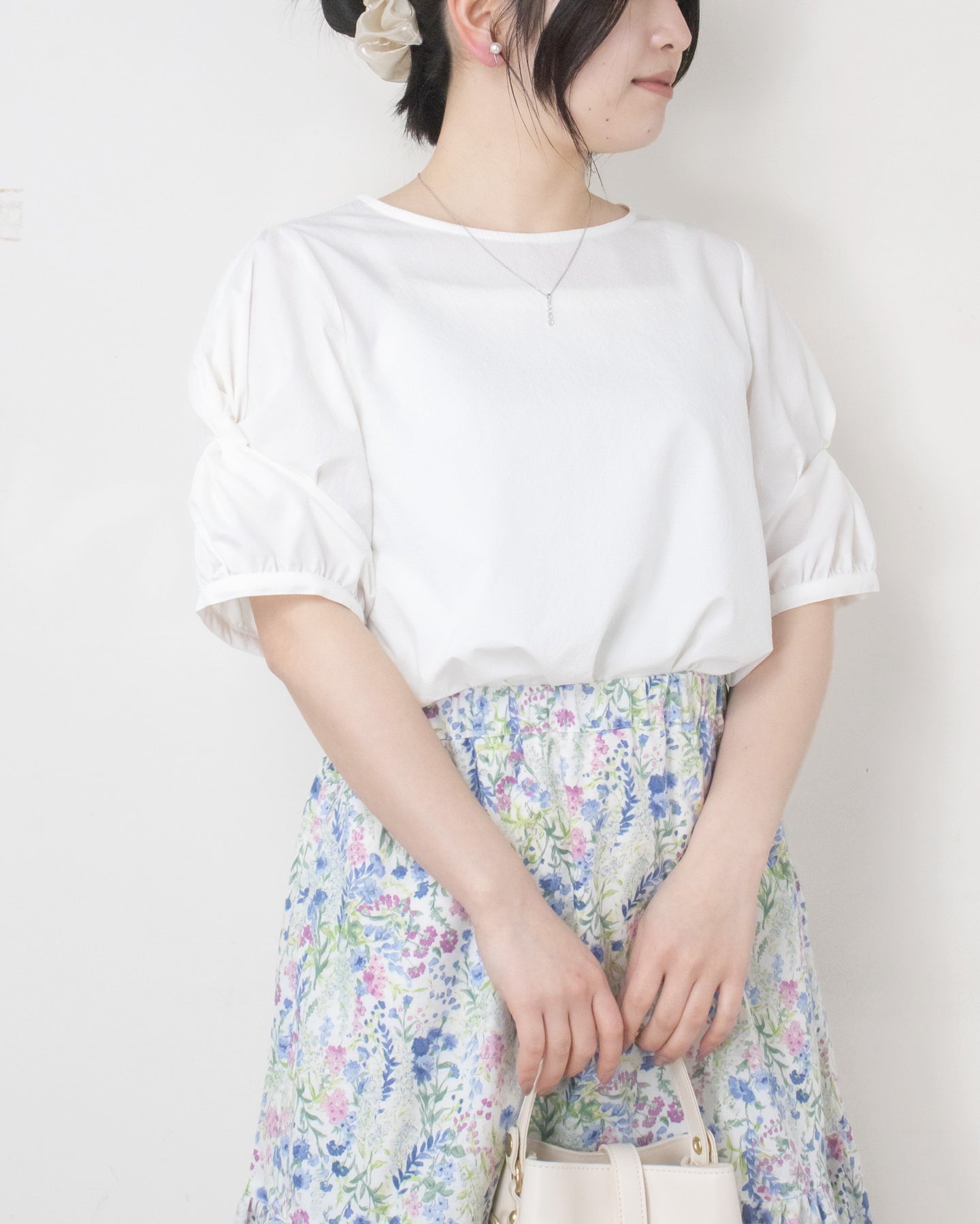 ■デザイン ねじりデザインの袖が目を引く、立体感のあるブラウス。 袖にはねじりに加えてタックやギャザーを組み合わせ、程よい丸みのあるシルエットに仕上げました。 ボリュームのある袖に対してカフスは細めにすることで、重たく見えないバランスに調整。 シンプルながら一枚で着映えするデザインです。 素材は吸汗速乾機能付きのドライタッチ素材を使用しており、暑い季節でもさらっと快適に着ていただけます。