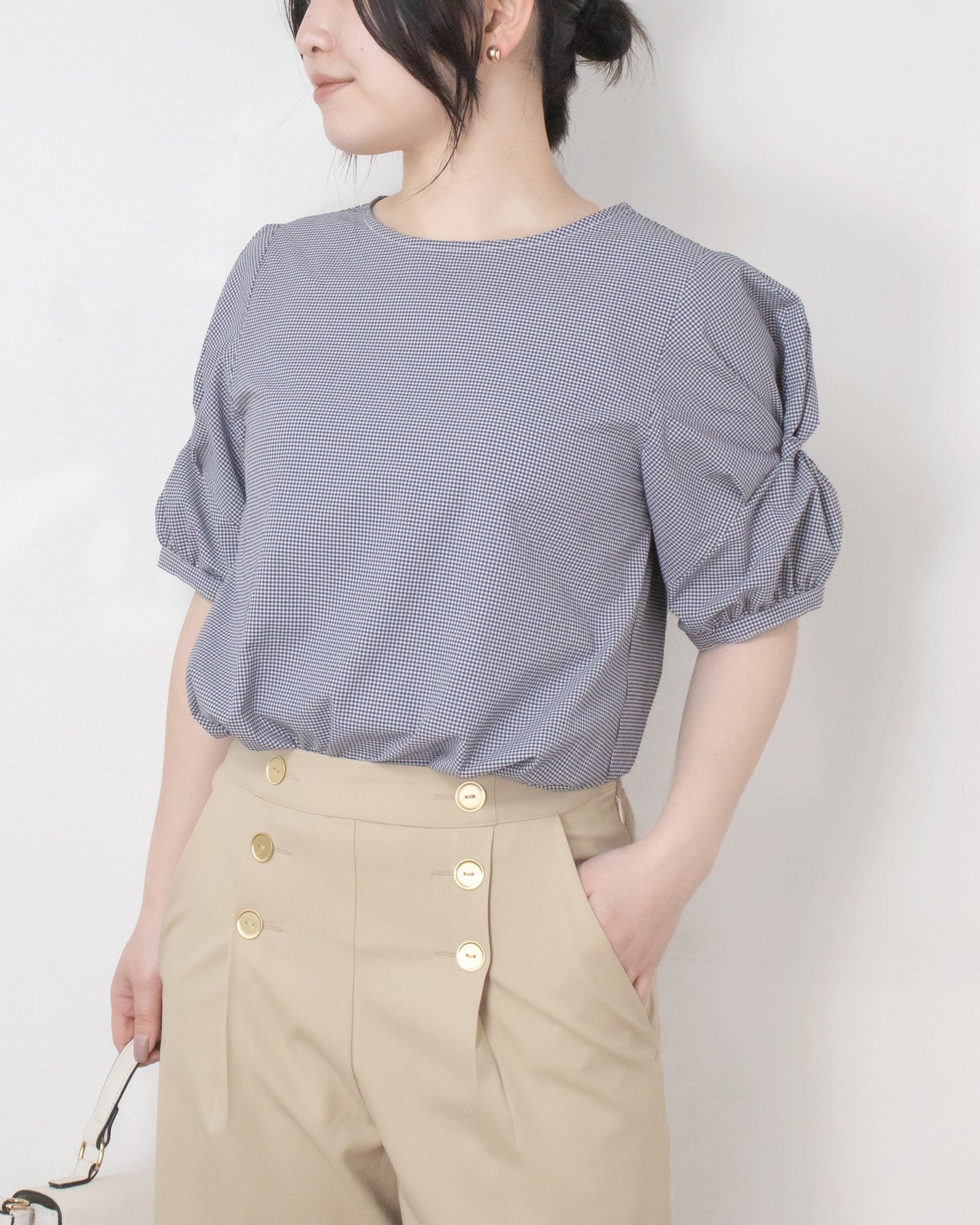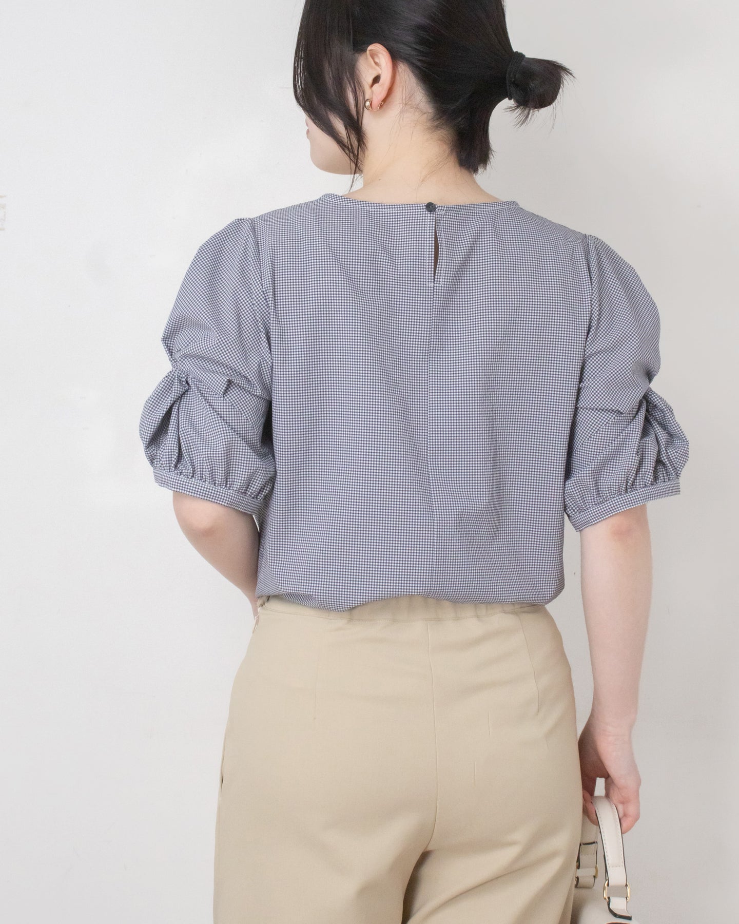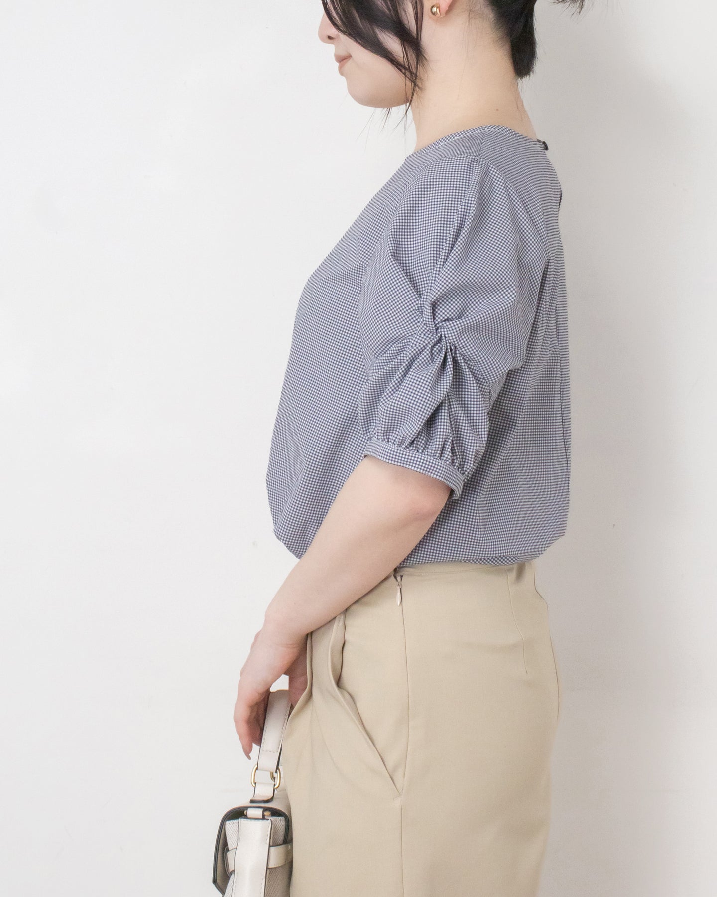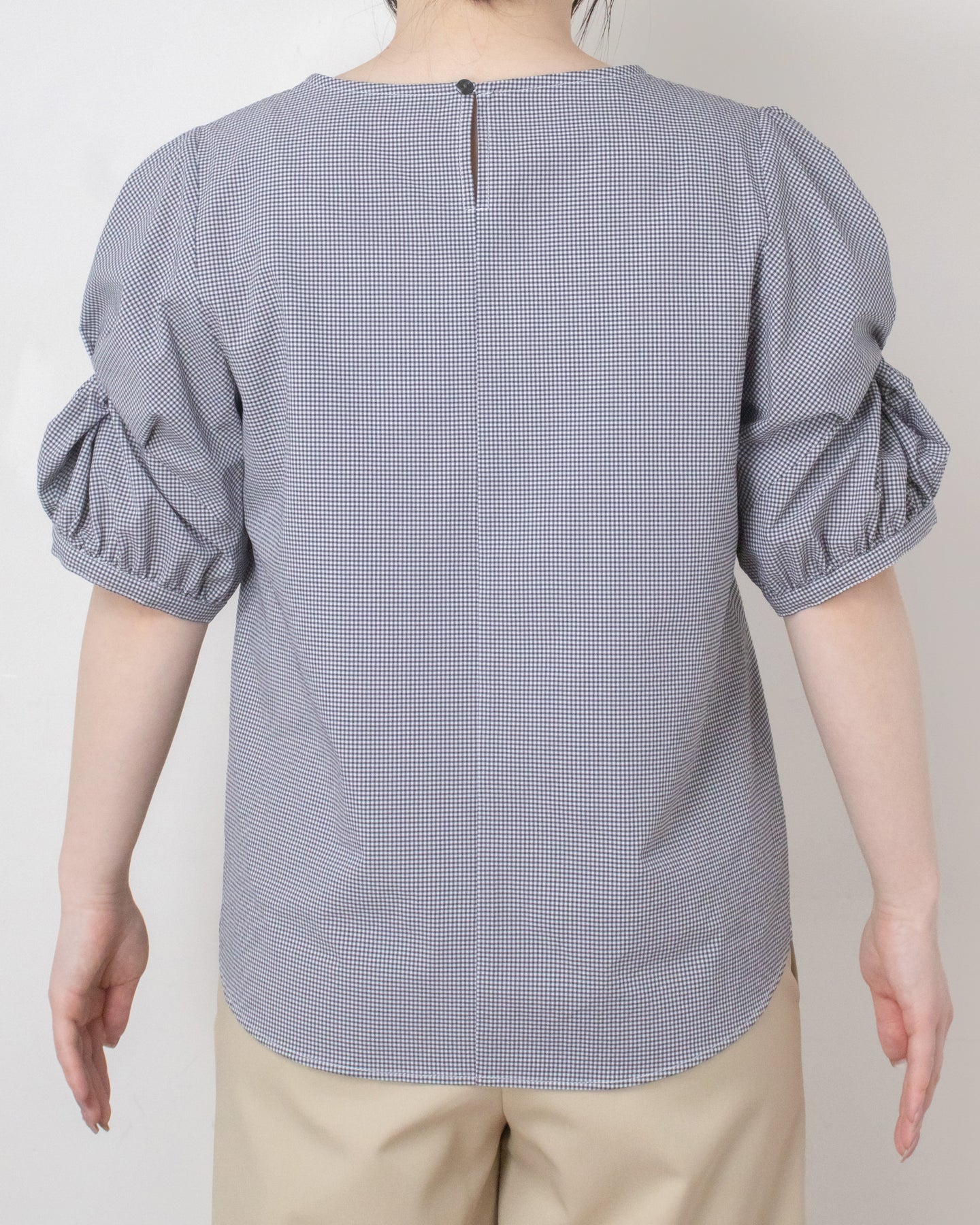 ■デザイン ねじりデザインの袖が目を引く、立体感のあるブラウス。 袖にはねじりに加えてタックやギャザーを組み合わせ、程よい丸みのあるシルエットに仕上げました。 ボリュームのある袖に対してカフスは細めにすることで、重たく見えないバランスに調整。 シンプルながら一枚で着映えするデザインです。 素材は吸汗速乾機能付きのドライタッチ素材を使用しており、暑い季節でもさらっと快適に着ていただけます。