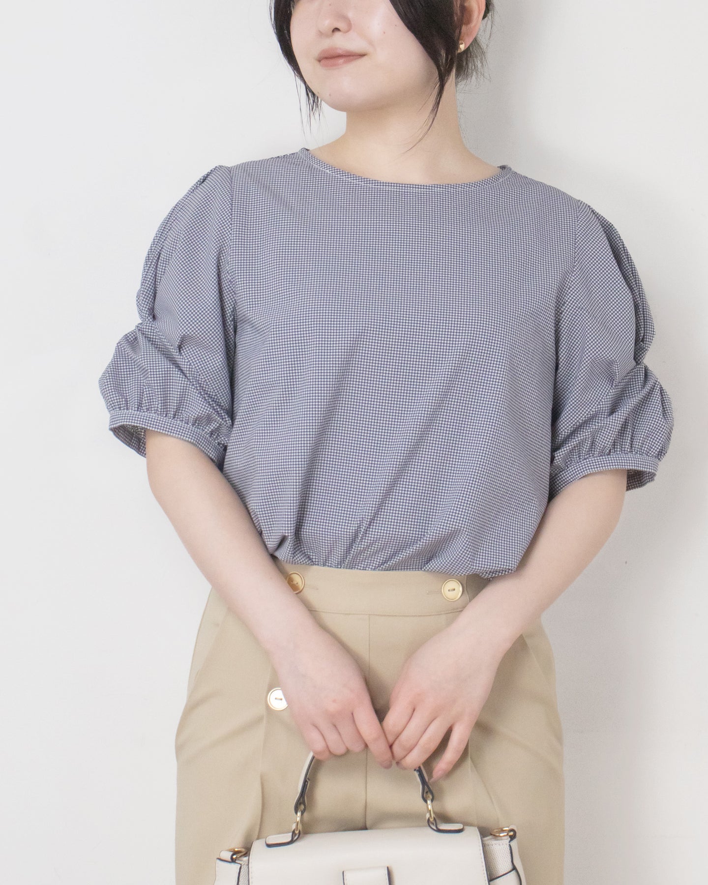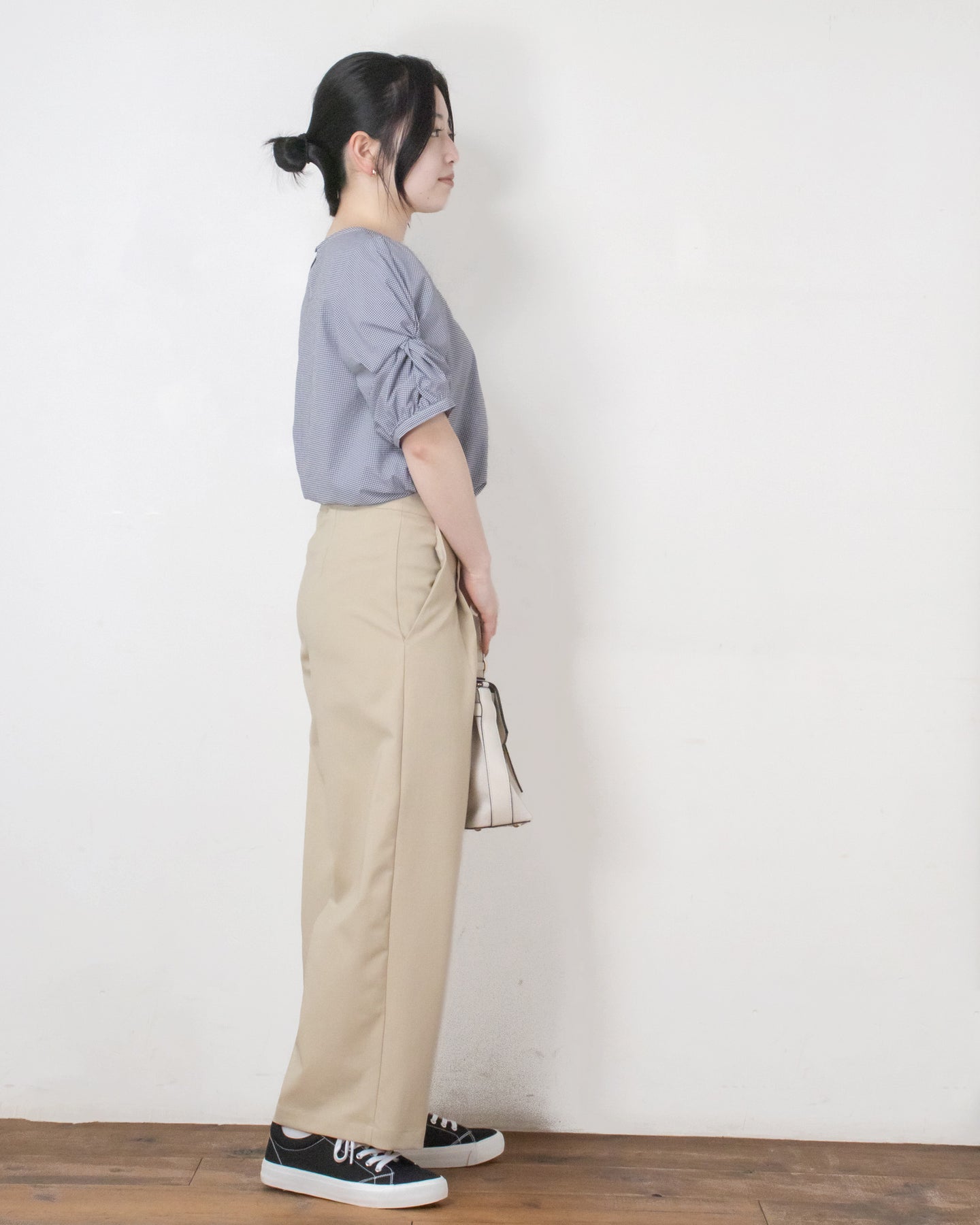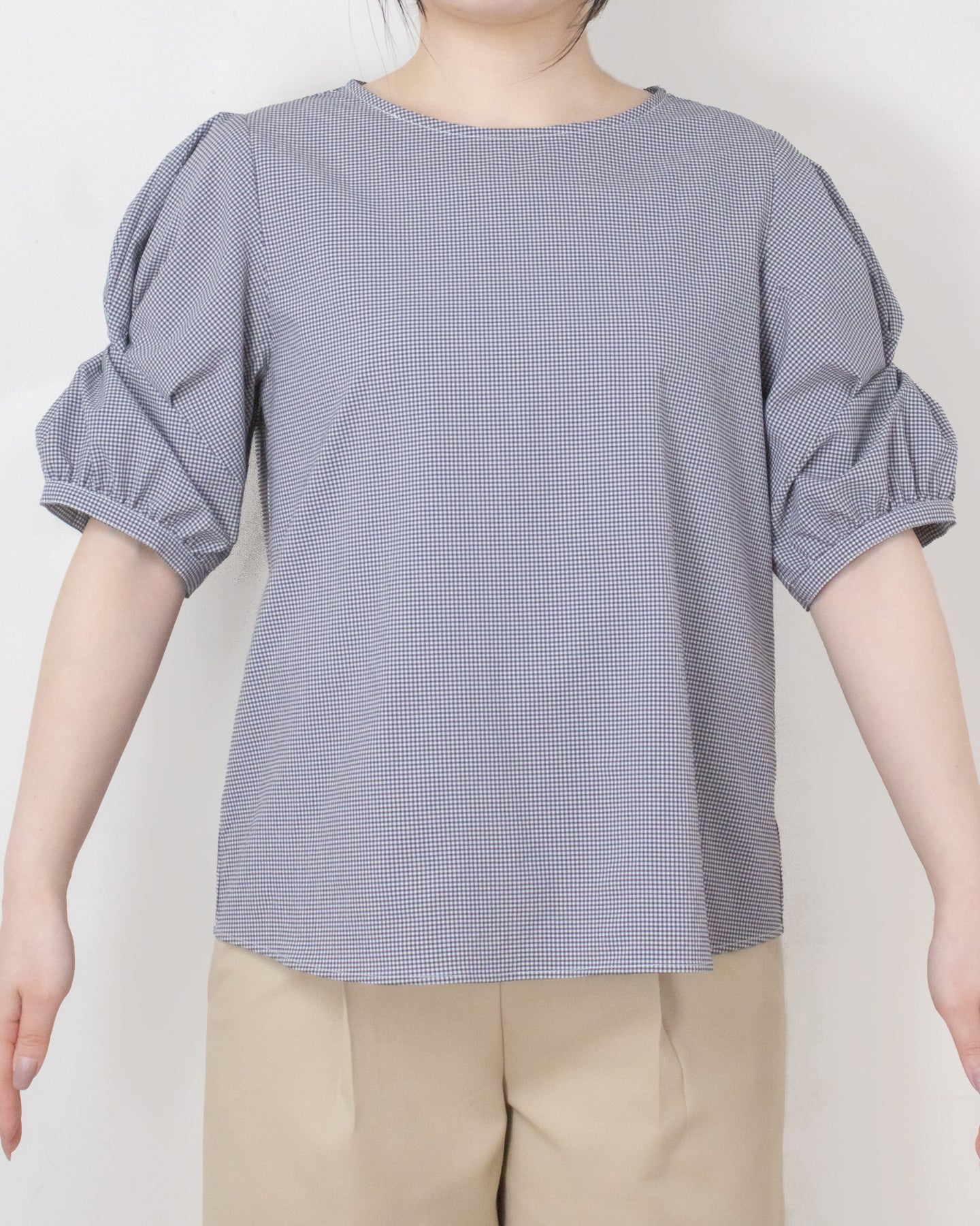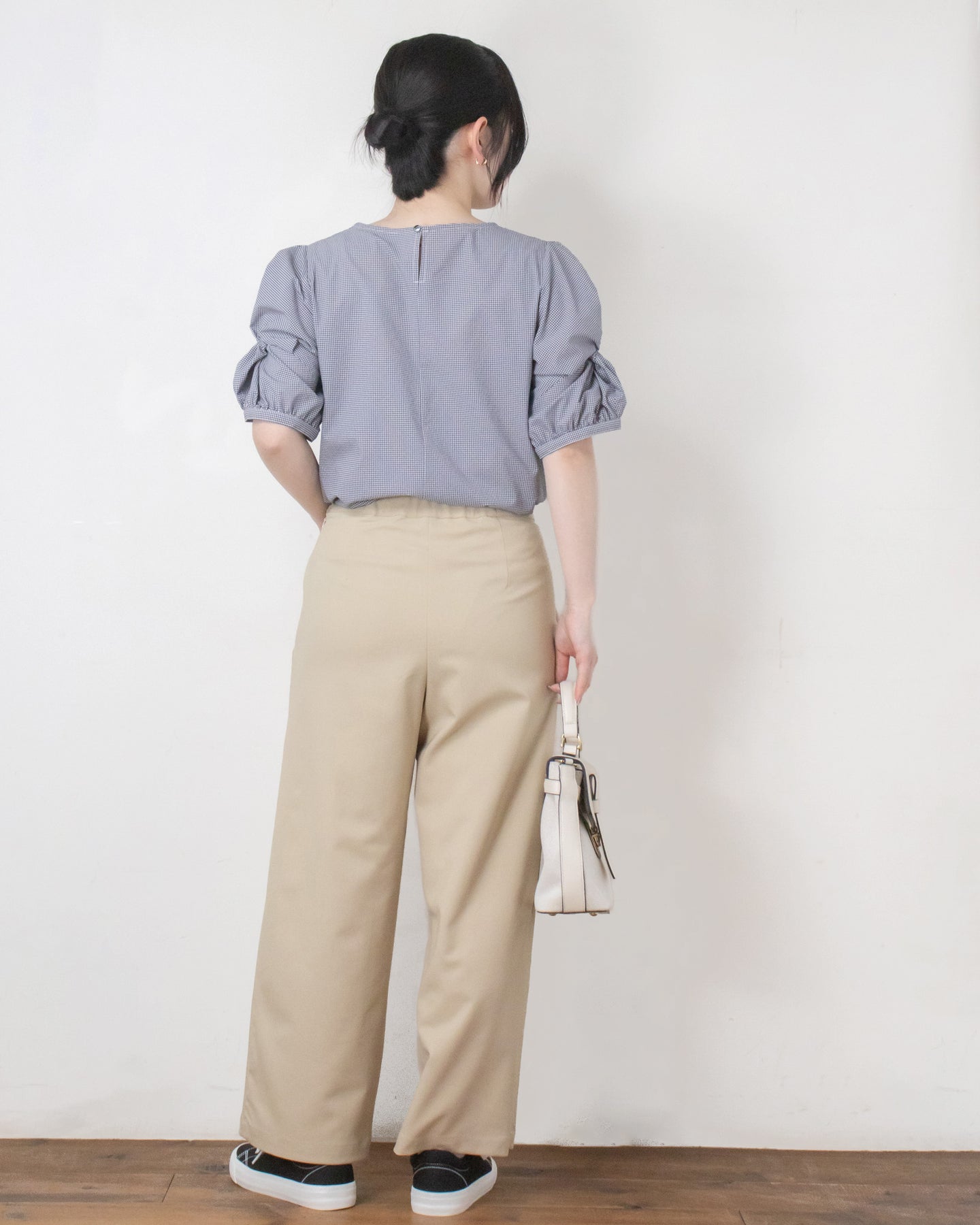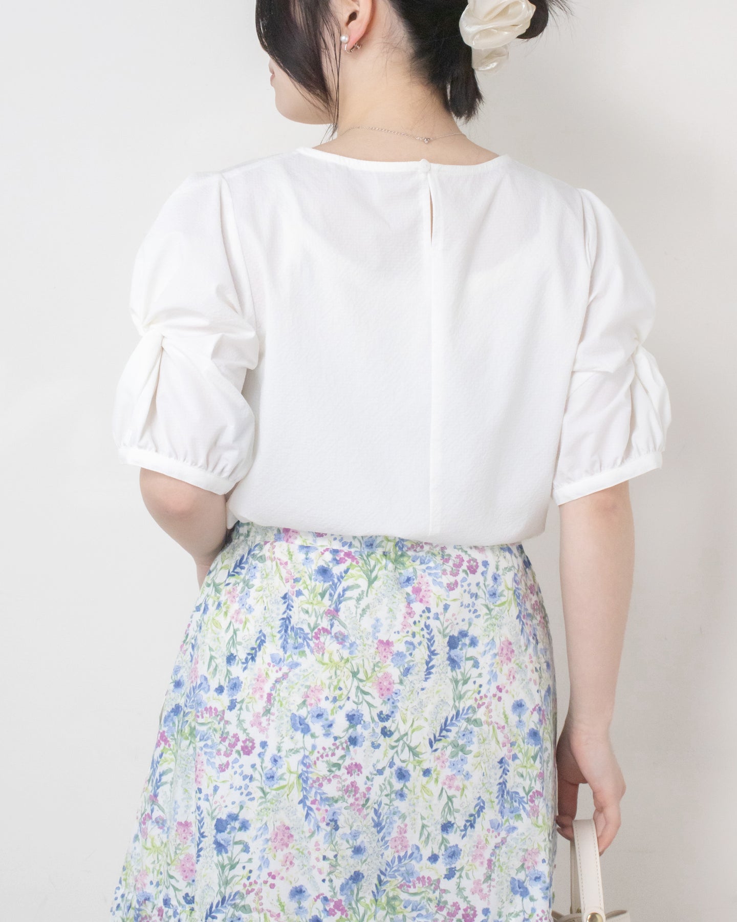 ■デザイン ねじりデザインの袖が目を引く、立体感のあるブラウス。 袖にはねじりに加えてタックやギャザーを組み合わせ、程よい丸みのあるシルエットに仕上げました。 ボリュームのある袖に対してカフスは細めにすることで、重たく見えないバランスに調整。 シンプルながら一枚で着映えするデザインです。 素材は吸汗速乾機能付きのドライタッチ素材を使用しており、暑い季節でもさらっと快適に着ていただけます。