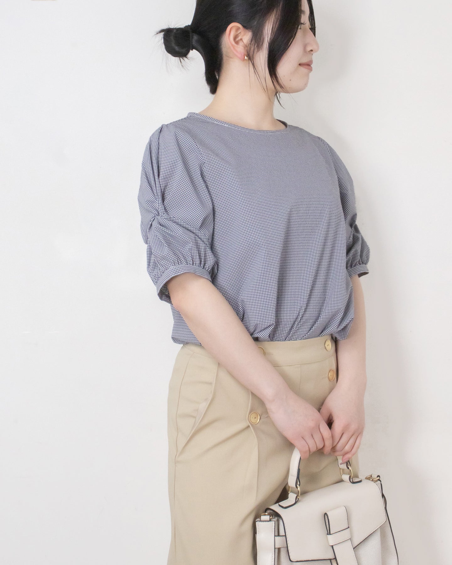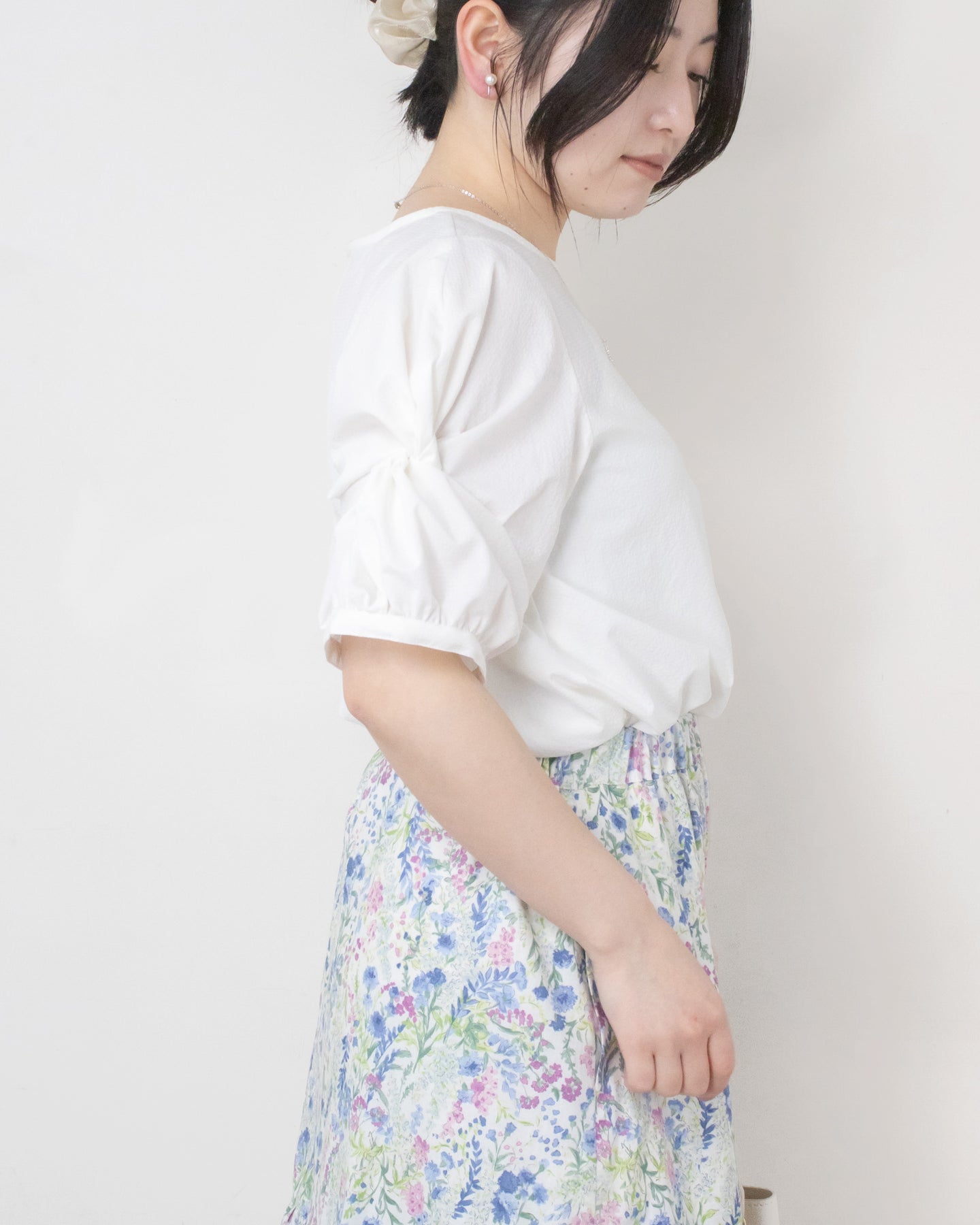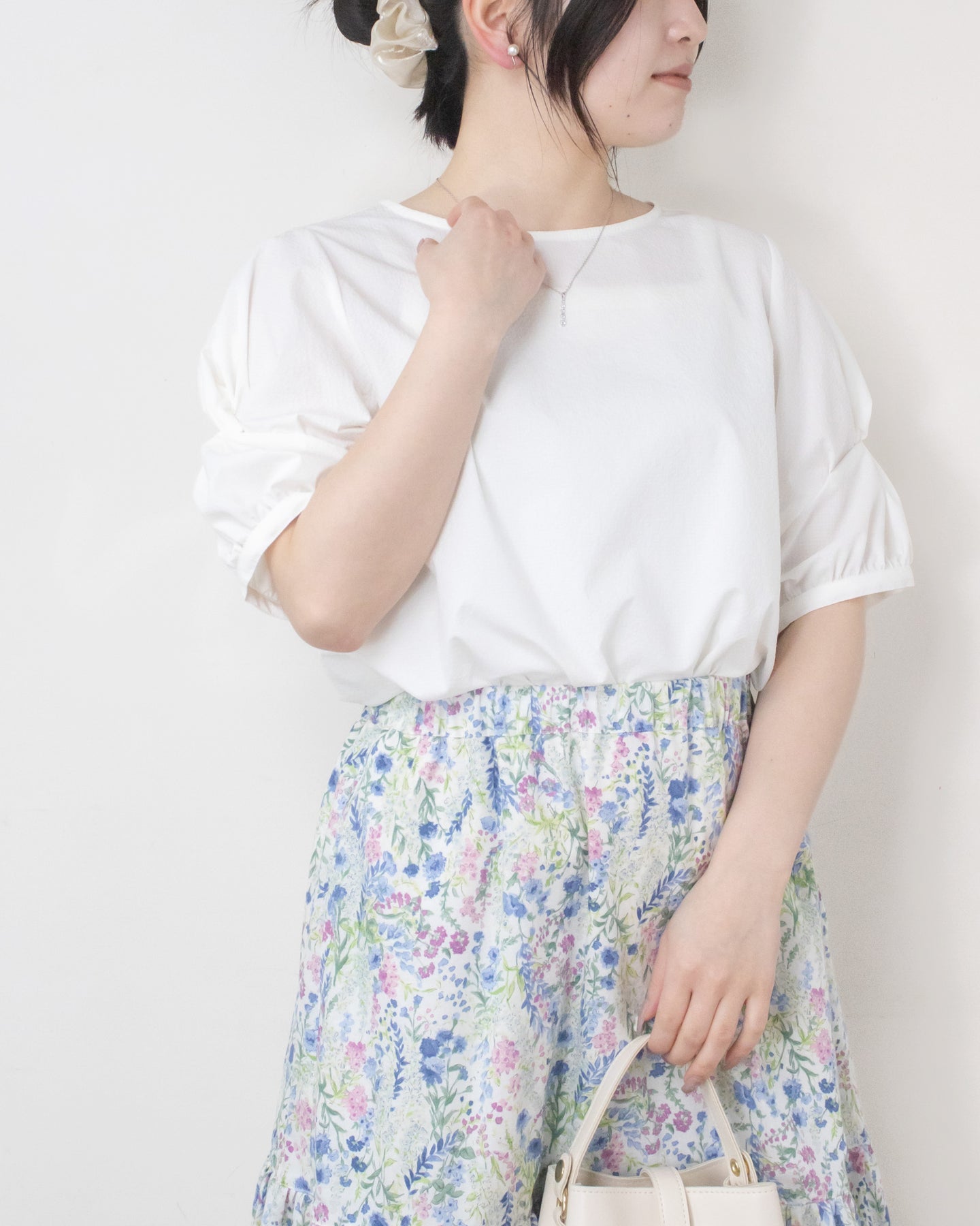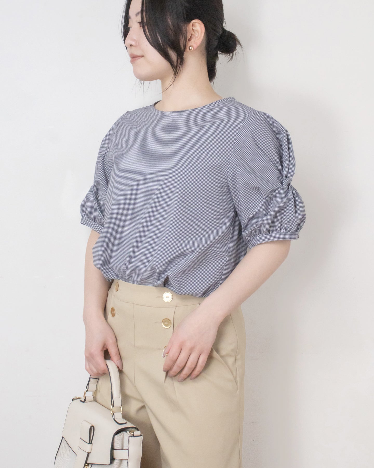 ■デザイン ねじりデザインの袖が目を引く、立体感のあるブラウス。 袖にはねじりに加えてタックやギャザーを組み合わせ、程よい丸みのあるシルエットに仕上げました。 ボリュームのある袖に対してカフスは細めにすることで、重たく見えないバランスに調整。 シンプルながら一枚で着映えするデザインです。 素材は吸汗速乾機能付きのドライタッチ素材を使用しており、暑い季節でもさらっと快適に着ていただけます。