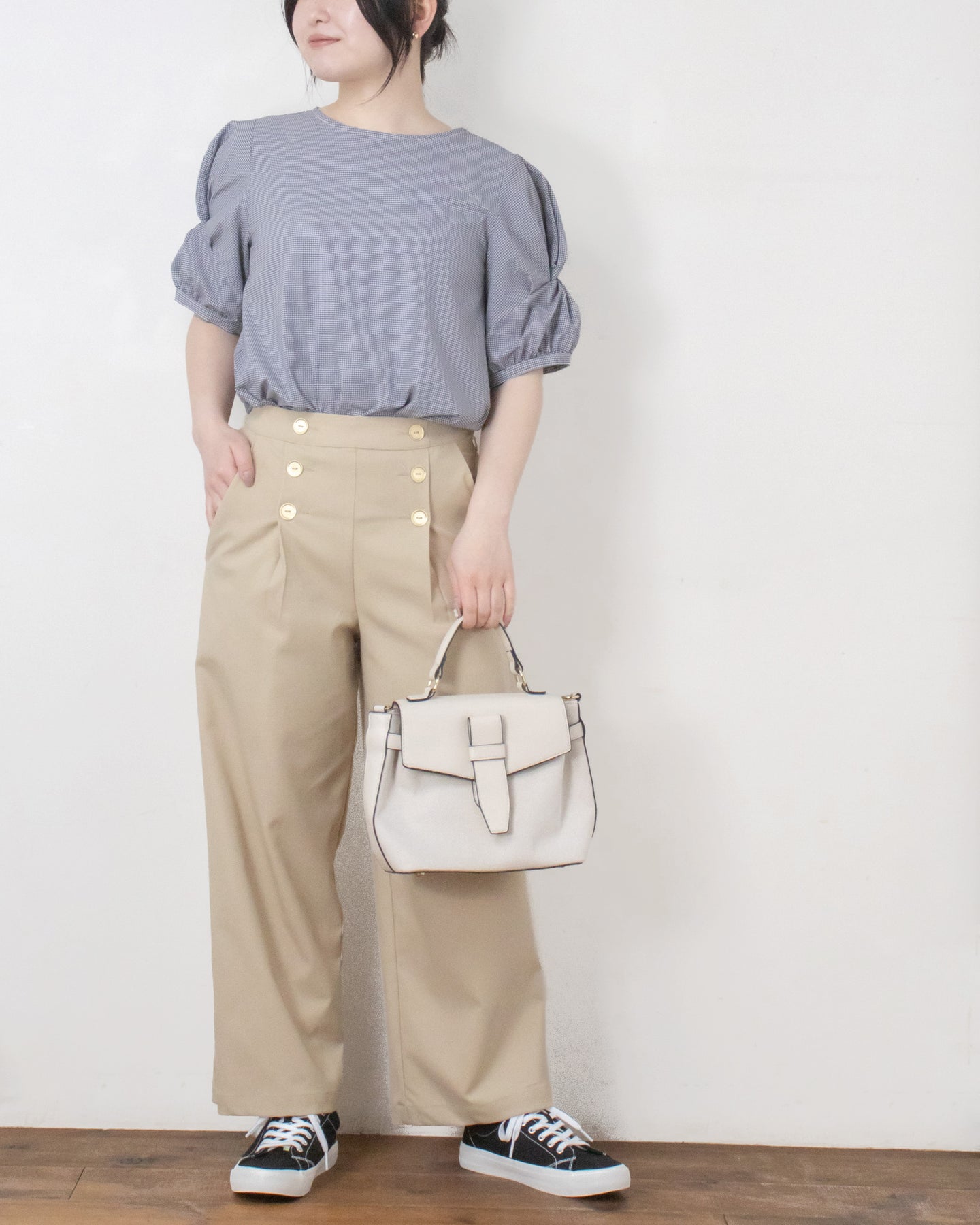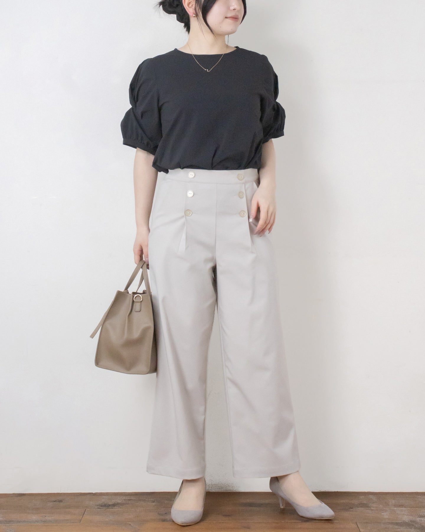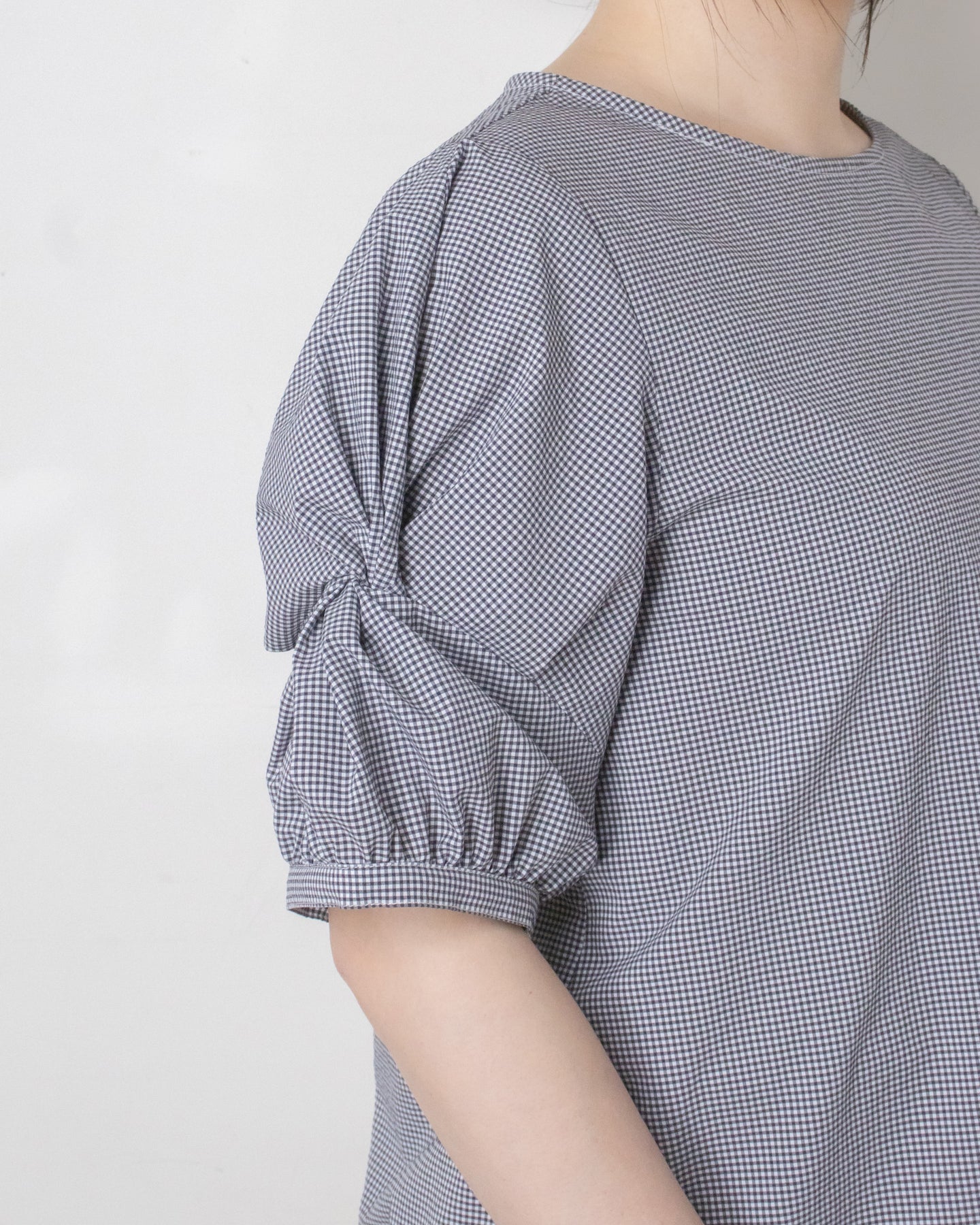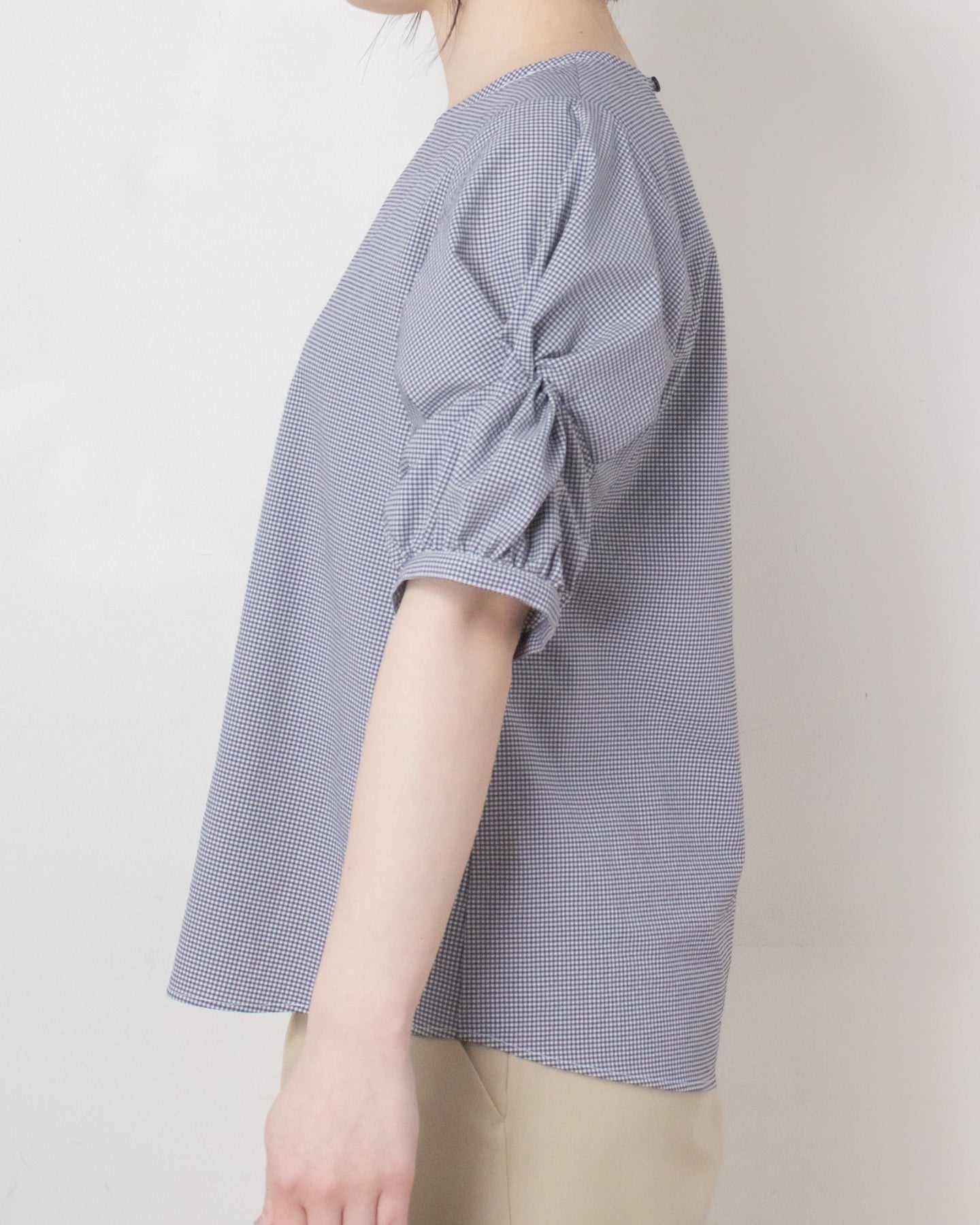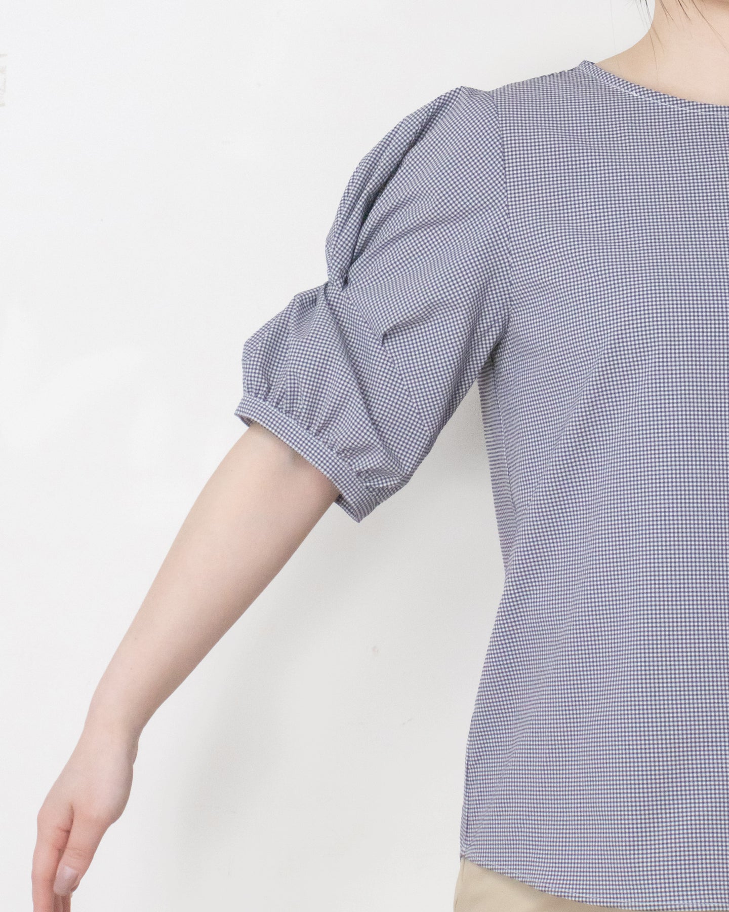 ■デザイン ねじりデザインの袖が目を引く、立体感のあるブラウス。 袖にはねじりに加えてタックやギャザーを組み合わせ、程よい丸みのあるシルエットに仕上げました。 ボリュームのある袖に対してカフスは細めにすることで、重たく見えないバランスに調整。 シンプルながら一枚で着映えするデザインです。 素材は吸汗速乾機能付きのドライタッチ素材を使用しており、暑い季節でもさらっと快適に着ていただけます。