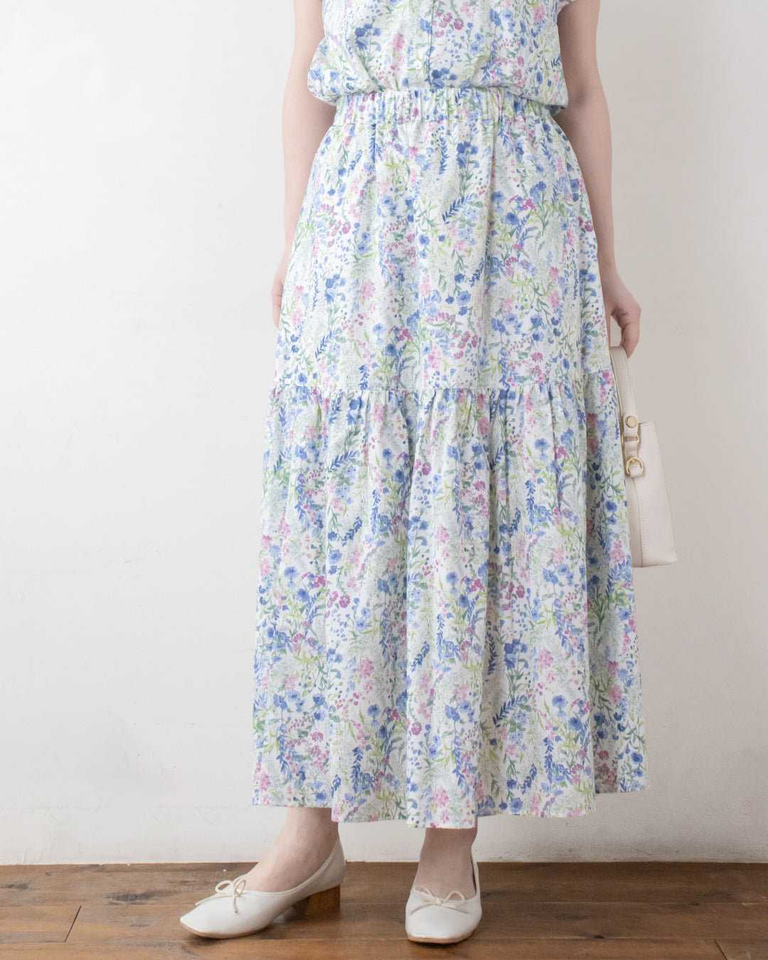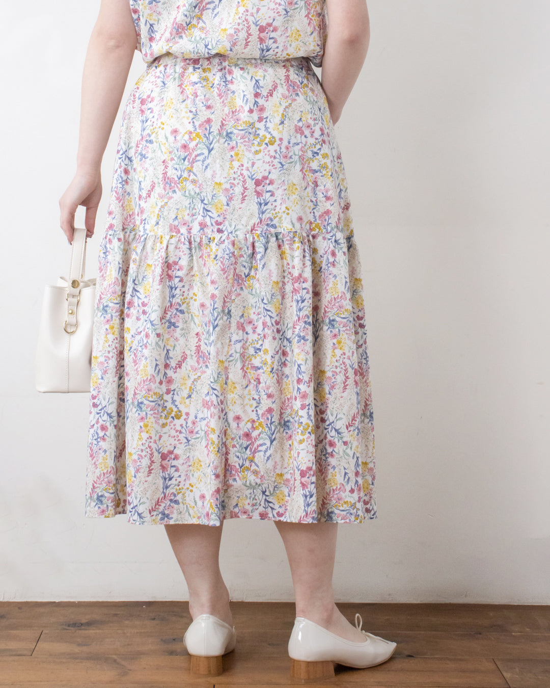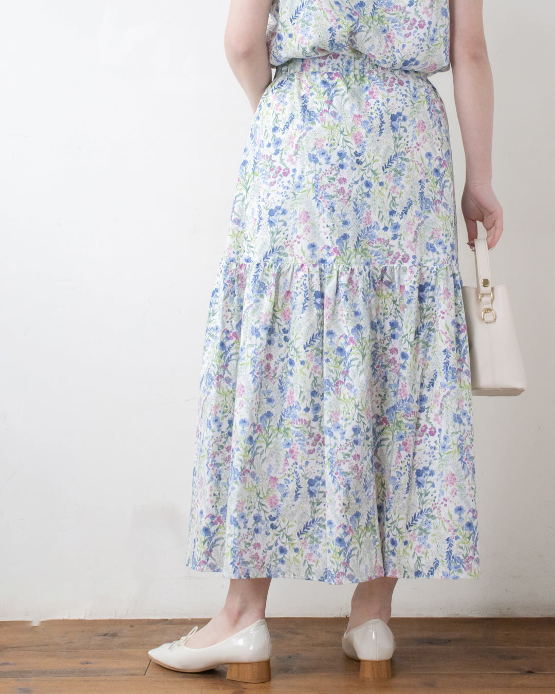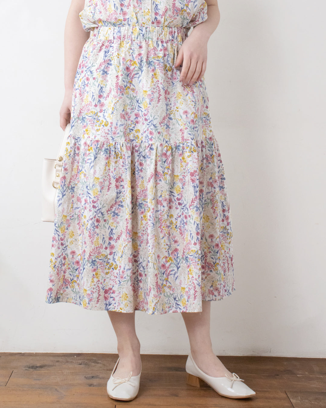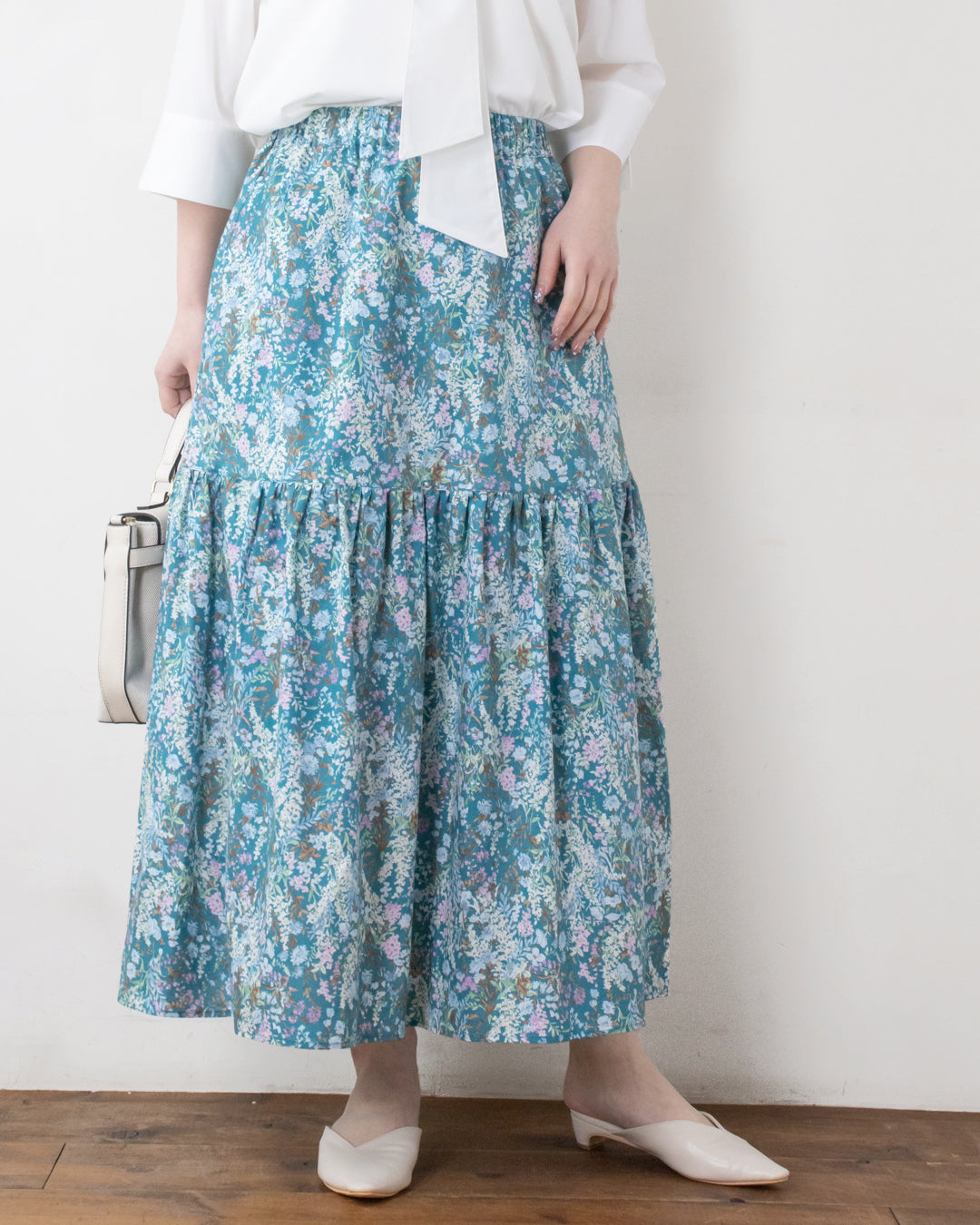 ■デザイン 大人が着やすい水彩画タッチの花柄が魅力のティアードスカート。 通気性の良いコットン素材で、暑い季節も涼しく快適に着用できます。 ギャザーをたっぷり入れたティアードデザインが動くたびに軽やかに揺れ、コーディネートの主役に。 同素材の綿花柄フレンチスリーブブラウスとセットアップでの着用もおすすめ。 ショートとトールの2丈展開で、好みのバランスが選べます。