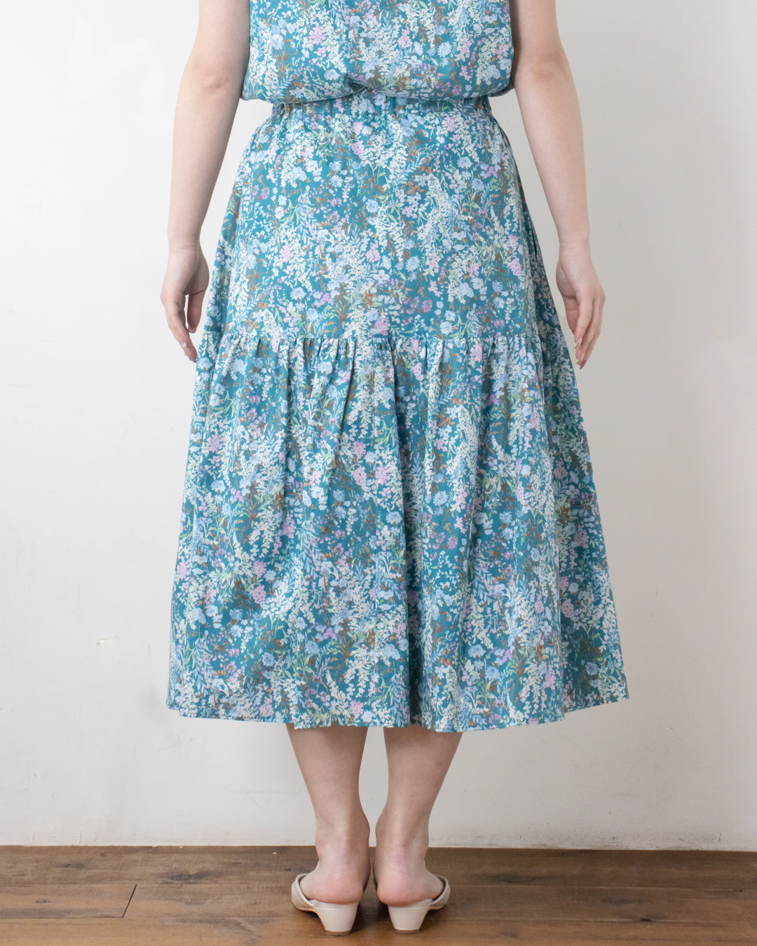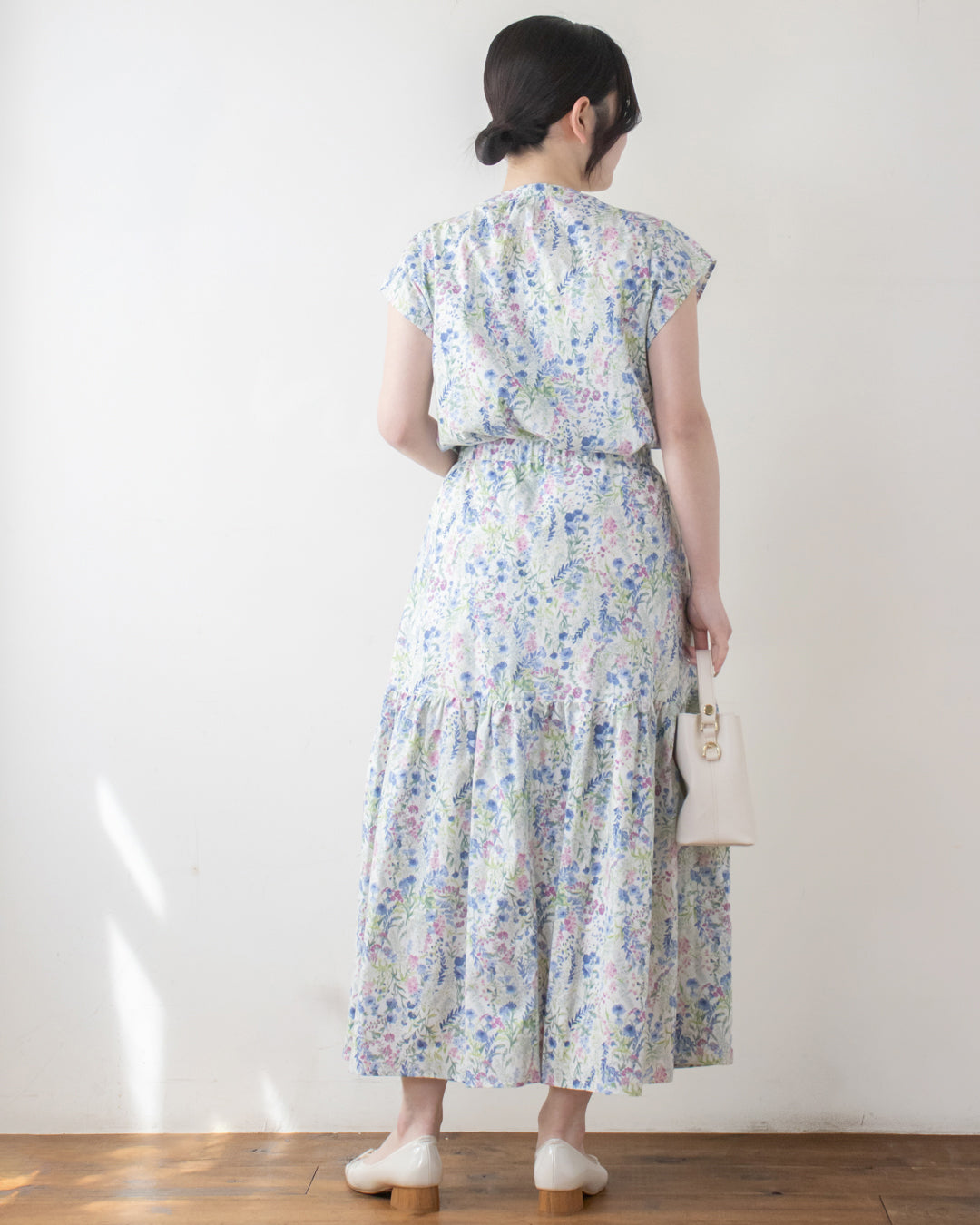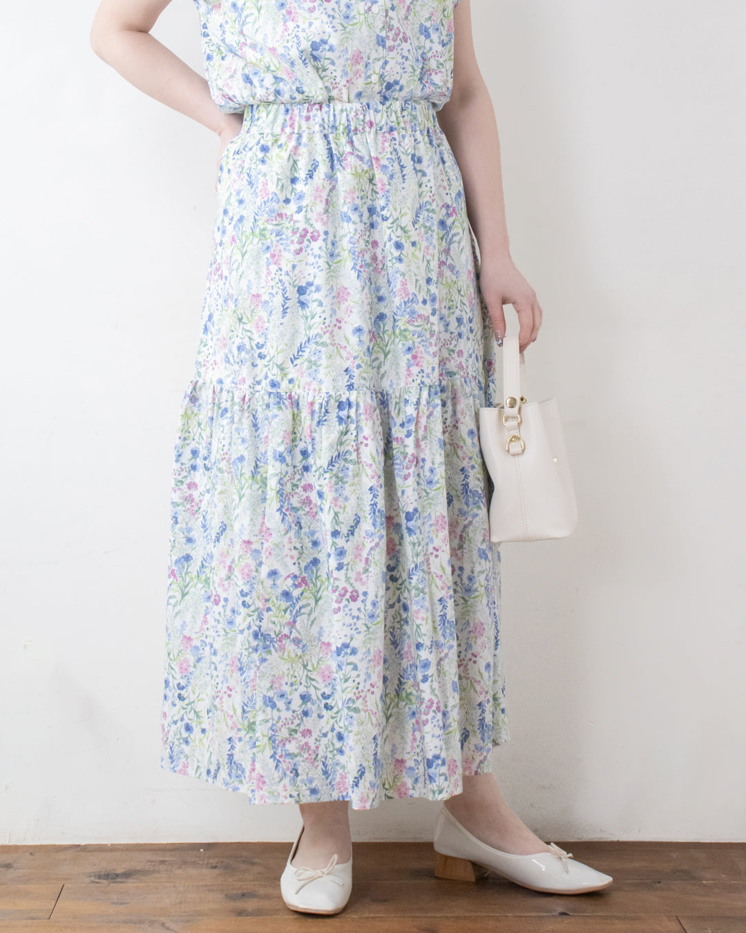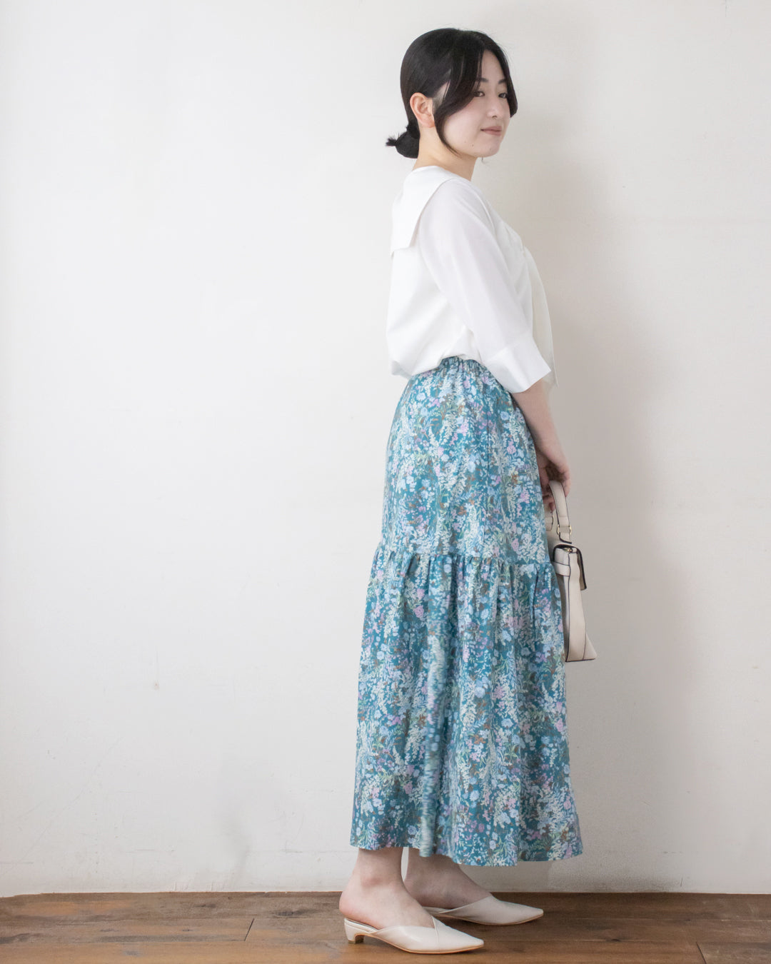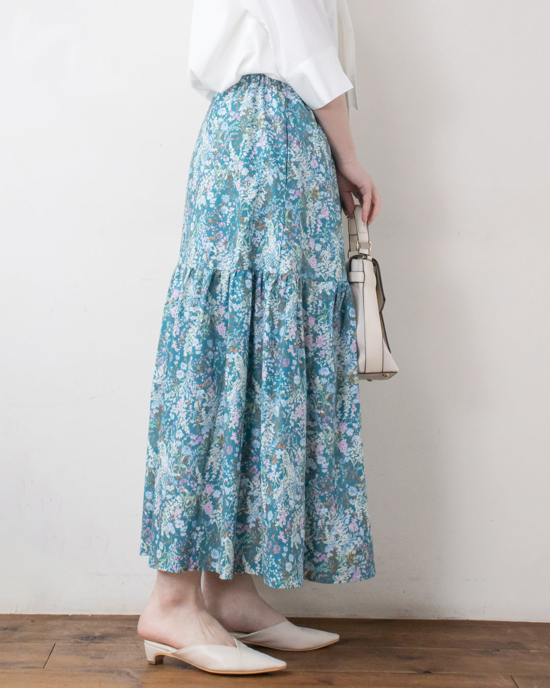 ■デザイン 大人が着やすい水彩画タッチの花柄が魅力のティアードスカート。 通気性の良いコットン素材で、暑い季節も涼しく快適に着用できます。 ギャザーをたっぷり入れたティアードデザインが動くたびに軽やかに揺れ、コーディネートの主役に。 同素材の綿花柄フレンチスリーブブラウスとセットアップでの着用もおすすめ。 ショートとトールの2丈展開で、好みのバランスが選べます。