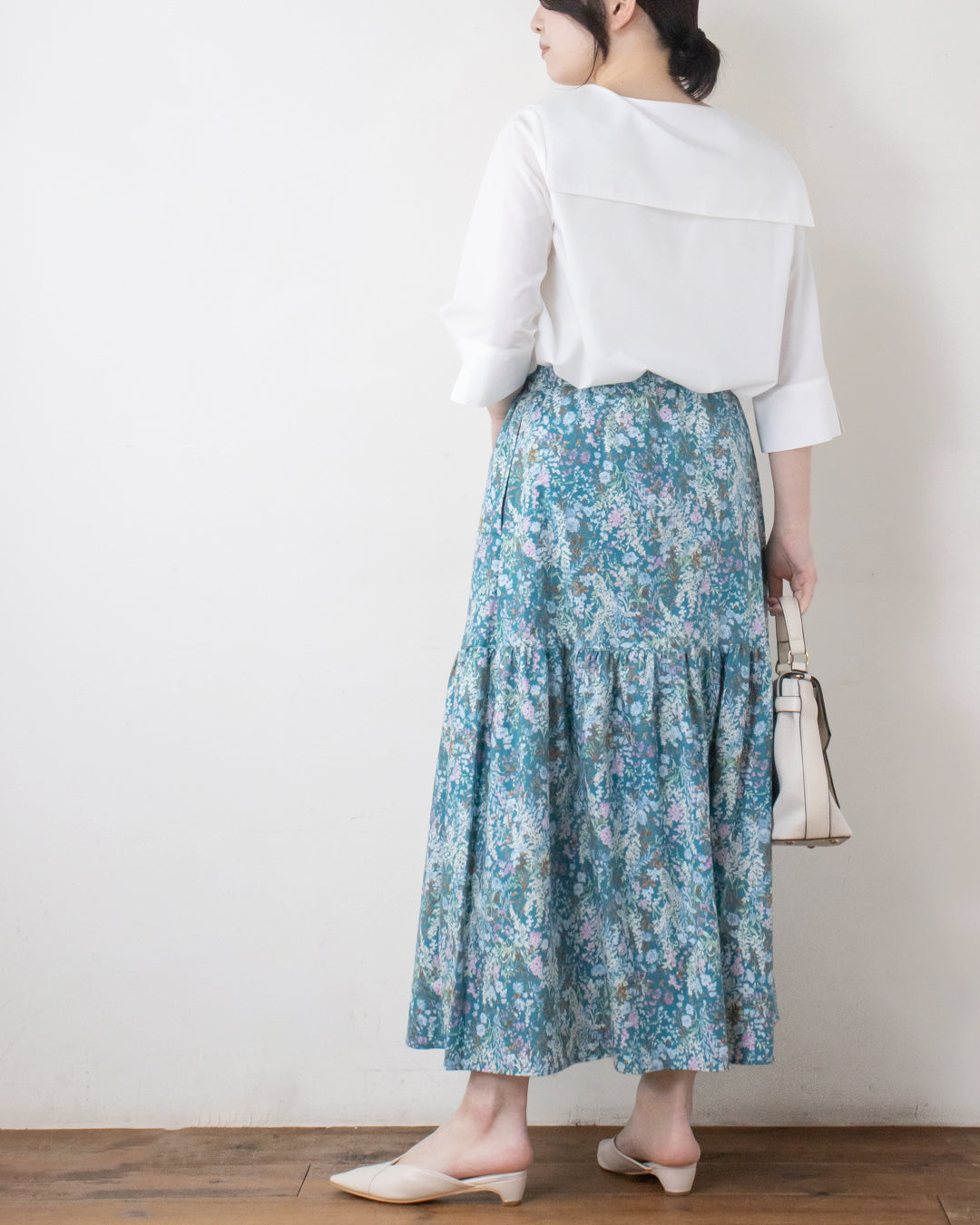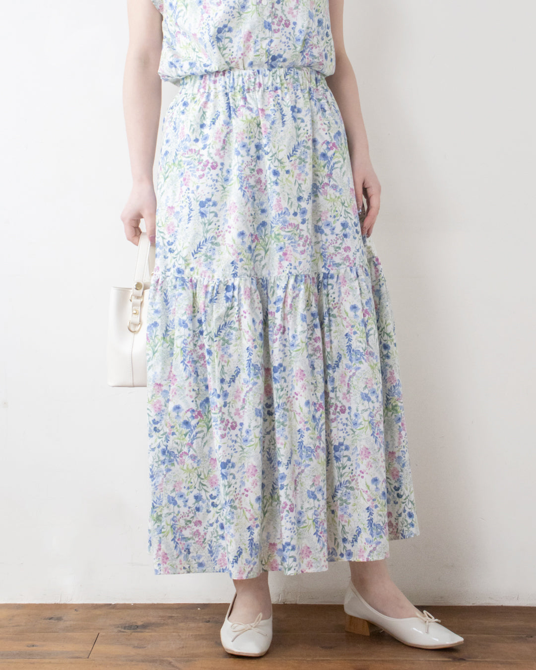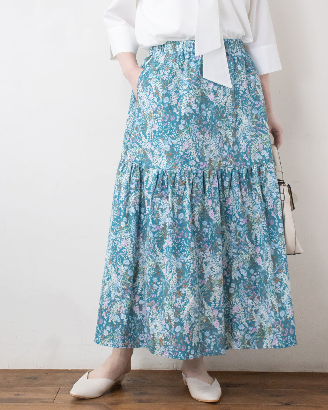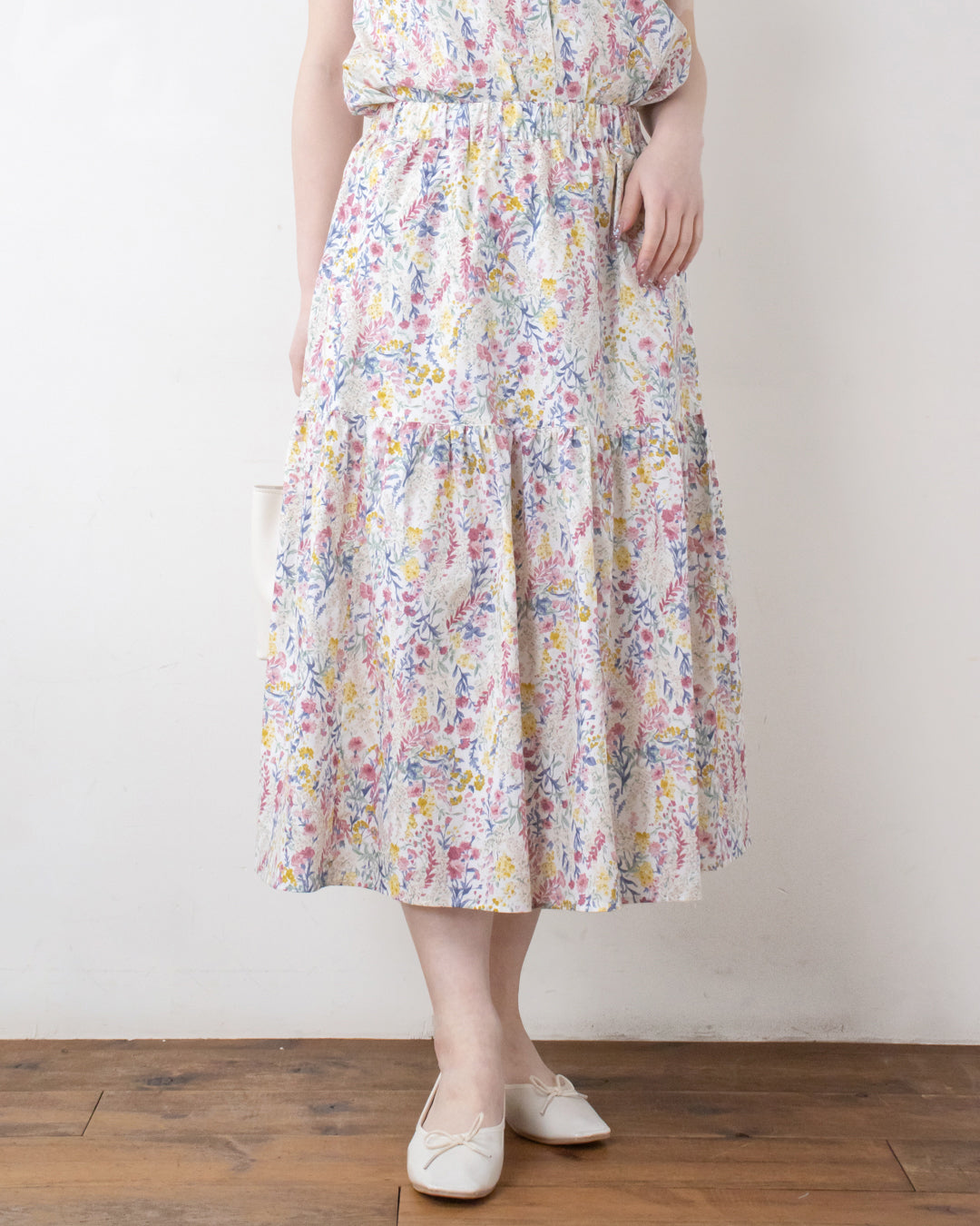■デザイン 大人が着やすい水彩画タッチの花柄が魅力のティアードスカート。 通気性の良いコットン素材で、暑い季節も涼しく快適に着用できます。 ギャザーをたっぷり入れたティアードデザインが動くたびに軽やかに揺れ、コーディネートの主役に。 同素材の綿花柄フレンチスリーブブラウスとセットアップでの着用もおすすめ。 ショートとトールの2丈展開で、好みのバランスが選べます。