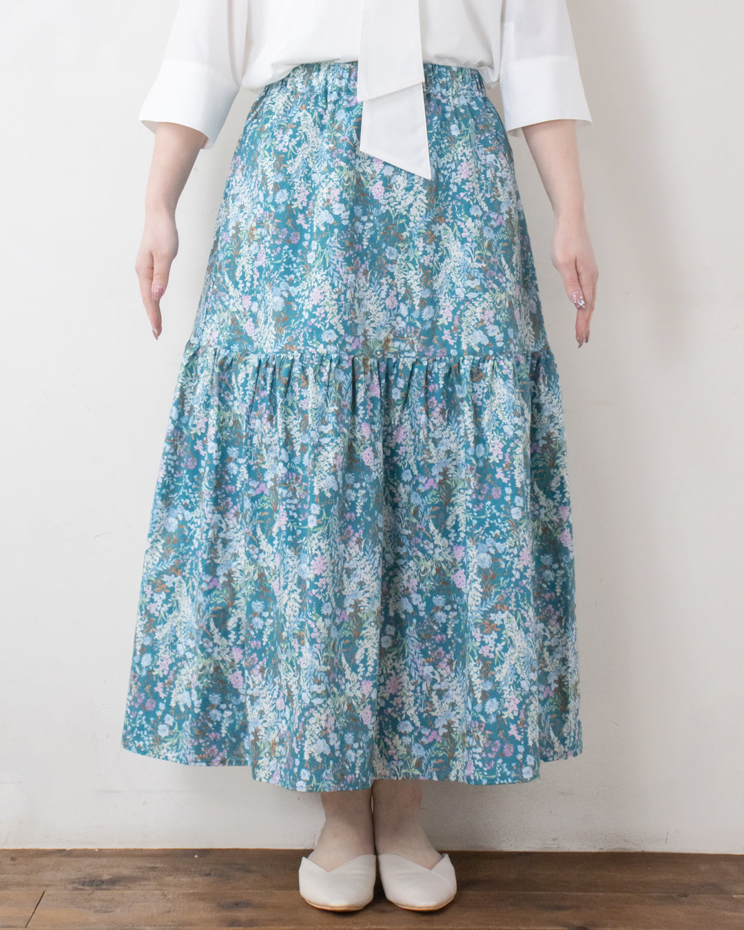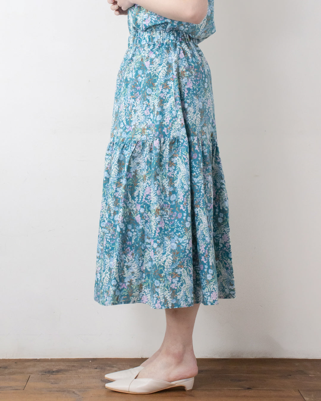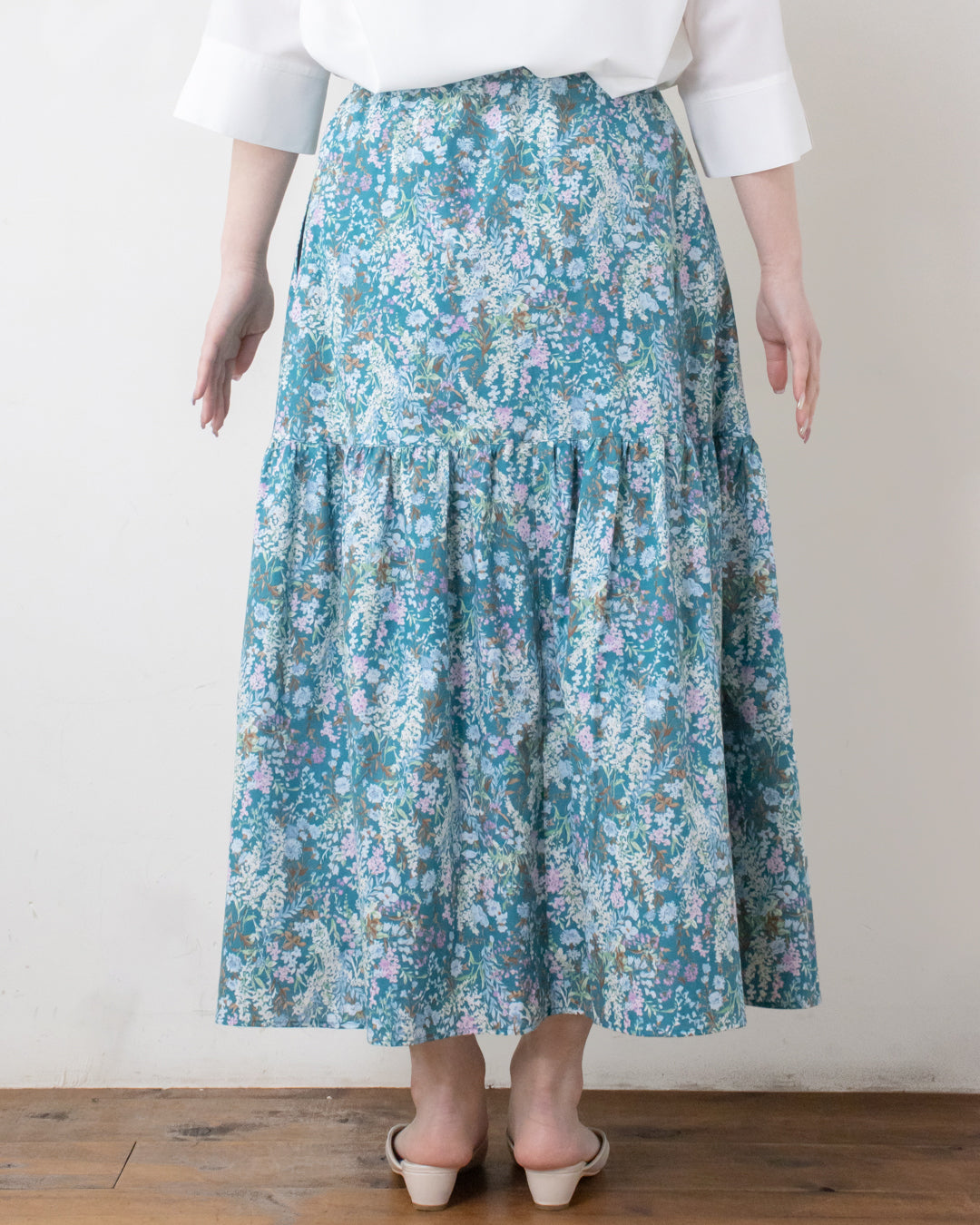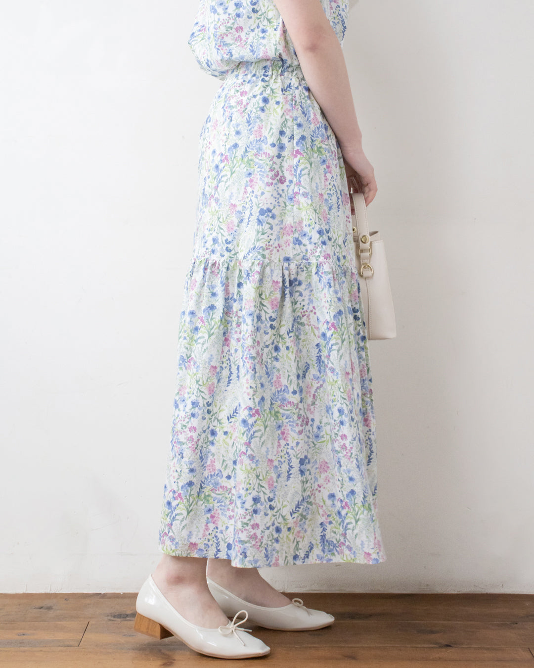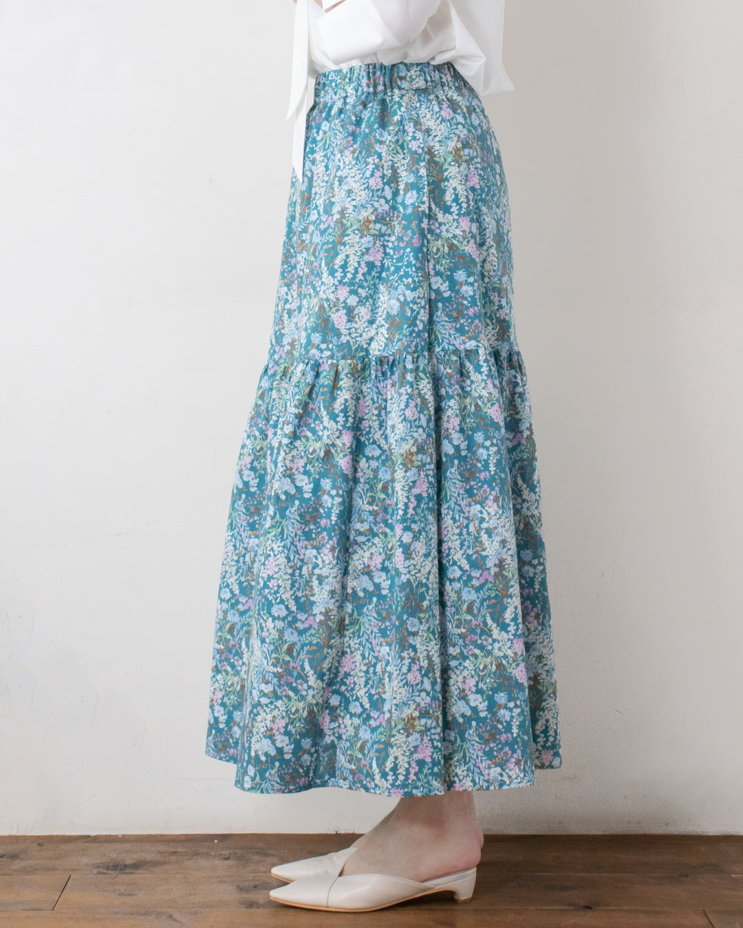 ■デザイン 大人が着やすい水彩画タッチの花柄が魅力のティアードスカート。 通気性の良いコットン素材で、暑い季節も涼しく快適に着用できます。 ギャザーをたっぷり入れたティアードデザインが動くたびに軽やかに揺れ、コーディネートの主役に。 同素材の綿花柄フレンチスリーブブラウスとセットアップでの着用もおすすめ。 ショートとトールの2丈展開で、好みのバランスが選べます。