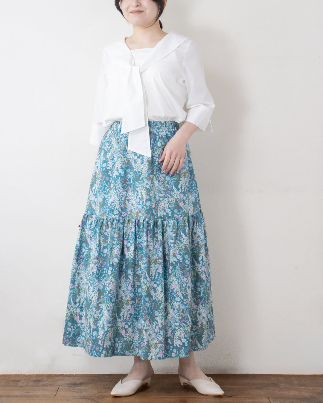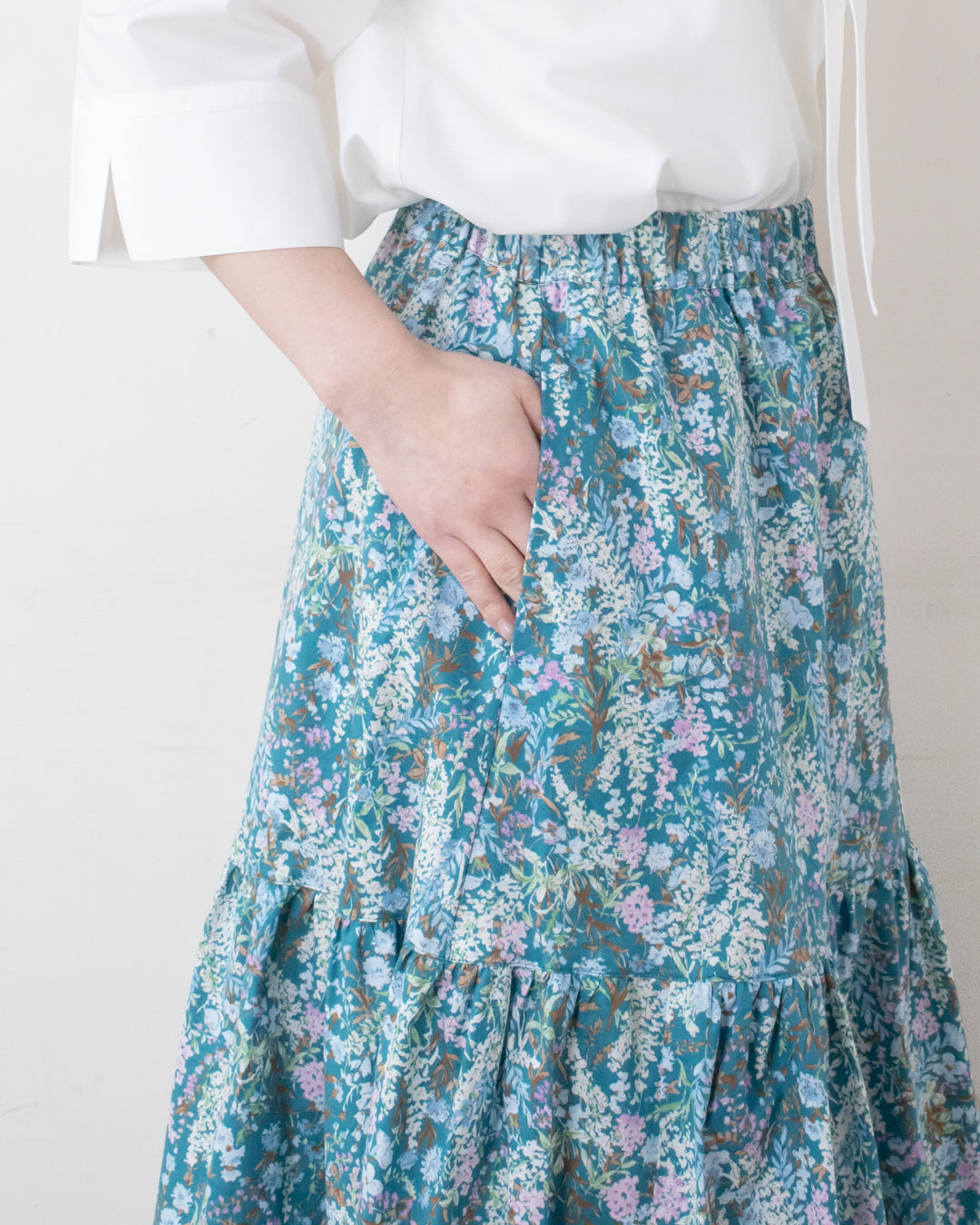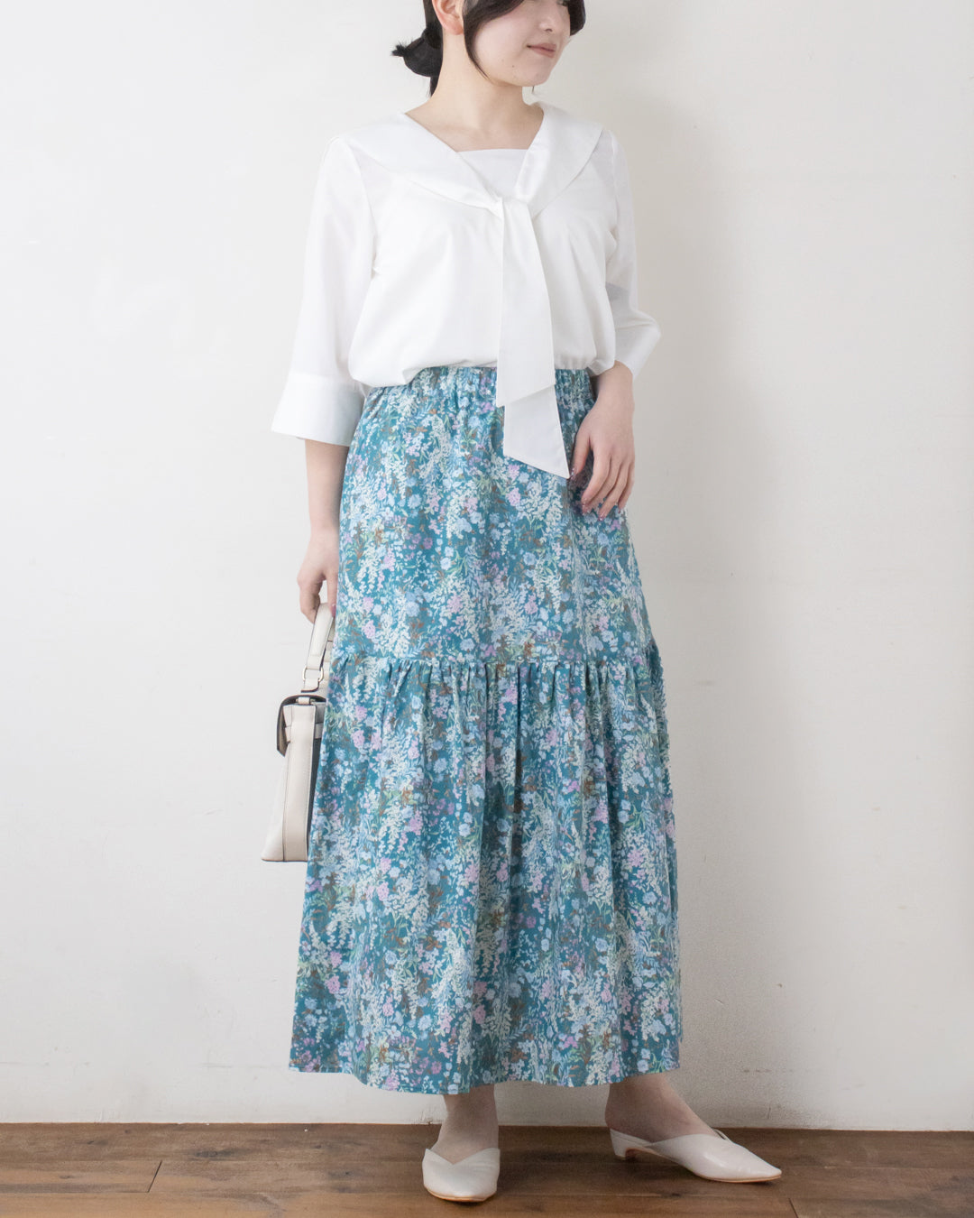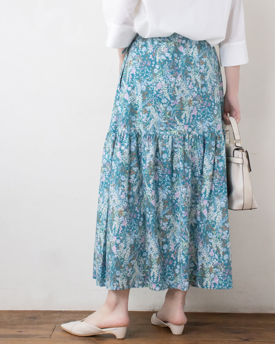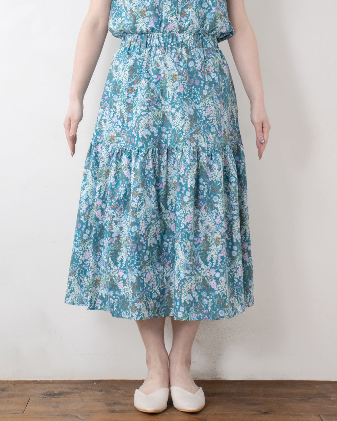 ■デザイン 大人が着やすい水彩画タッチの花柄が魅力のティアードスカート。 通気性の良いコットン素材で、暑い季節も涼しく快適に着用できます。 ギャザーをたっぷり入れたティアードデザインが動くたびに軽やかに揺れ、コーディネートの主役に。 同素材の綿花柄フレンチスリーブブラウスとセットアップでの着用もおすすめ。 ショートとトールの2丈展開で、好みのバランスが選べます。