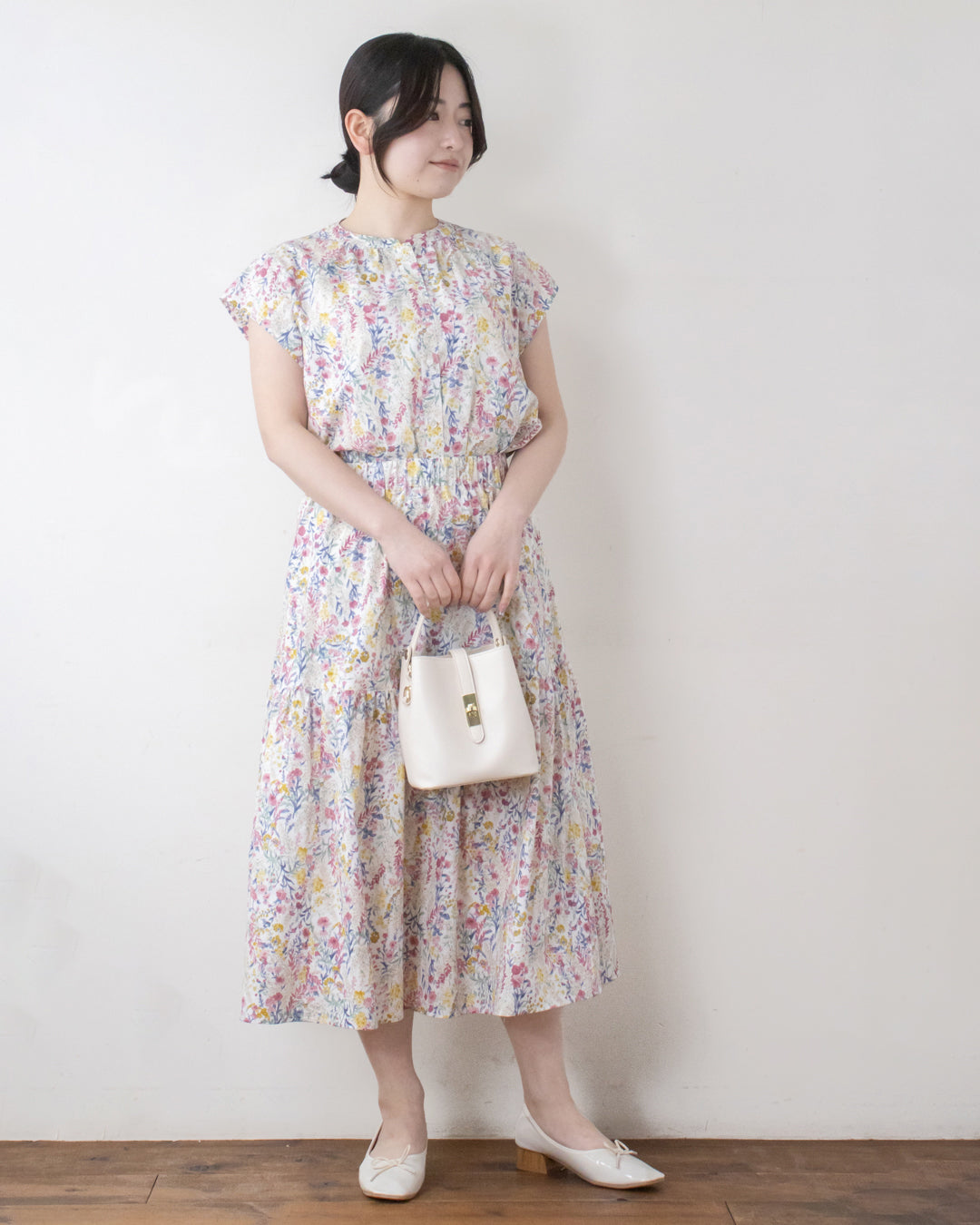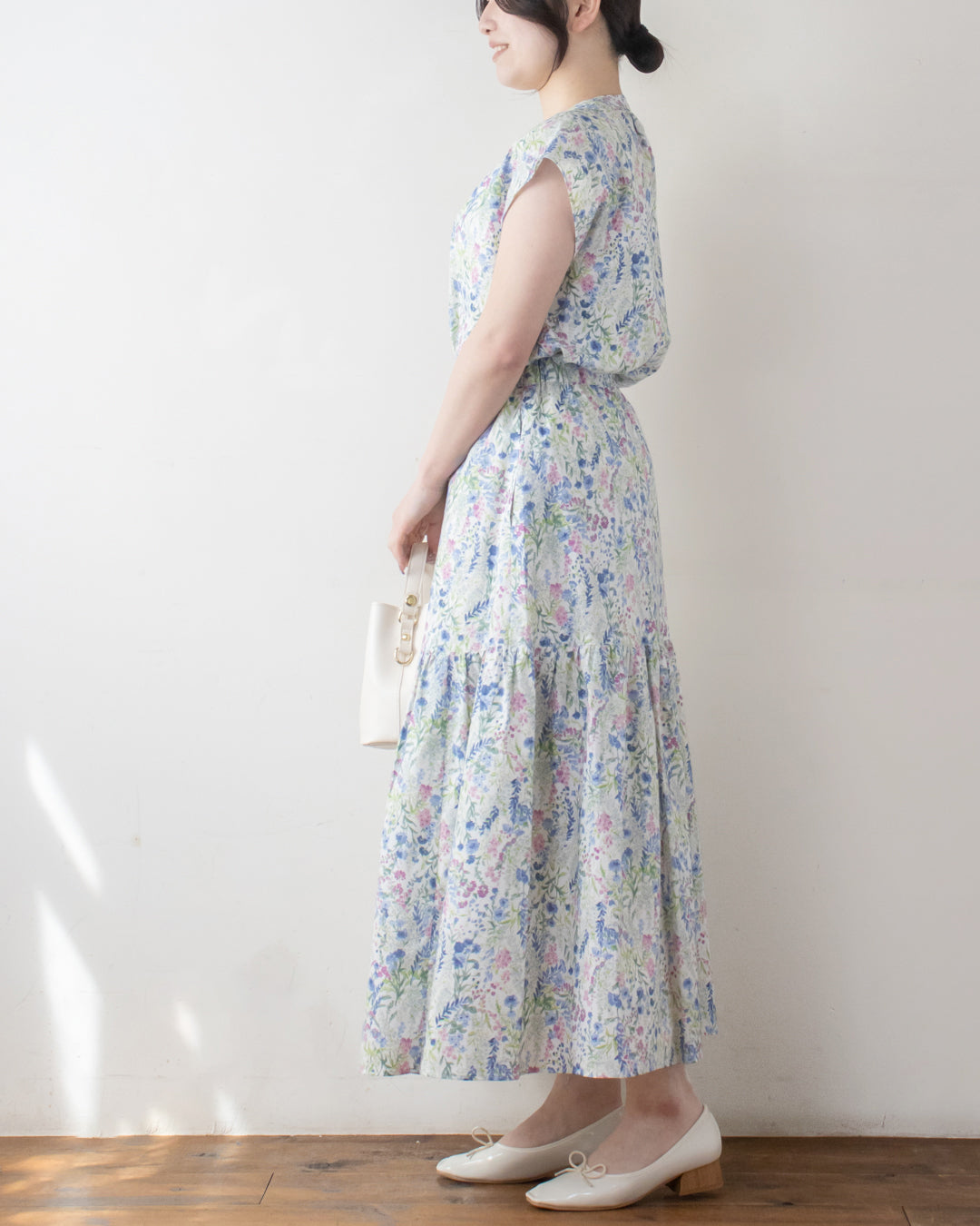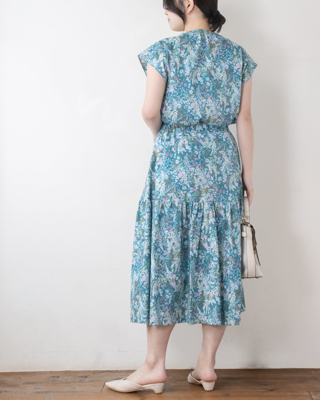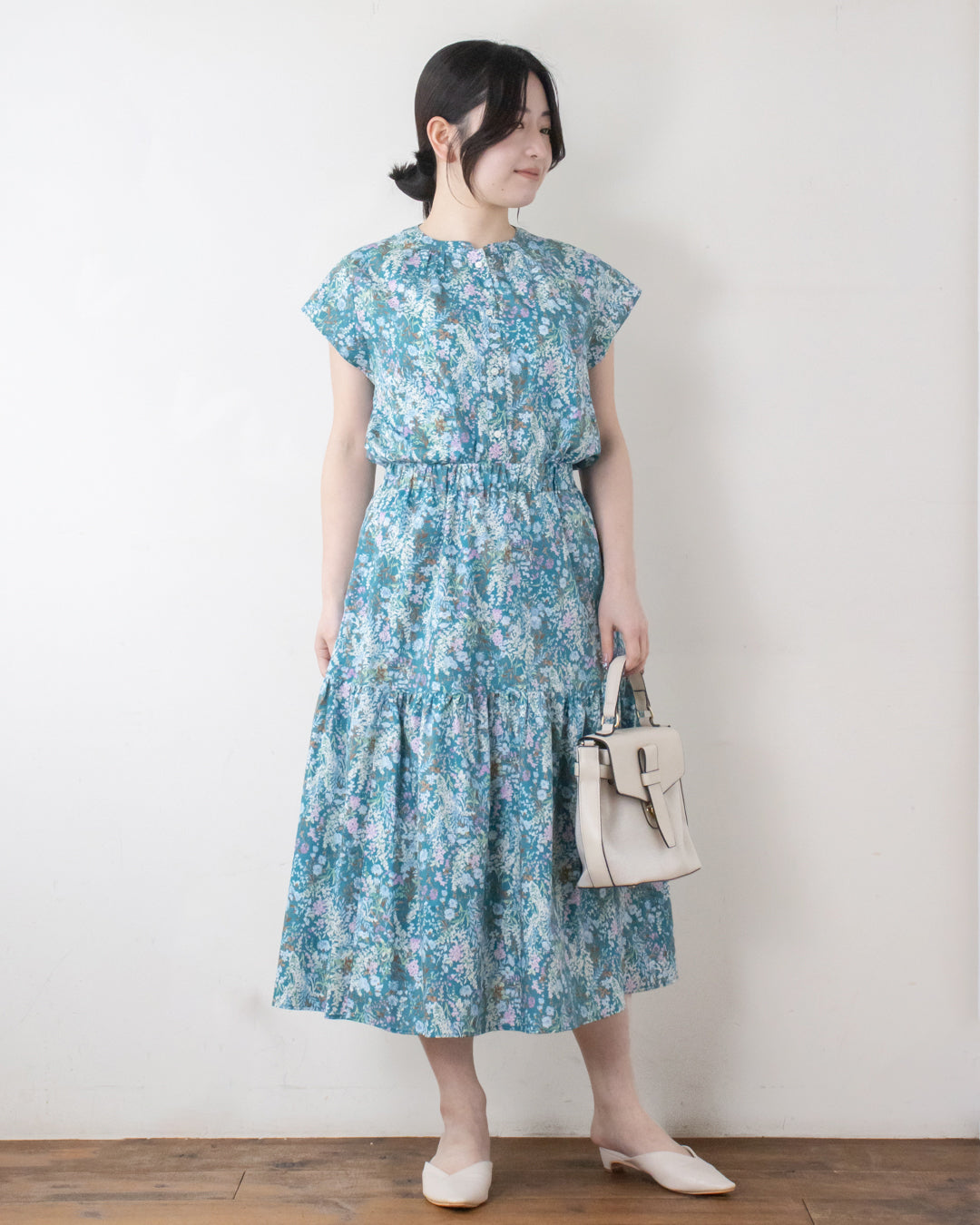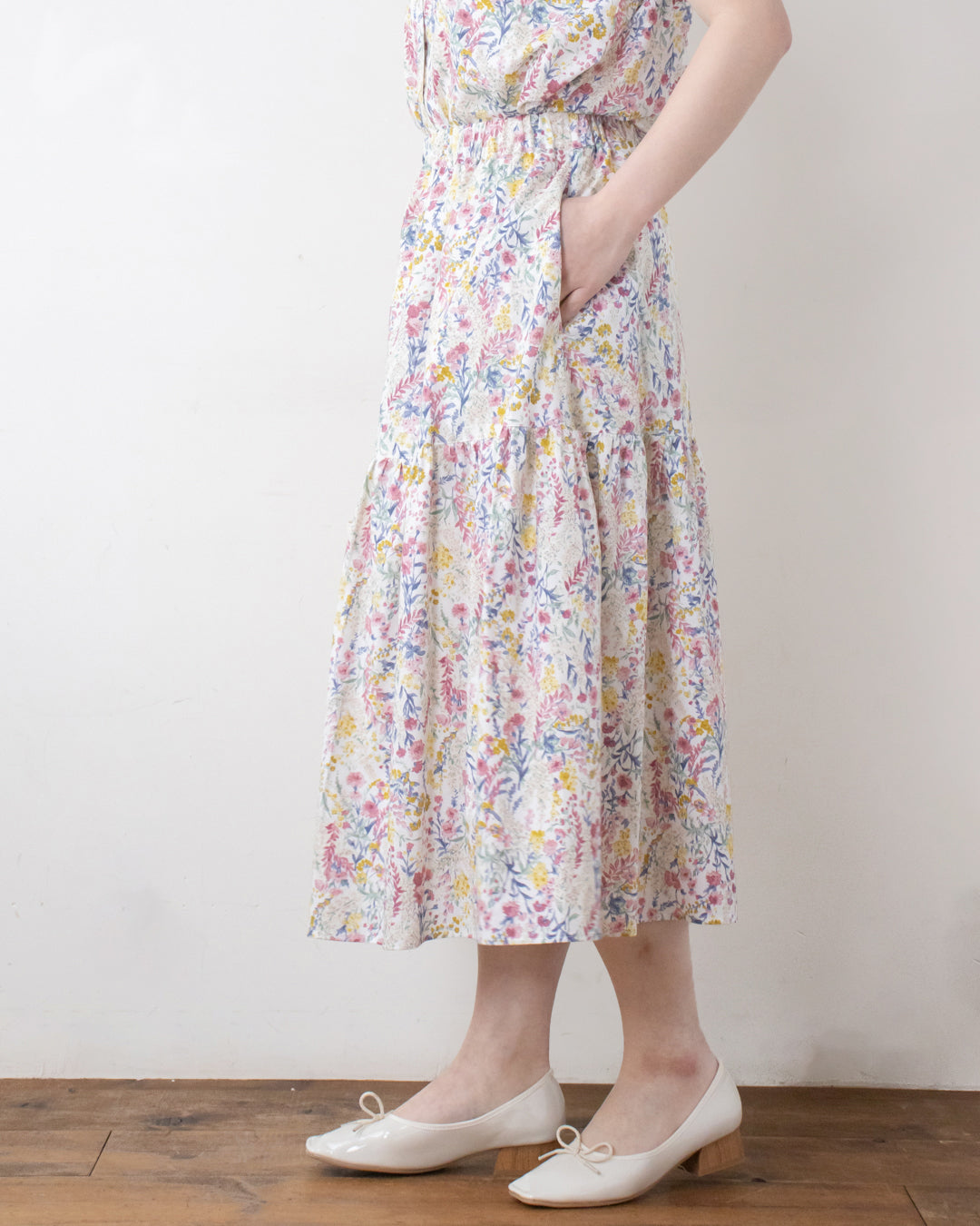 ■デザイン 大人が着やすい水彩画タッチの花柄が魅力のティアードスカート。 通気性の良いコットン素材で、暑い季節も涼しく快適に着用できます。 ギャザーをたっぷり入れたティアードデザインが動くたびに軽やかに揺れ、コーディネートの主役に。 同素材の綿花柄フレンチスリーブブラウスとセットアップでの着用もおすすめ。 ショートとトールの2丈展開で、好みのバランスが選べます。