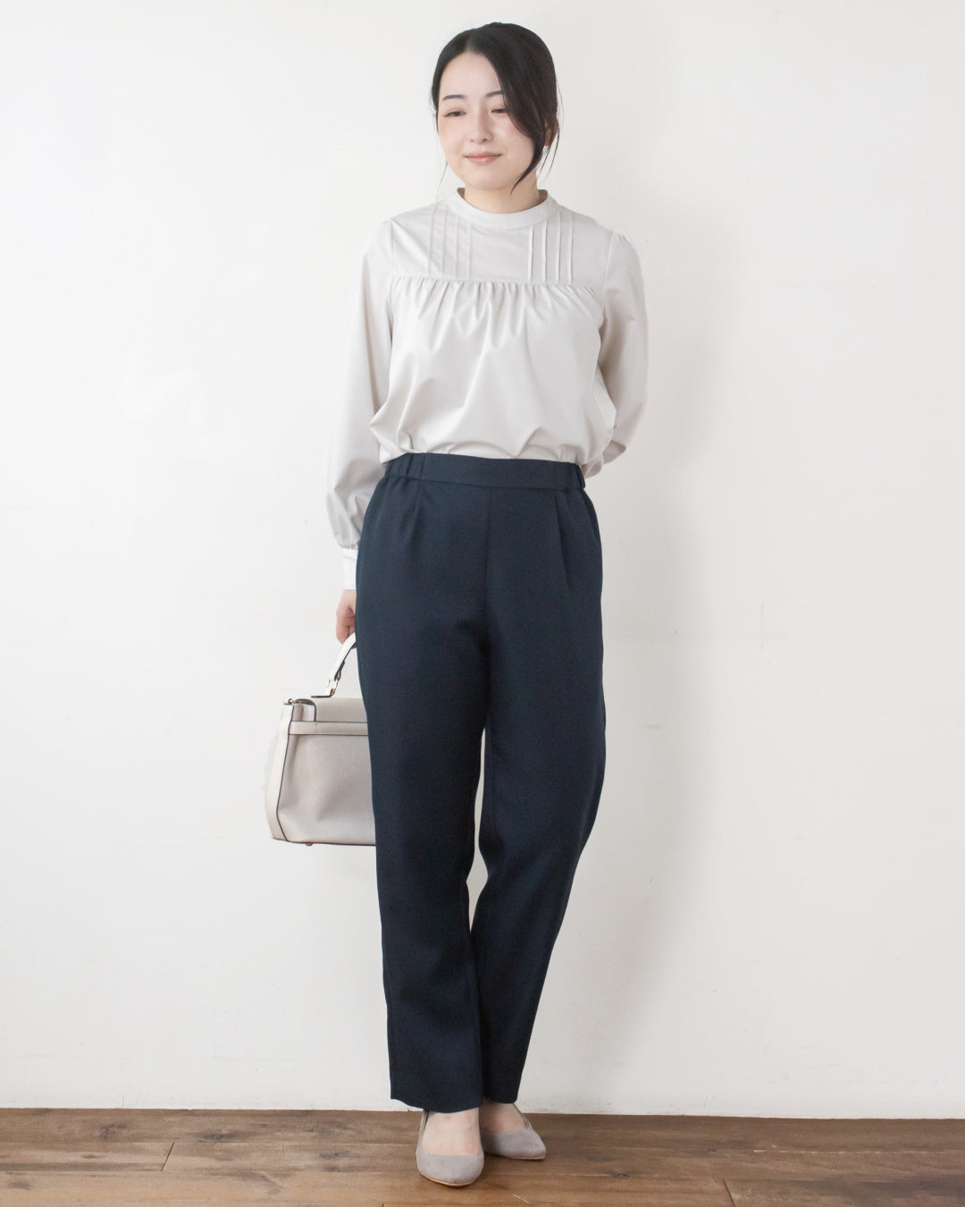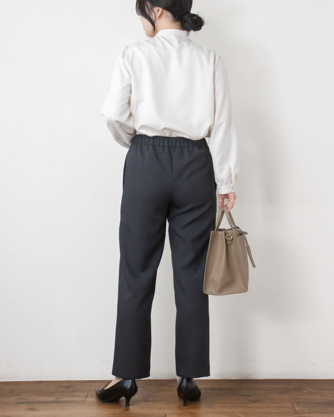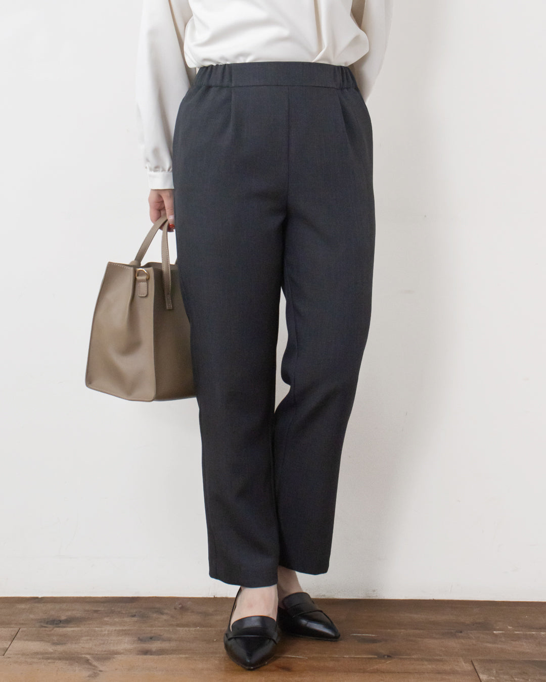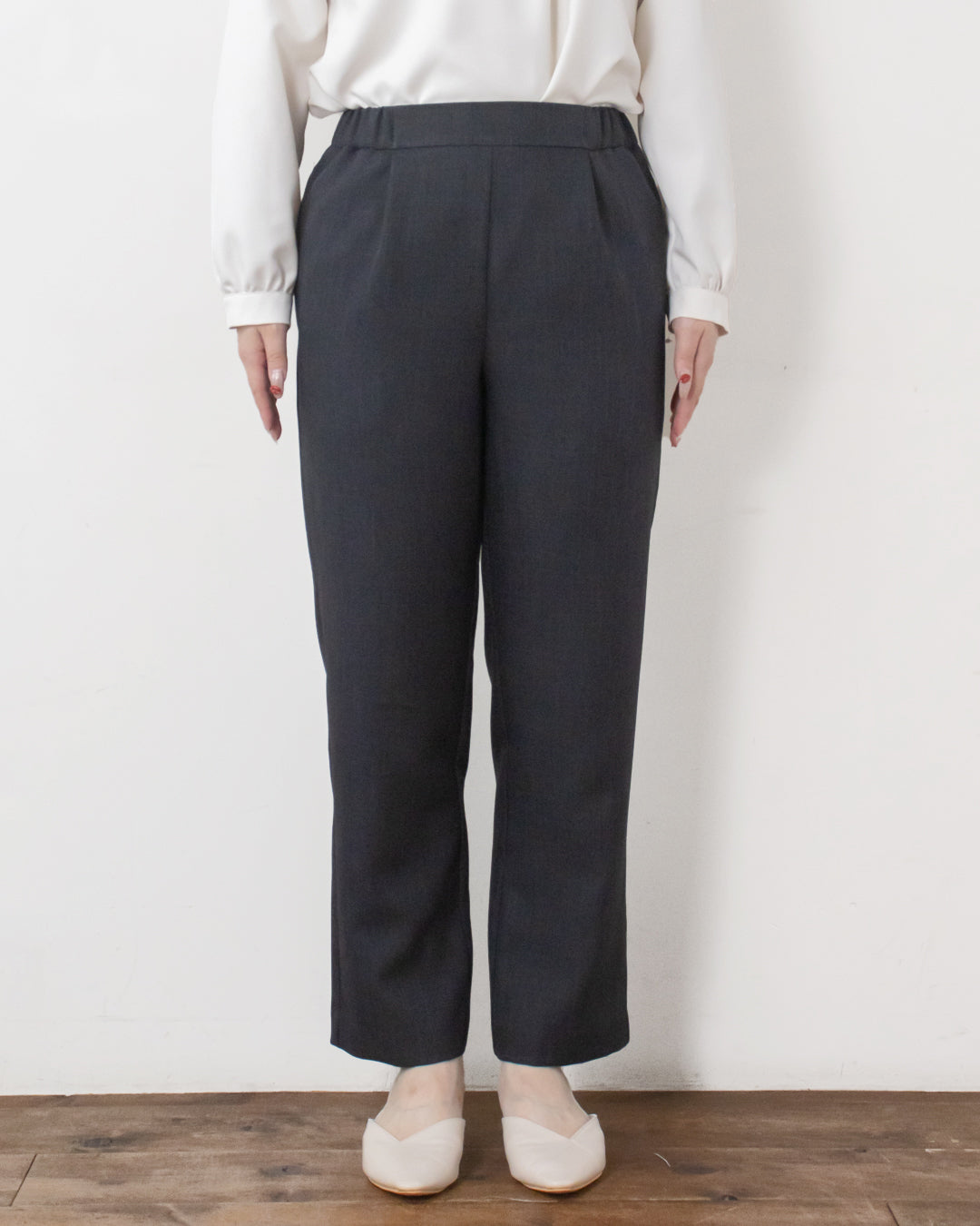 ■ポイント ・ウエスト前脇側部分からのゴム仕様で腰回りの張り感が目立たない ・足にシルエットを拾いすぎないストレートパンツ ・ポリエステル素材でシワになりにくくお手入れ楽ちん