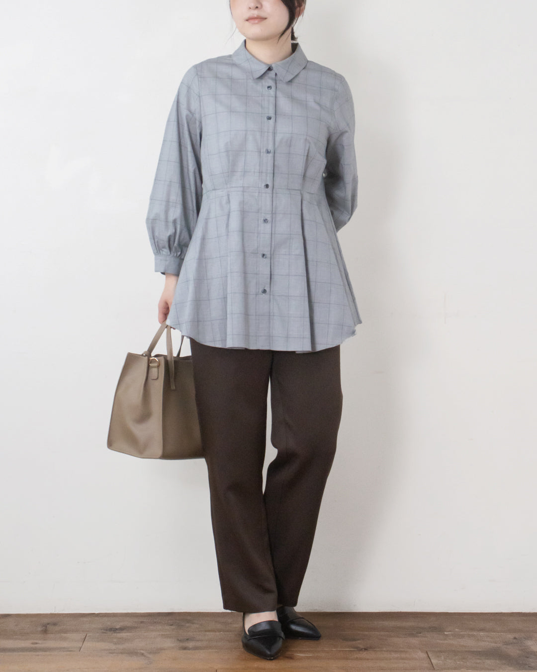 ■コーディネート ・タイプライターピンタック切替ブラウス ・ムジ/チェックタックペプラムブラウス ・スタンドカラー金釦ブラウス