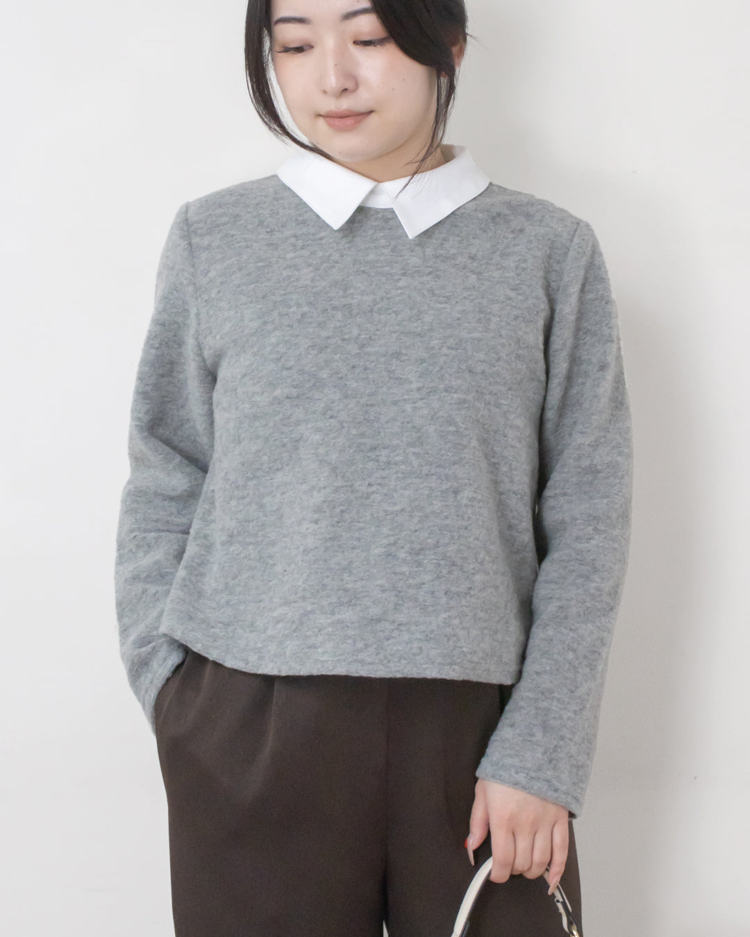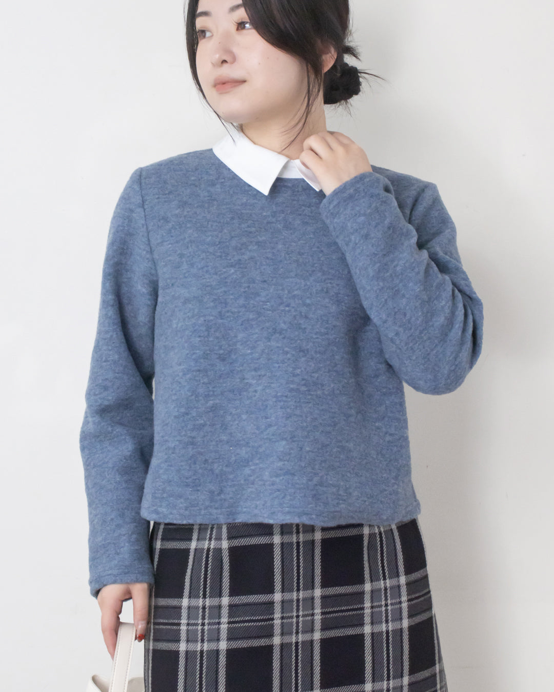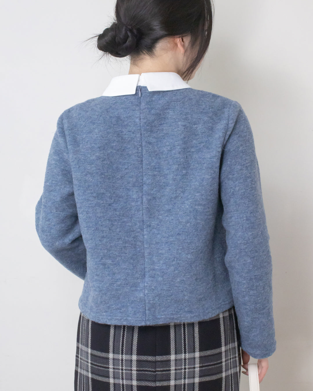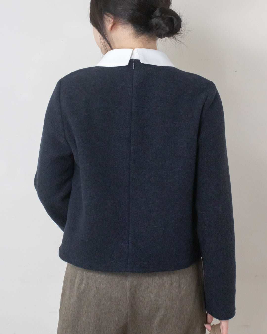 ■デザイン シャツ衿を重ね着したようなレイヤードデザインが魅力のトップスです。 ウール混素材を使用しており、暖かく季節感のある着こなしに。 白衿のバイカラーデザインが顔周りを明るく見せ、メリハリをプラスします。 短め丈で裾を出して着てもバランス良く、お仕事シーンにもおすすめです。 後ろファスナー開きで着脱しやすく、家庭洗濯可能なのも嬉しいポイントです。