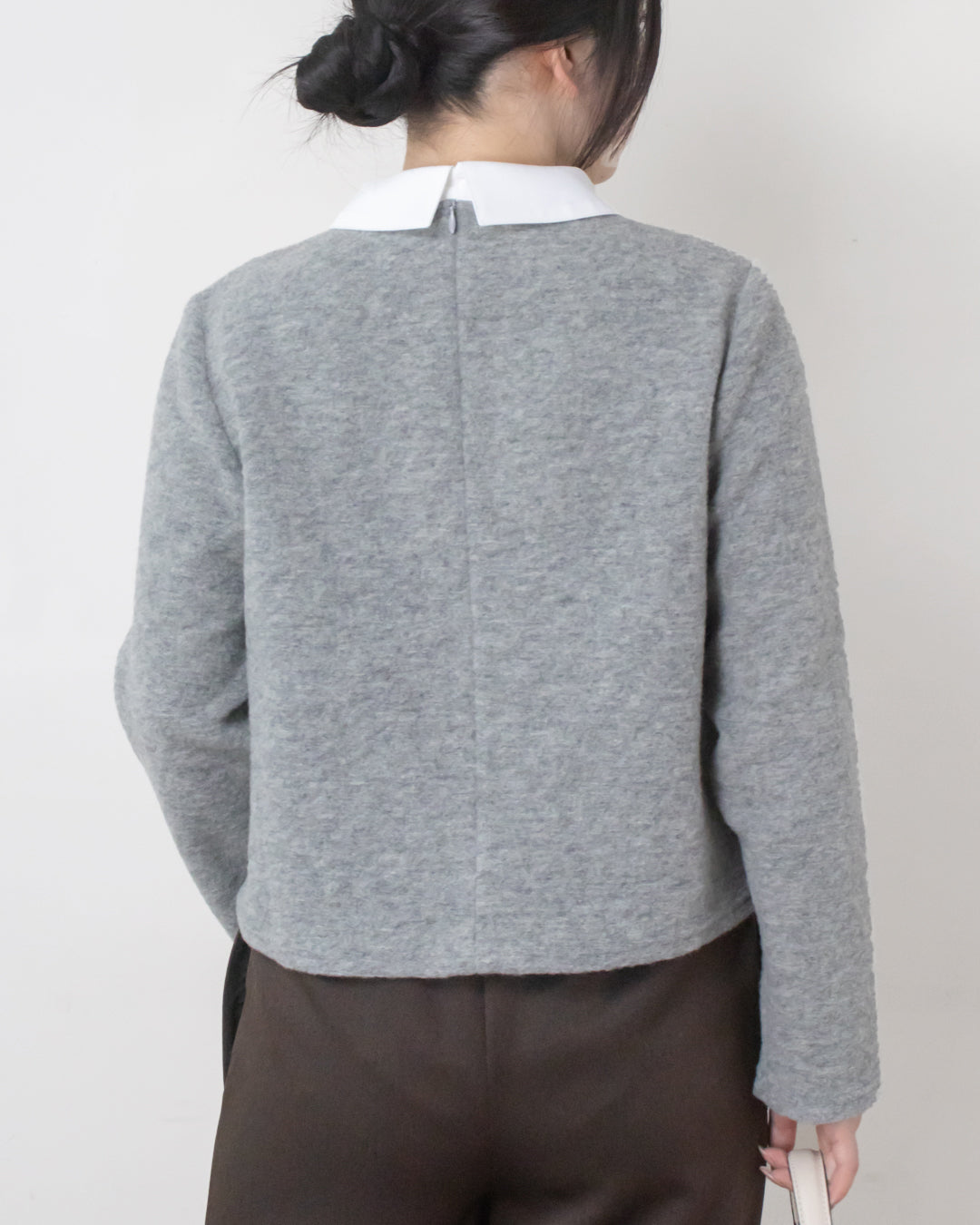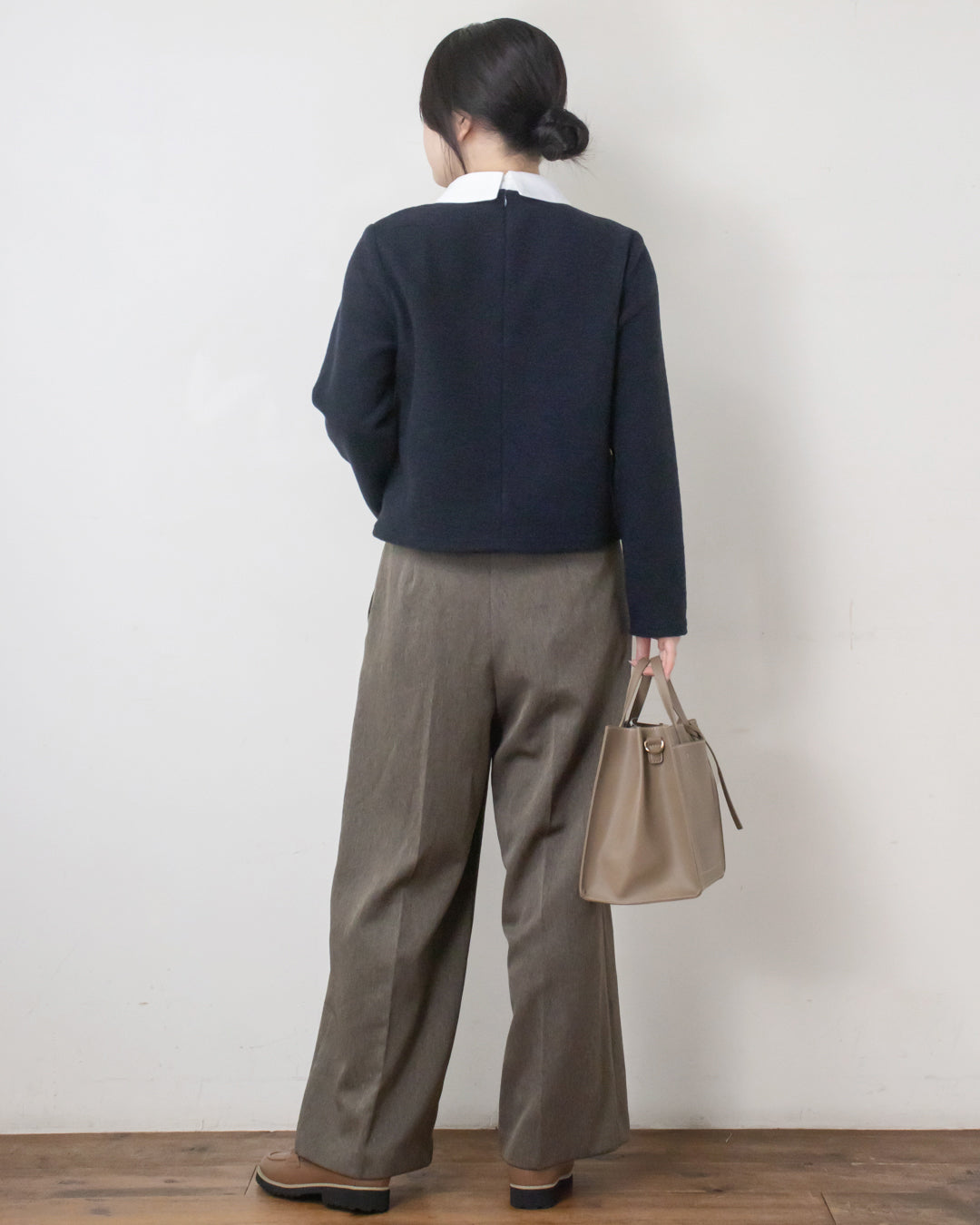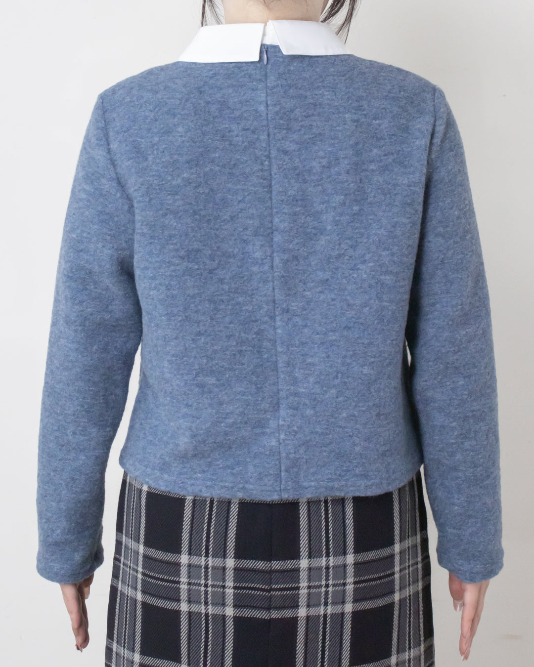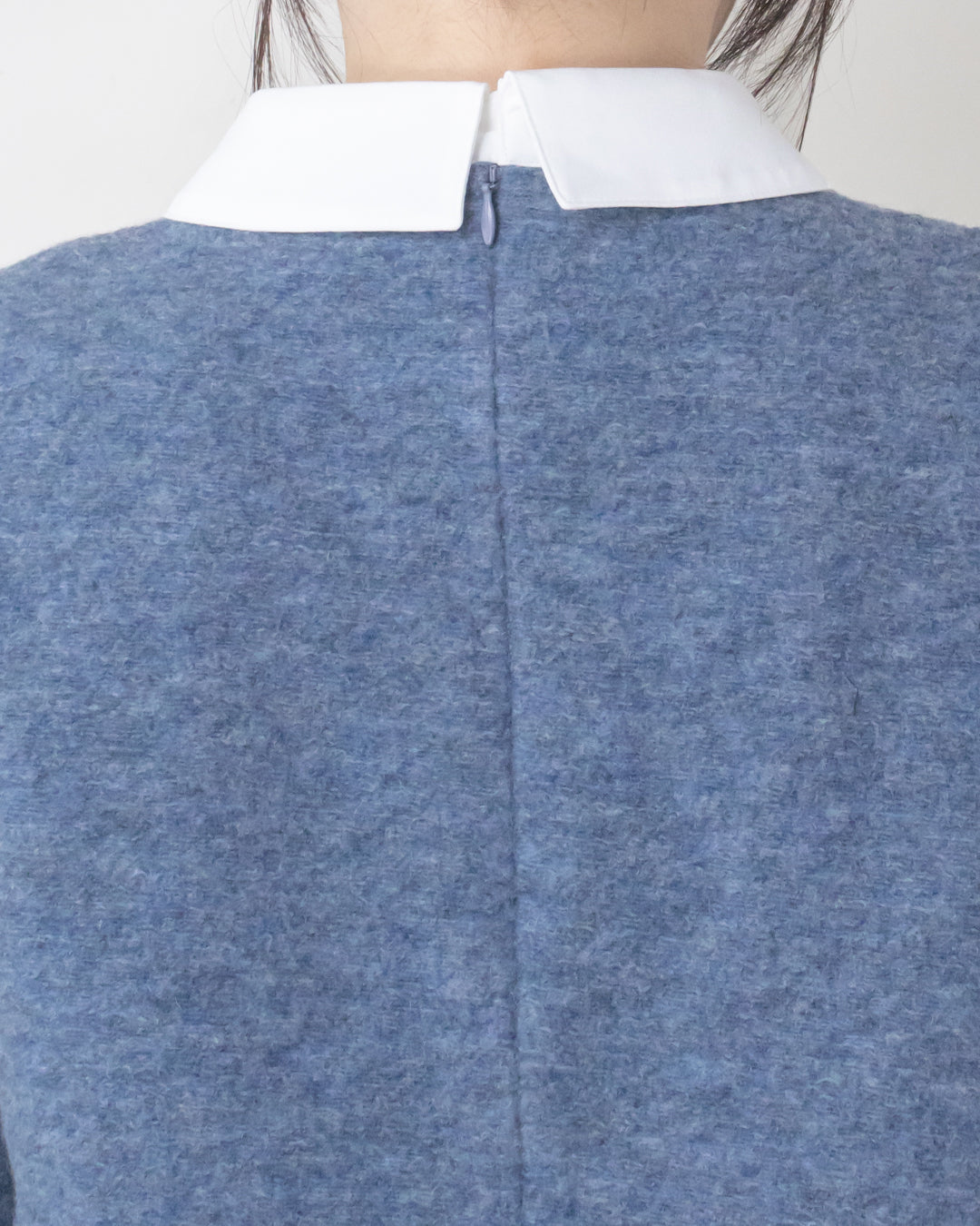 ■デザイン シャツ衿を重ね着したようなレイヤードデザインが魅力のトップスです。 ウール混素材を使用しており、暖かく季節感のある着こなしに。 白衿のバイカラーデザインが顔周りを明るく見せ、メリハリをプラスします。 短め丈で裾を出して着てもバランス良く、お仕事シーンにもおすすめです。 後ろファスナー開きで着脱しやすく、家庭洗濯可能なのも嬉しいポイントです。