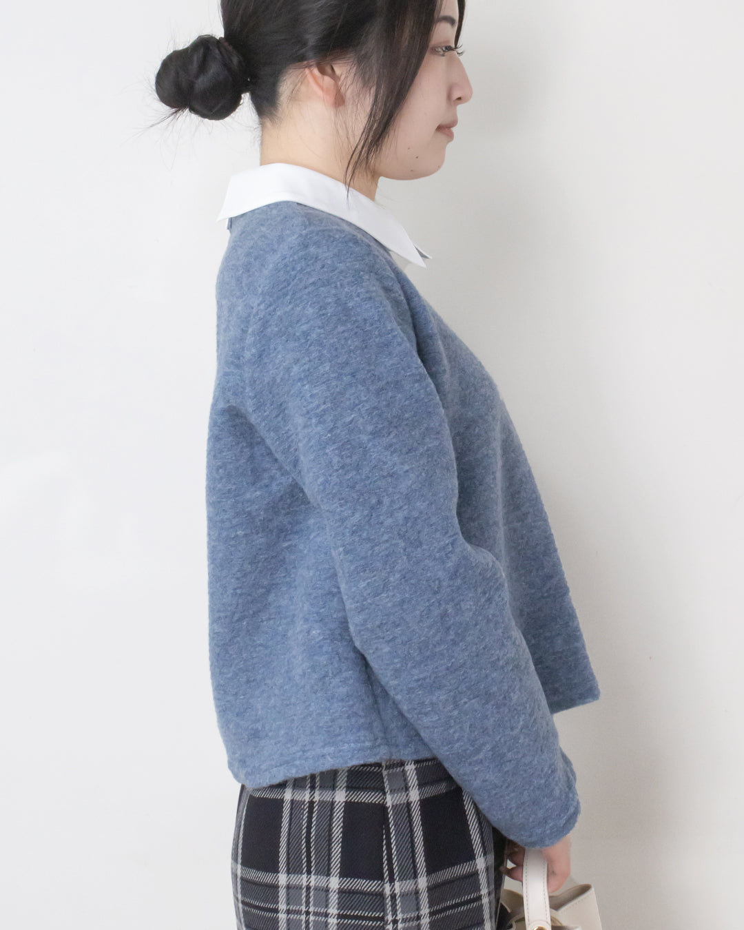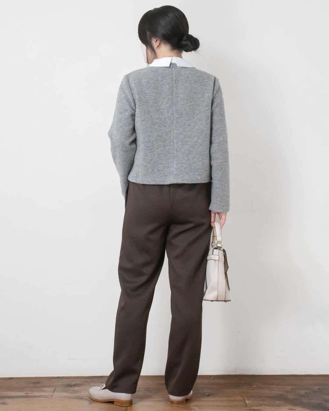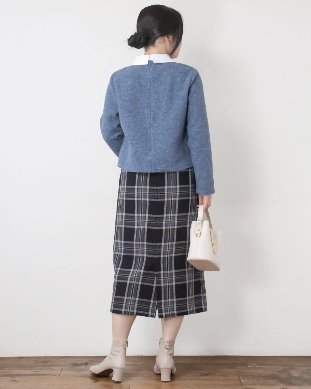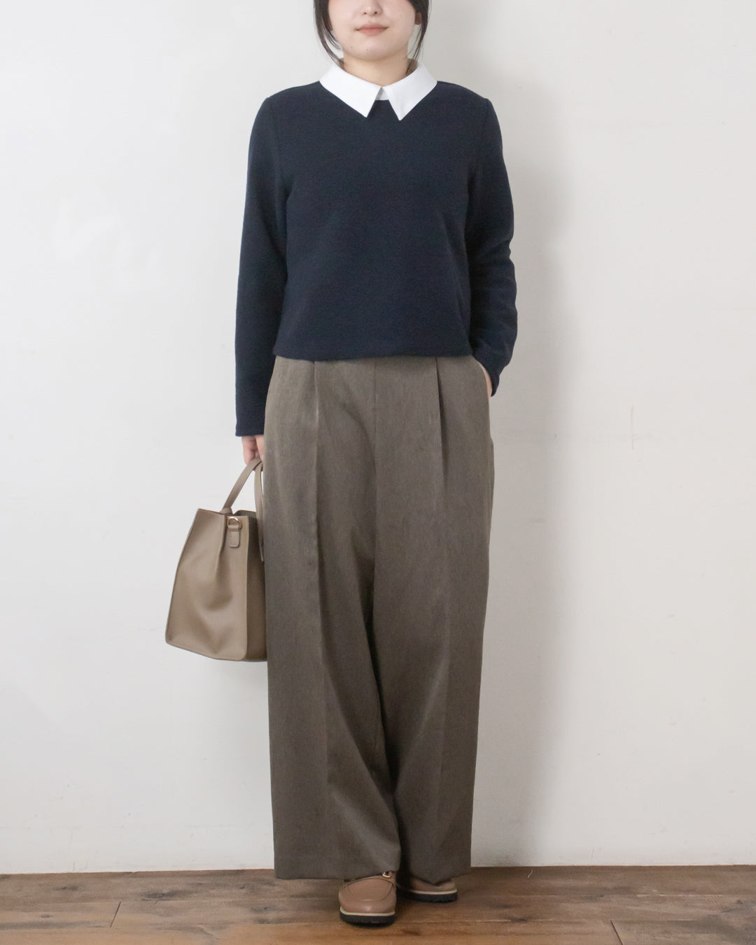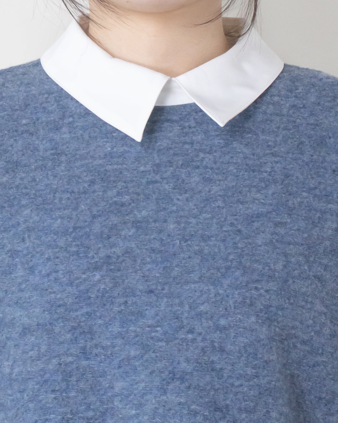 ■デザイン シャツ衿を重ね着したようなレイヤードデザインが魅力のトップスです。 ウール混素材を使用しており、暖かく季節感のある着こなしに。 白衿のバイカラーデザインが顔周りを明るく見せ、メリハリをプラスします。 短め丈で裾を出して着てもバランス良く、お仕事シーンにもおすすめです。 後ろファスナー開きで着脱しやすく、家庭洗濯可能なのも嬉しいポイントです。