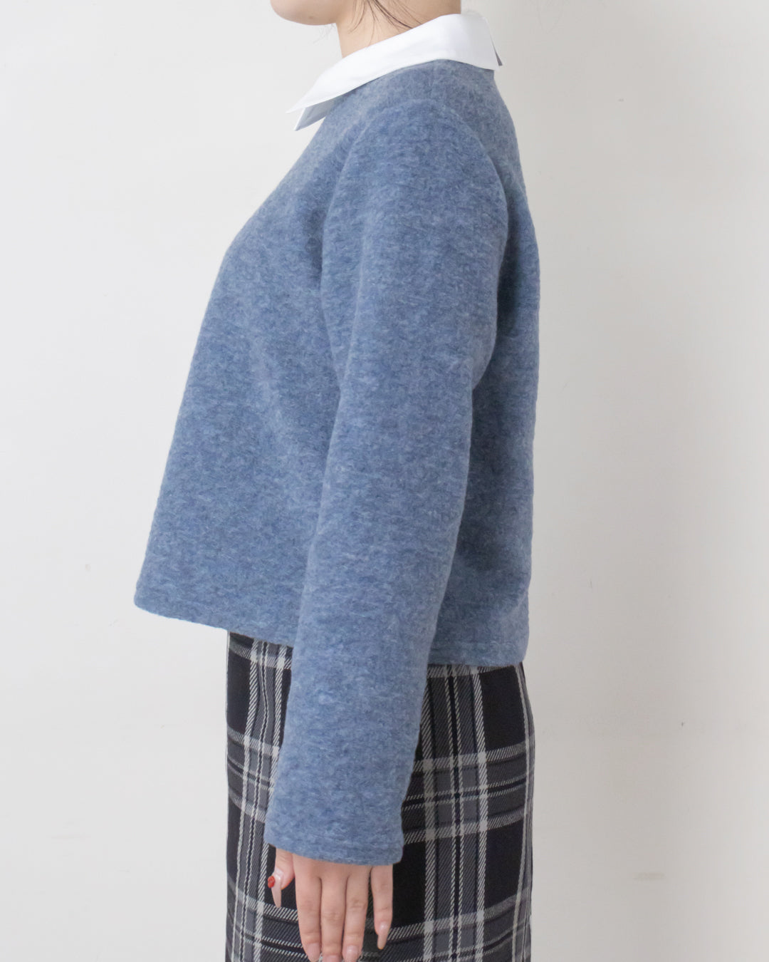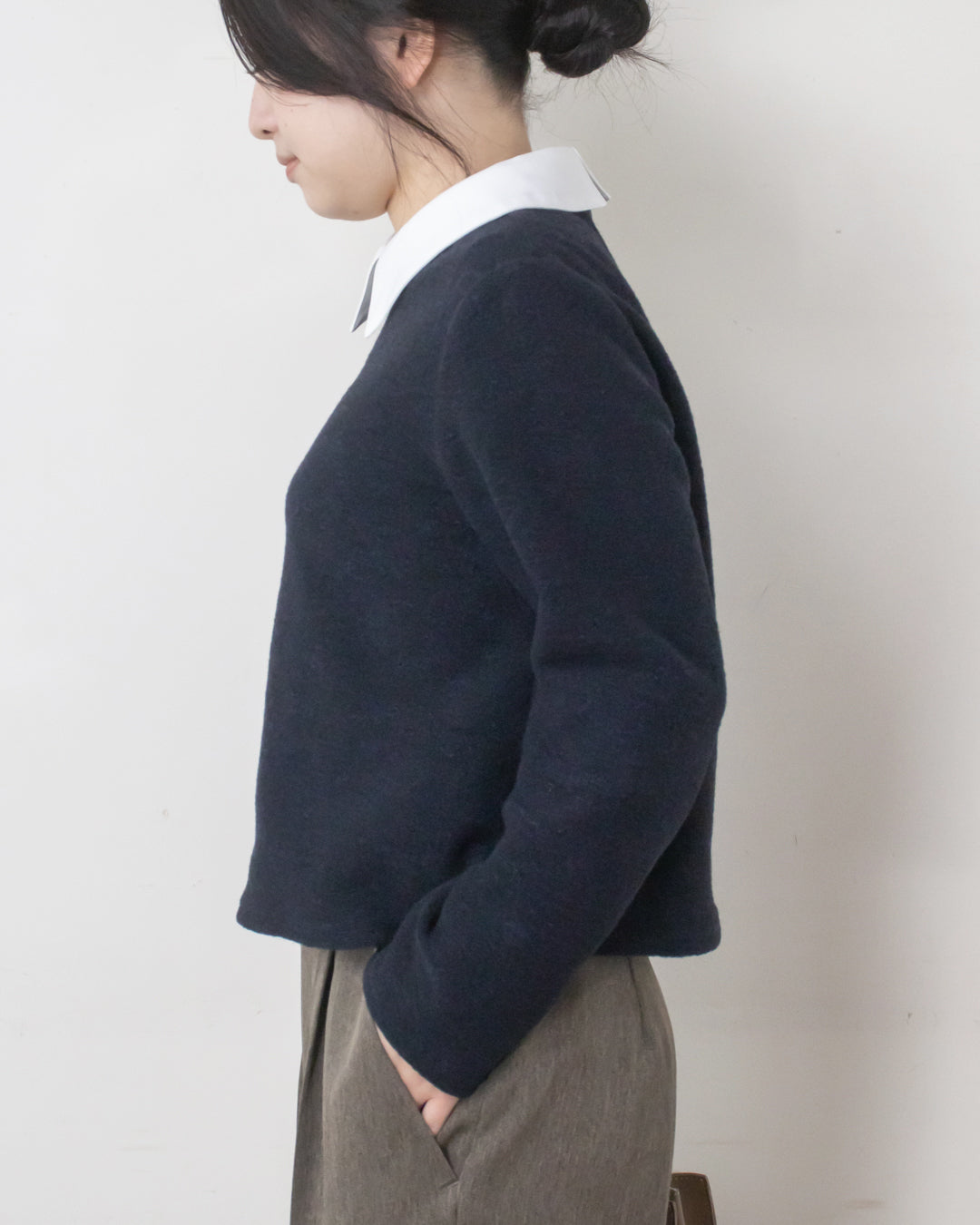 ■ポイント ・シャツ衿を重ね着したようなレイヤードデザインで、1枚で着映えるトップス ・ウール混素材で暖かく、季節感のある表情に ・白衿のバイカラーデザインが顔周りを明るく見せ、メリハリのある印象に ・短め丈で裾を出して着てもバランスよく通勤コーデにもおすすめ ・後ろファスナー開きで着脱もスムーズ、家庭洗濯OKでお手入れ簡単