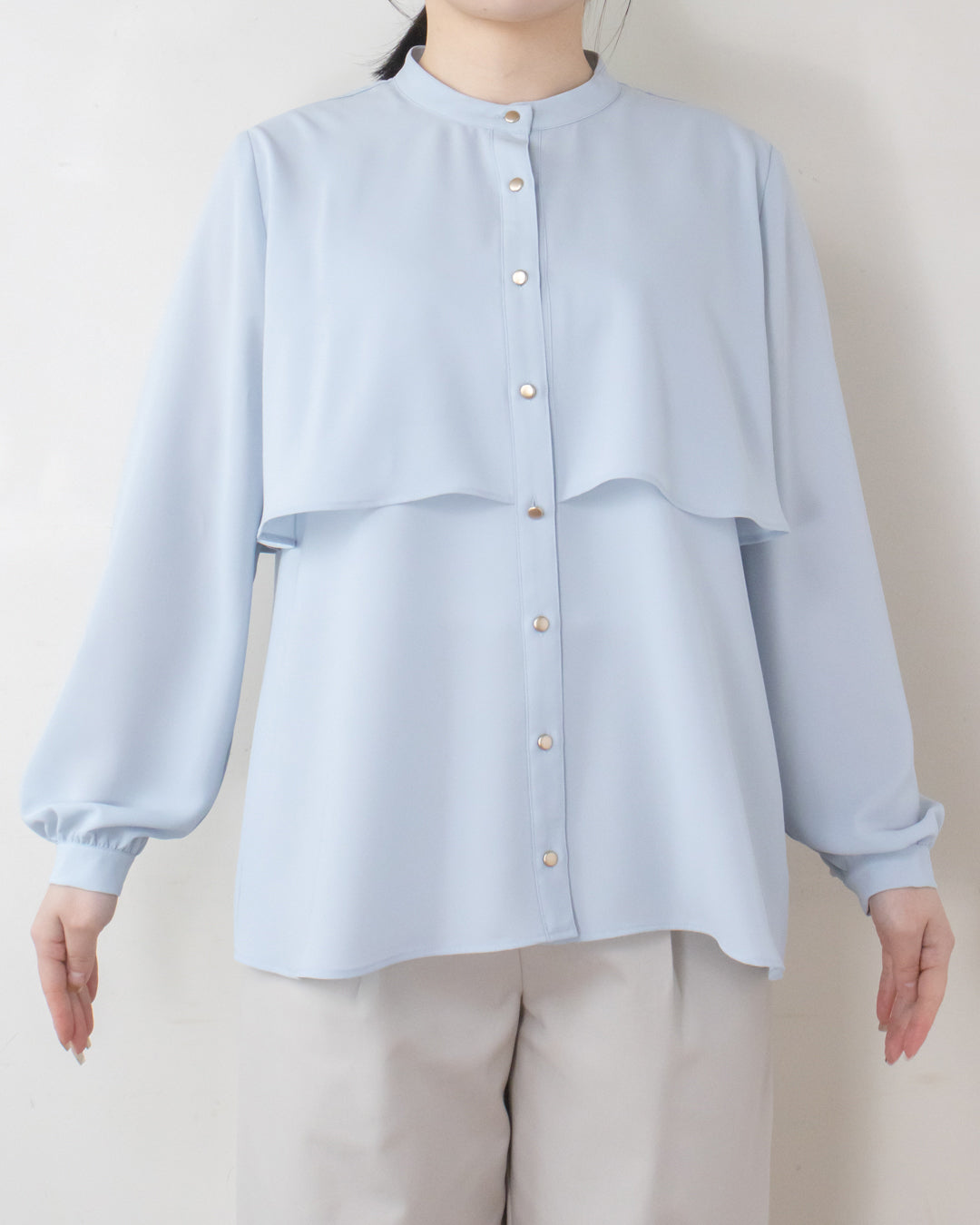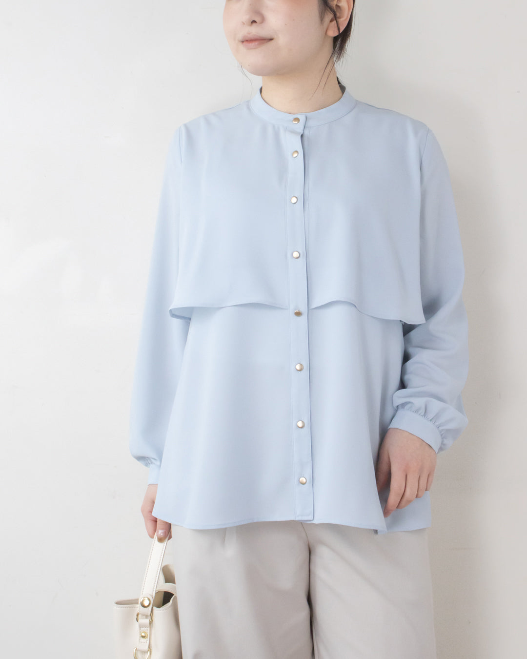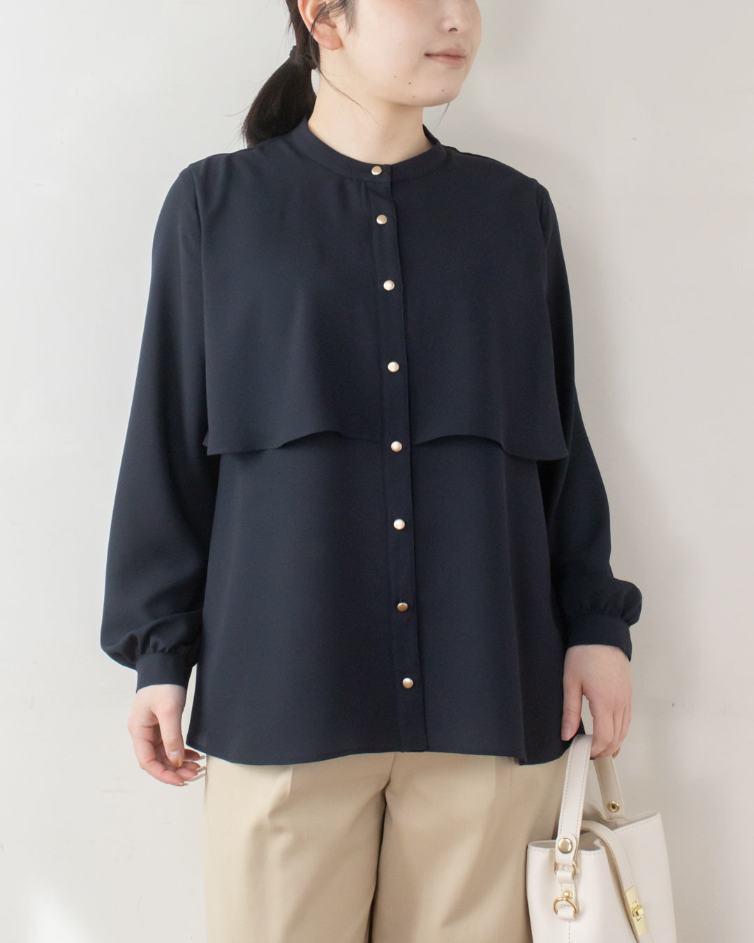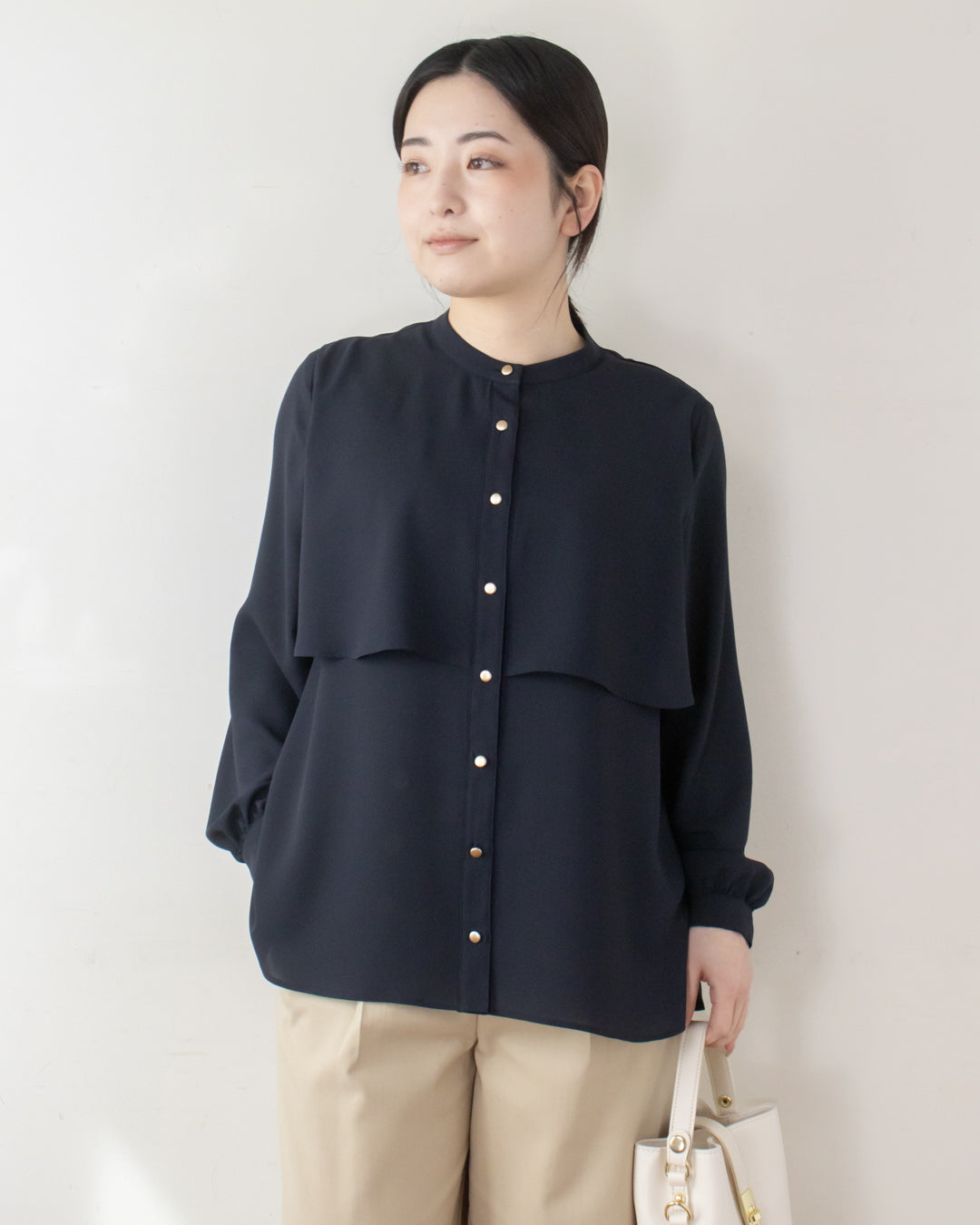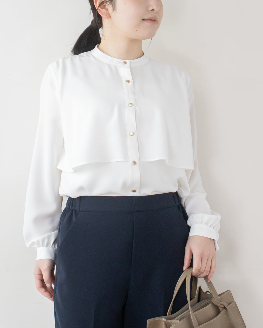 ■デザイン 例年人気のレイヤード風ブラウスが、着脱しやすい前あきデザインになって登場。 柔らかなジョーゼット素材が上品で女性らしい印象を演出します。 マットゴールドのボタンがさりげないアクセントになり、コーディネートに華やかさをプラス。 やや短めに設定したレイヤード部分はインでもアウトでもバランスよく決まり、体のラインを拾いにくいシルエットで体型カバーも叶う一枚です。