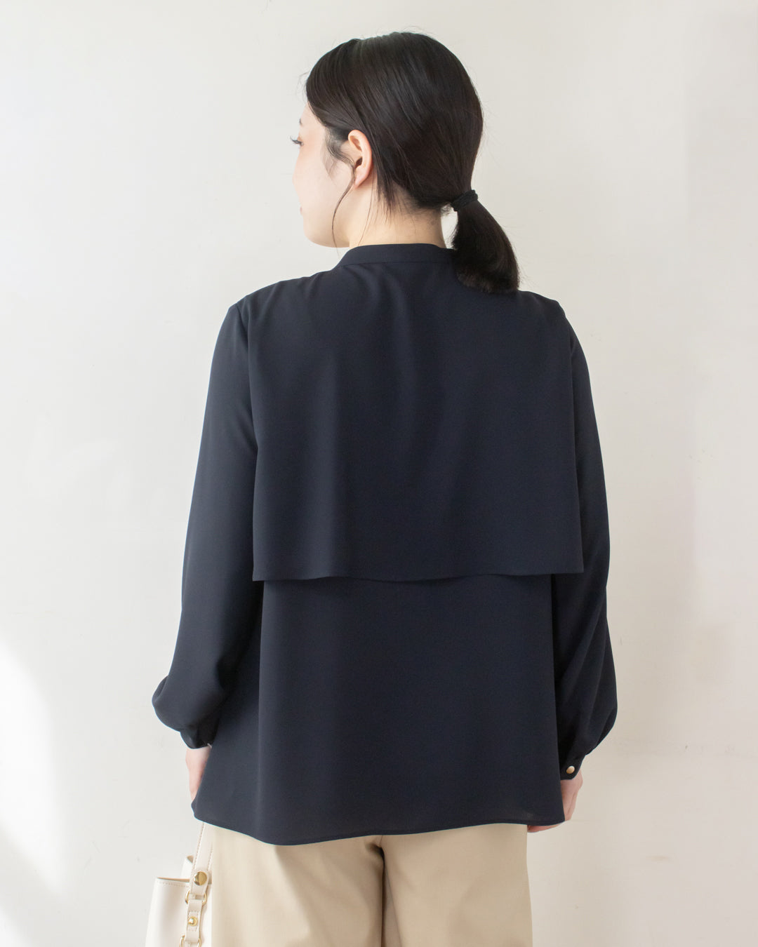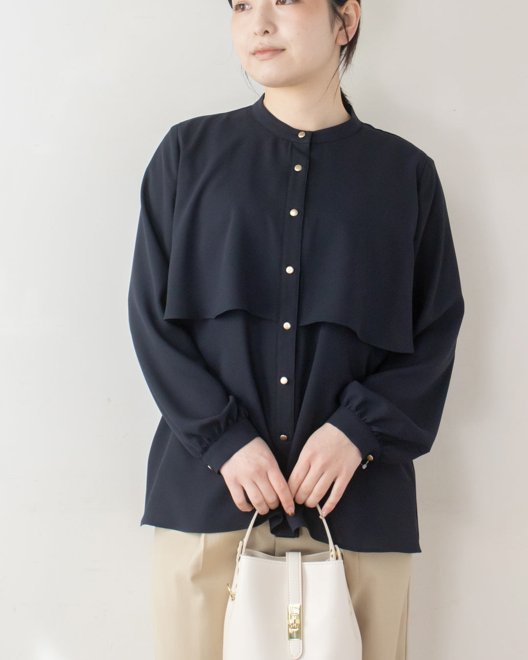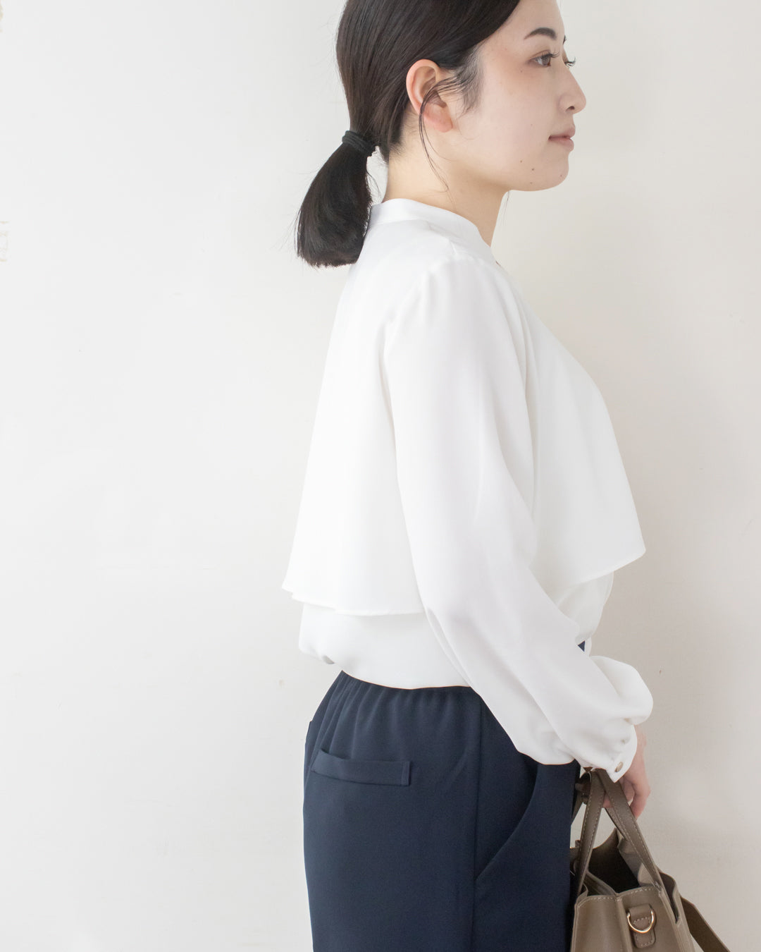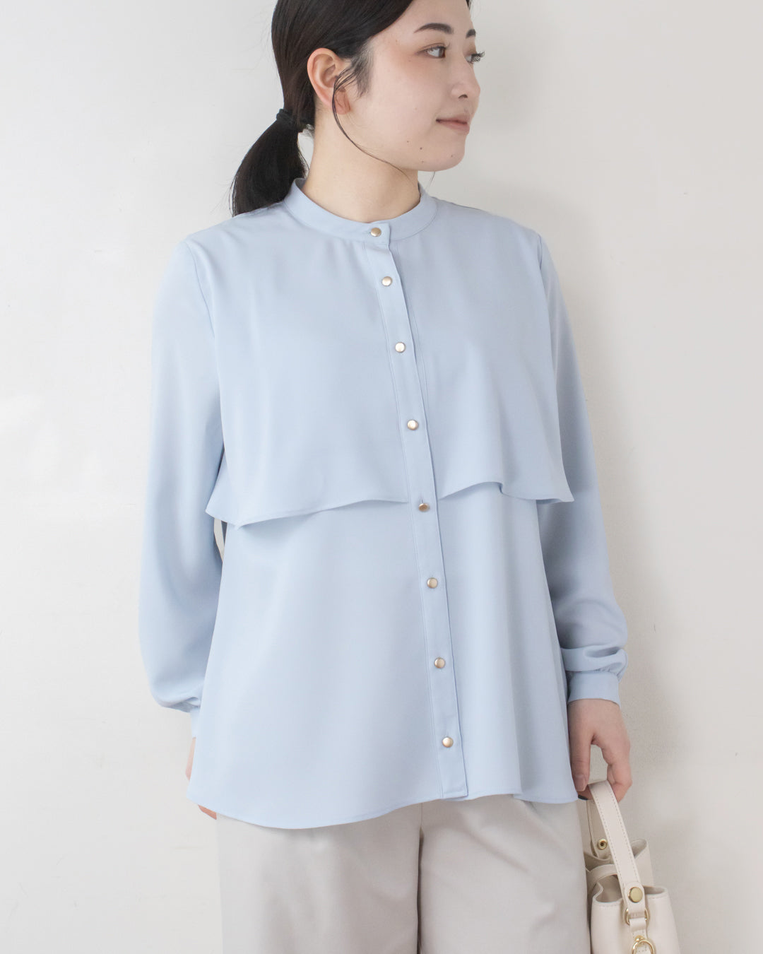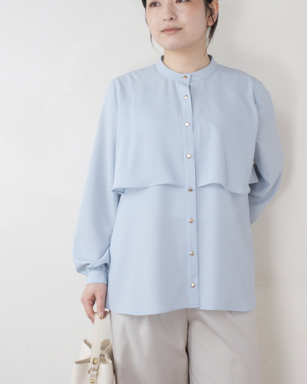 ■デザイン 例年人気のレイヤード風ブラウスが、着脱しやすい前あきデザインになって登場。 柔らかなジョーゼット素材が上品で女性らしい印象を演出します。 マットゴールドのボタンがさりげないアクセントになり、コーディネートに華やかさをプラス。 やや短めに設定したレイヤード部分はインでもアウトでもバランスよく決まり、体のラインを拾いにくいシルエットで体型カバーも叶う一枚です。