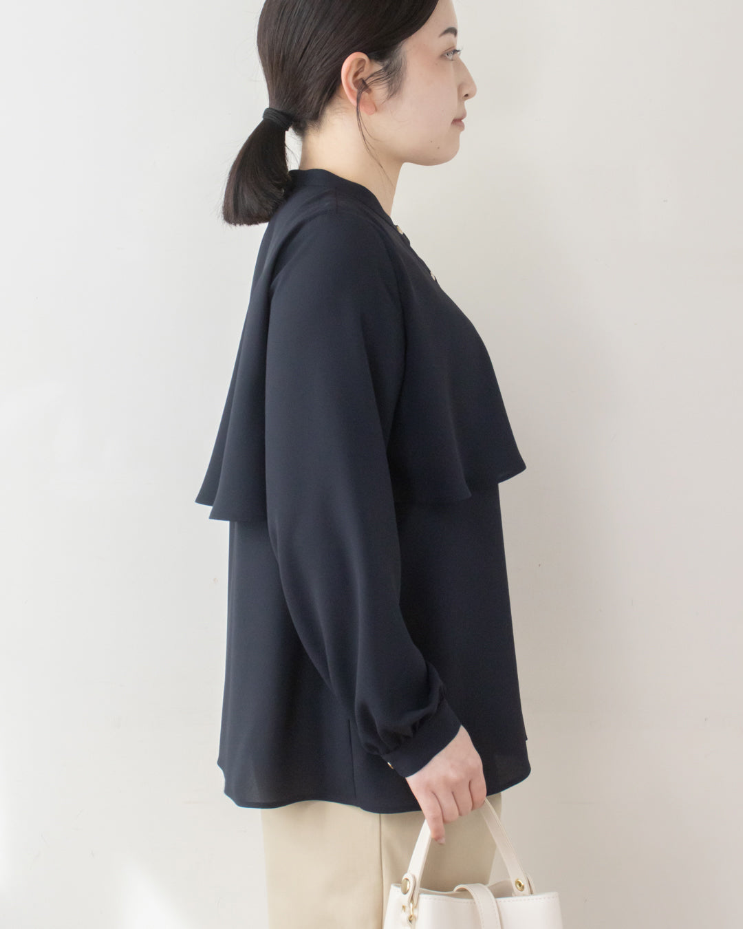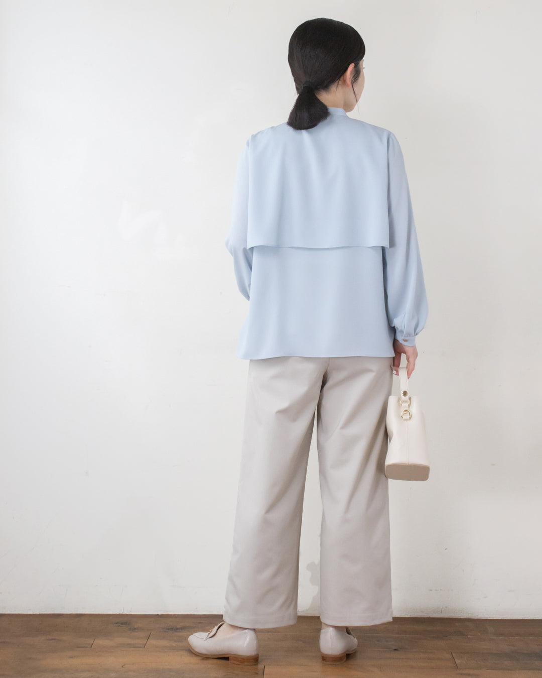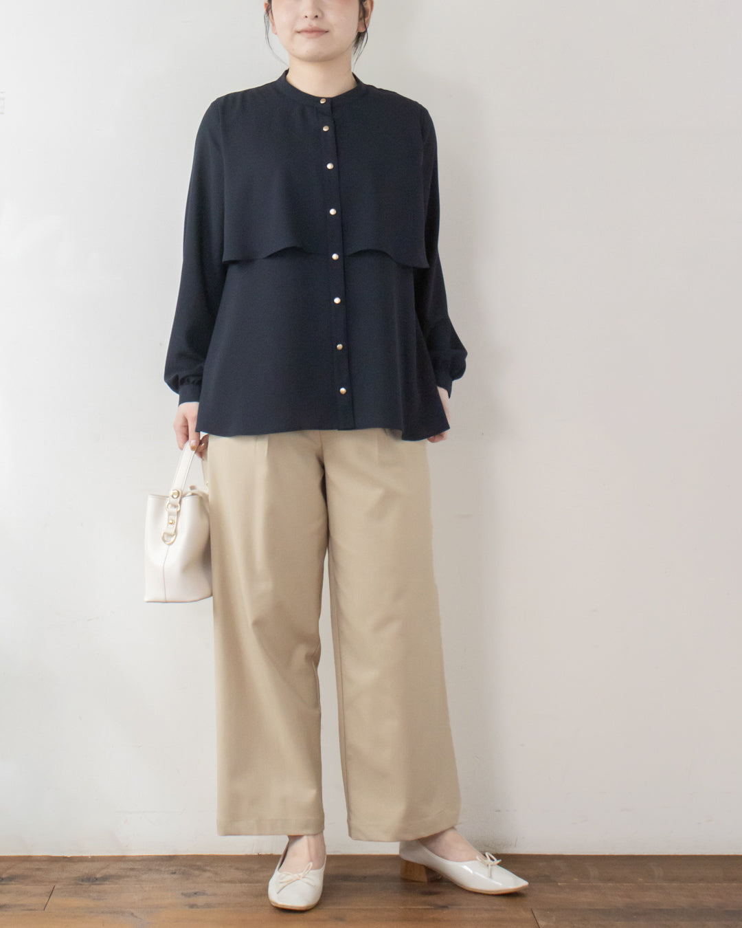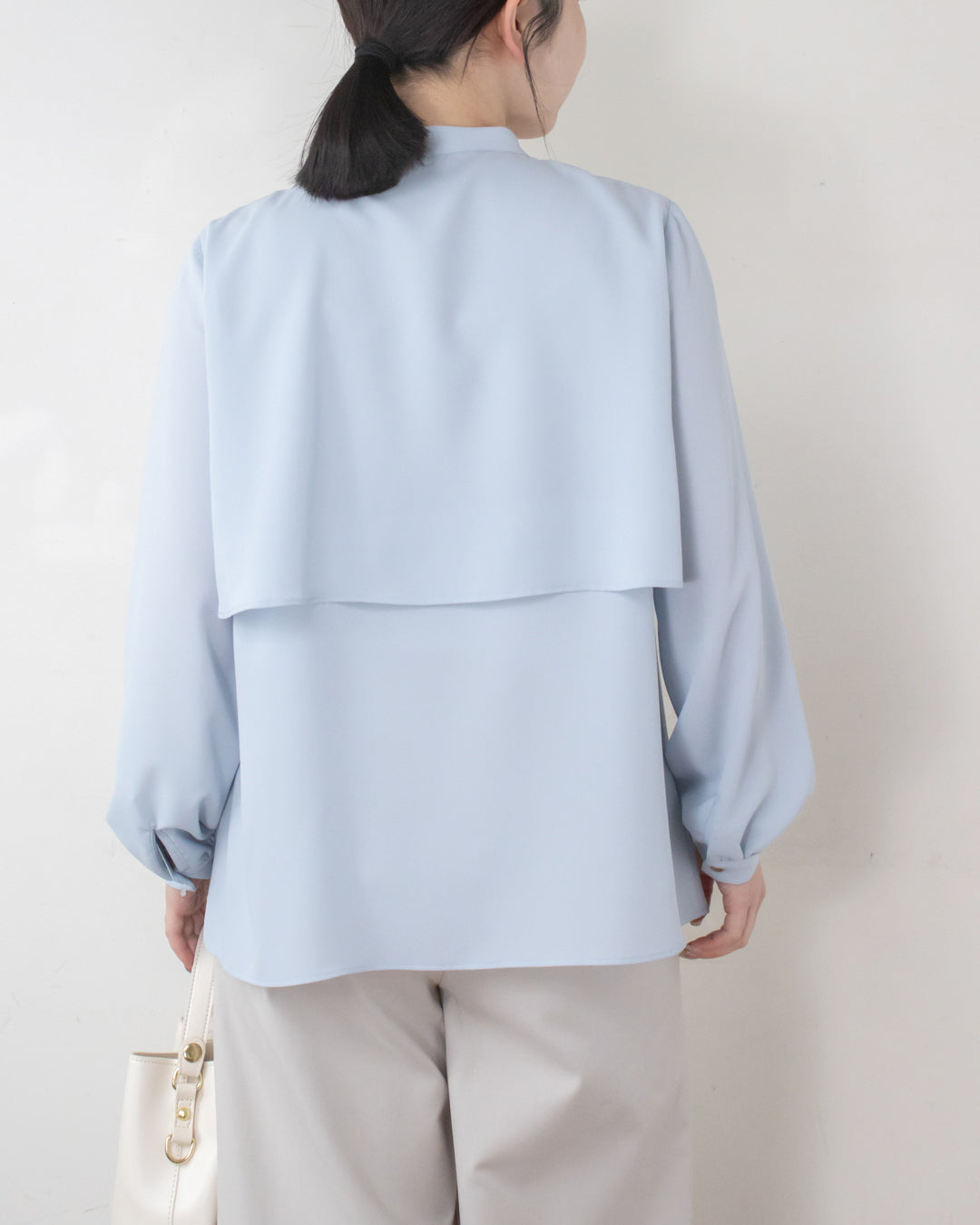 ■デザイン 例年人気のレイヤード風ブラウスが、着脱しやすい前あきデザインになって登場。 柔らかなジョーゼット素材が上品で女性らしい印象を演出します。 マットゴールドのボタンがさりげないアクセントになり、コーディネートに華やかさをプラス。 やや短めに設定したレイヤード部分はインでもアウトでもバランスよく決まり、体のラインを拾いにくいシルエットで体型カバーも叶う一枚です。