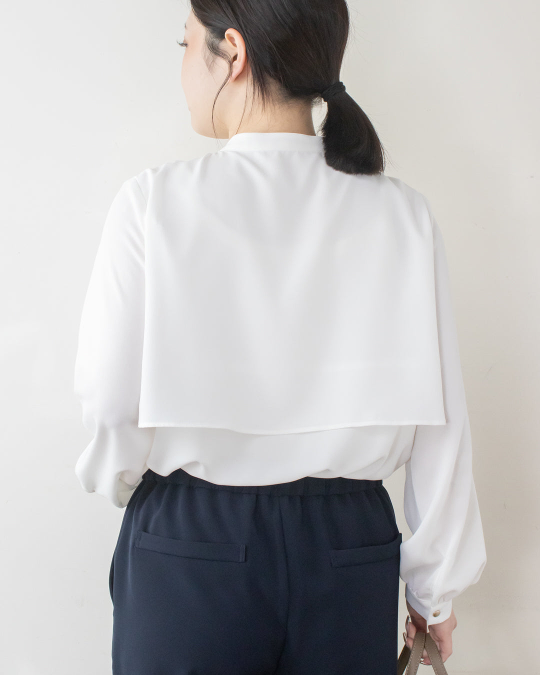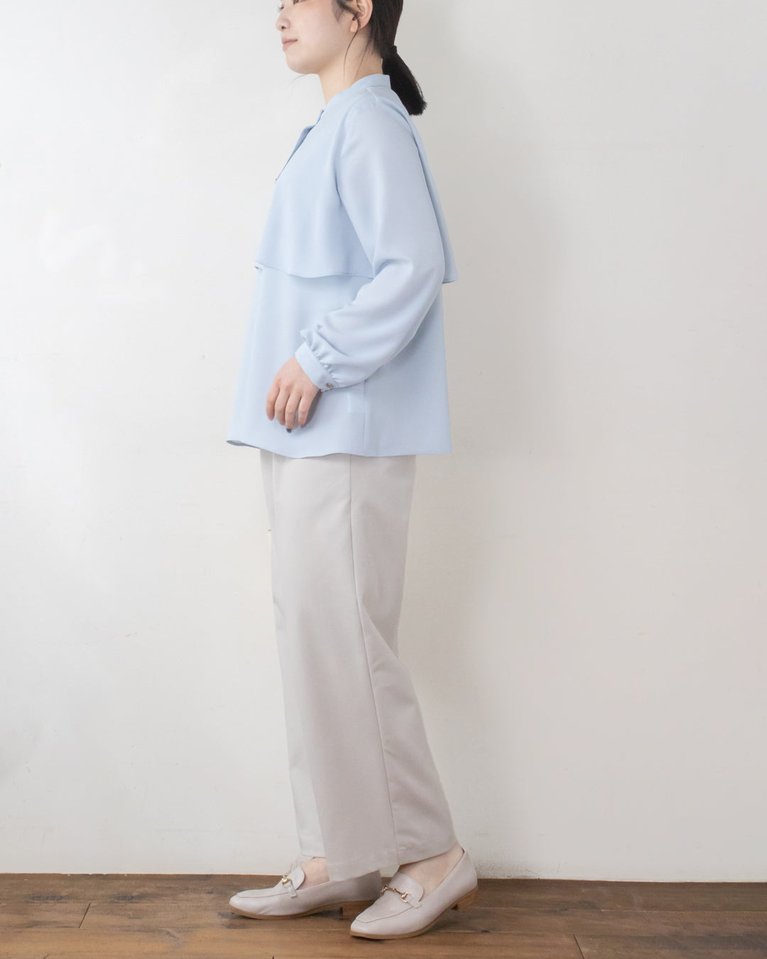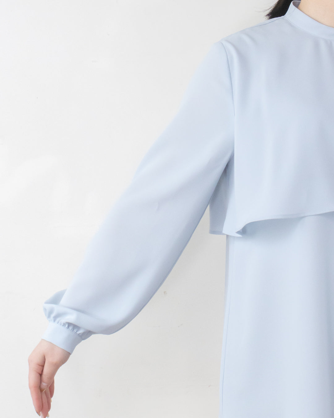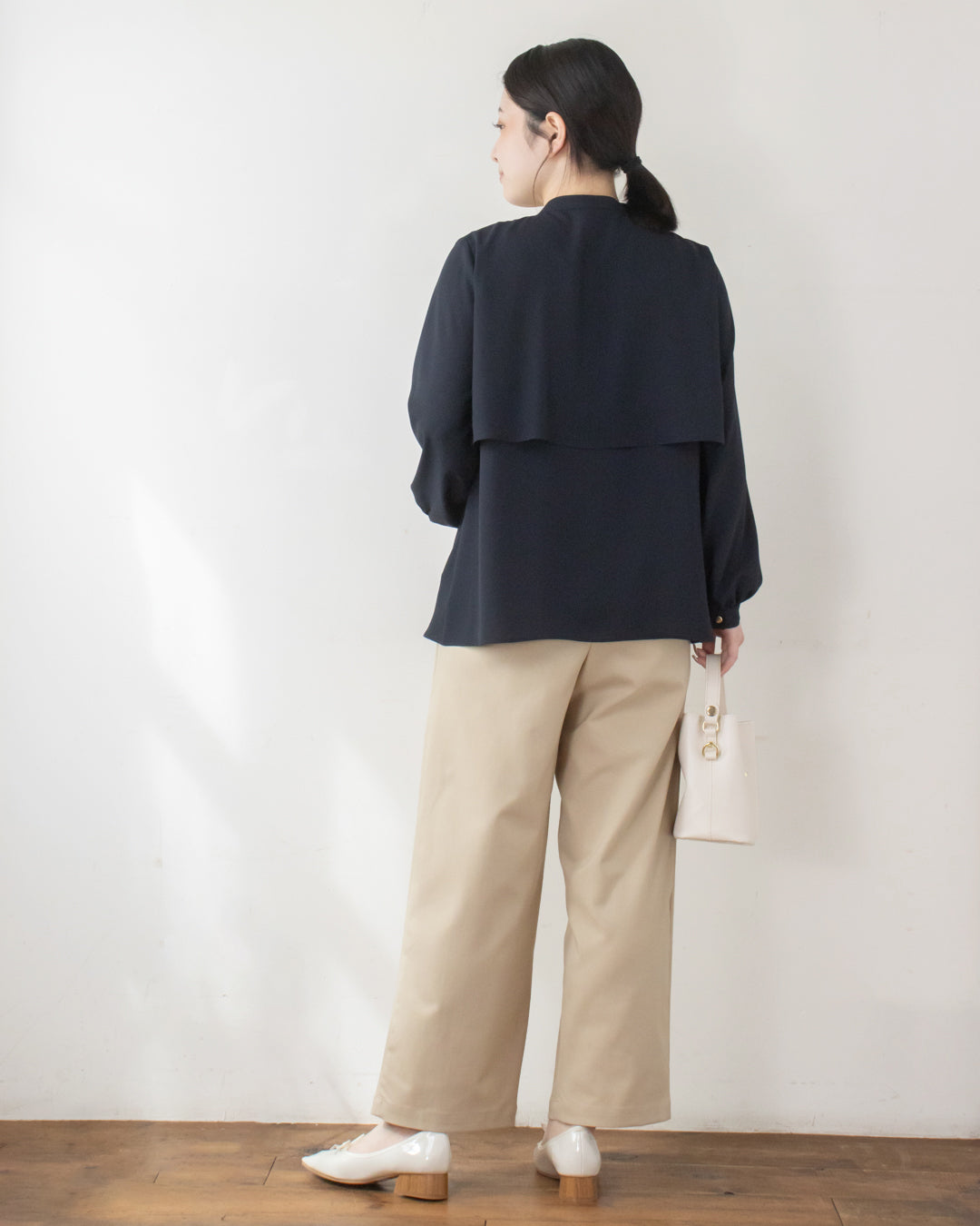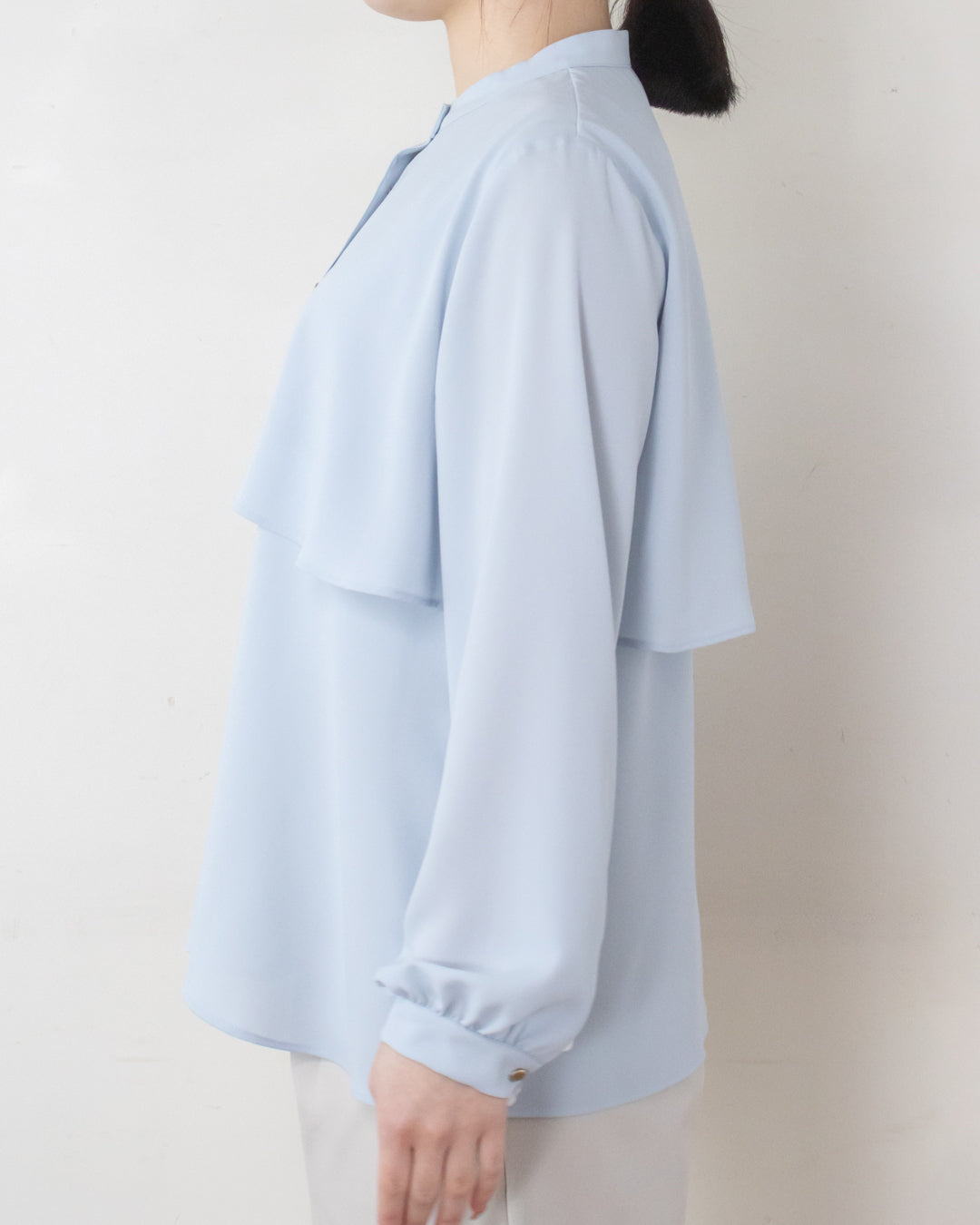 ■デザイン 例年人気のレイヤード風ブラウスが、着脱しやすい前あきデザインになって登場。 柔らかなジョーゼット素材が上品で女性らしい印象を演出します。 マットゴールドのボタンがさりげないアクセントになり、コーディネートに華やかさをプラス。 やや短めに設定したレイヤード部分はインでもアウトでもバランスよく決まり、体のラインを拾いにくいシルエットで体型カバーも叶う一枚です。