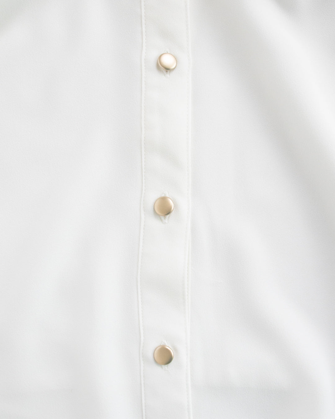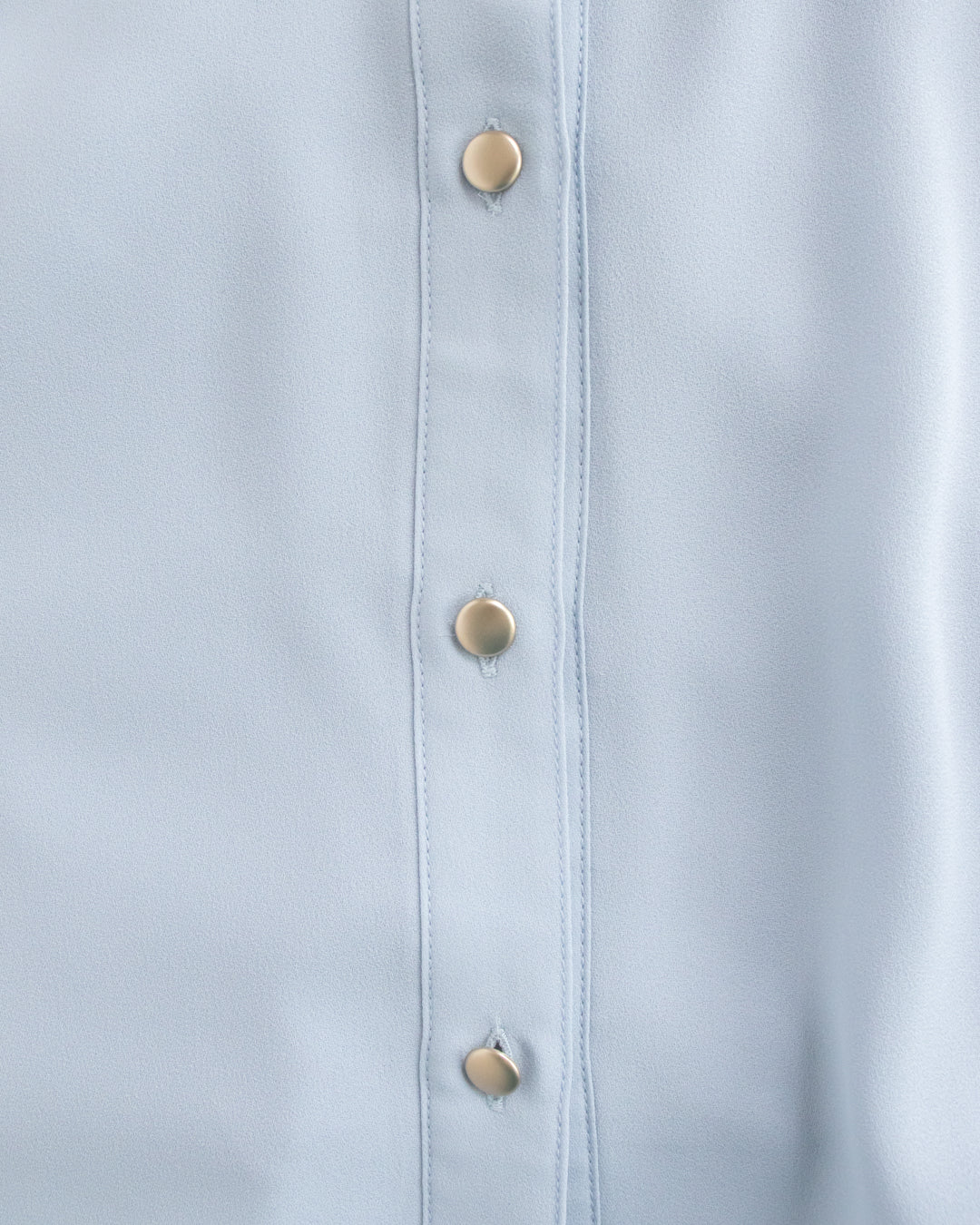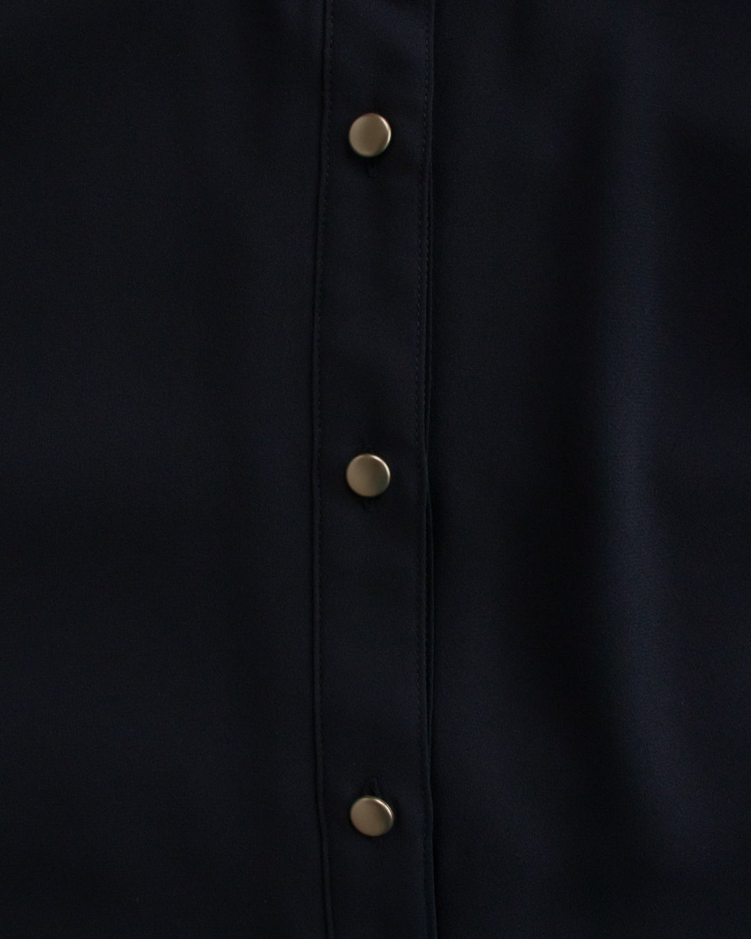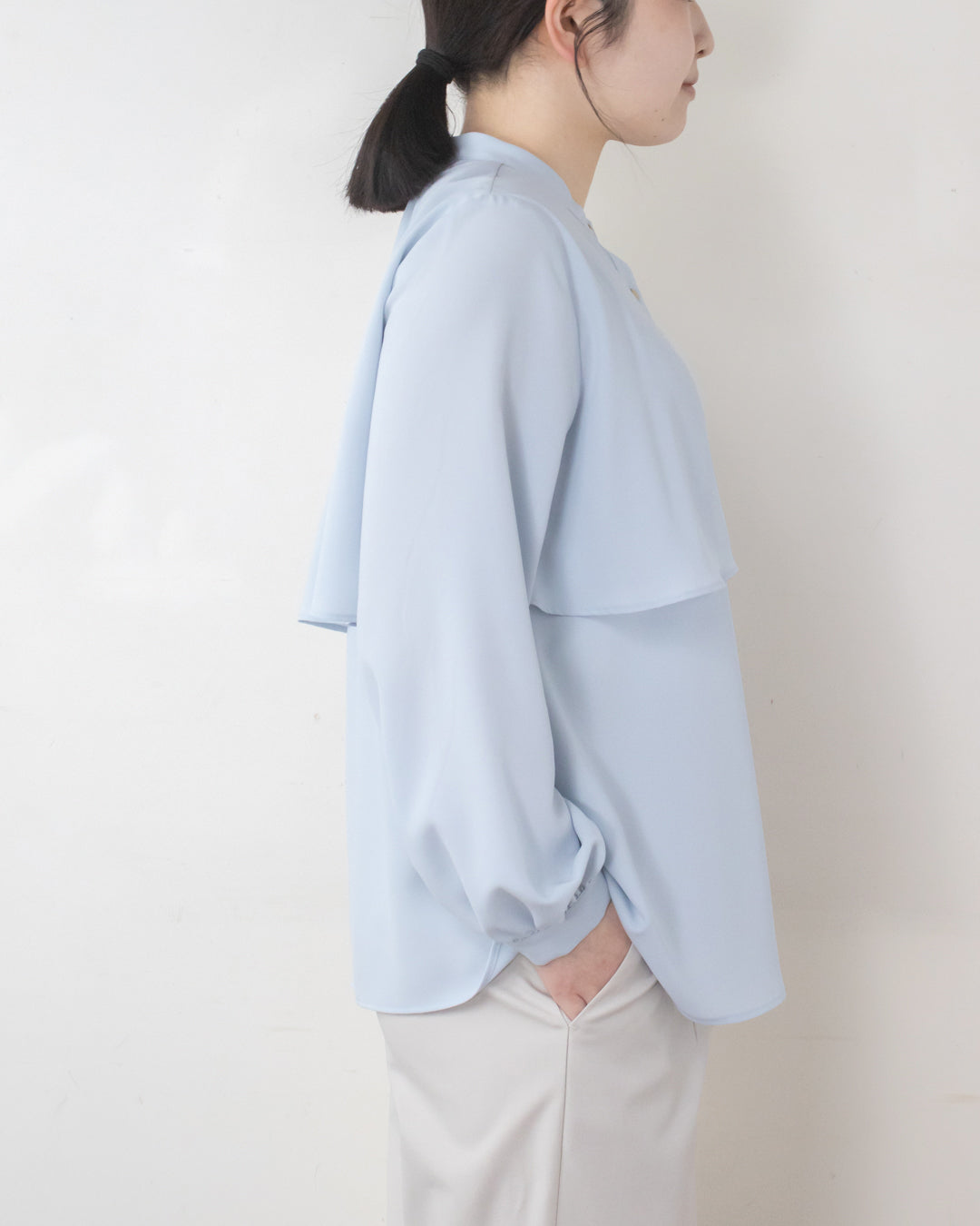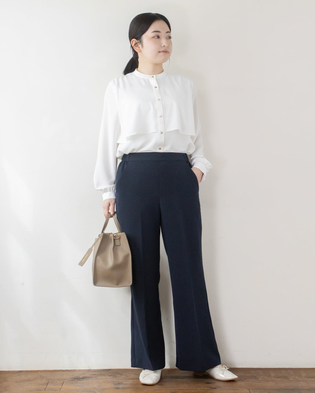 ■デザイン 例年人気のレイヤード風ブラウスが、着脱しやすい前あきデザインになって登場。 柔らかなジョーゼット素材が上品で女性らしい印象を演出します。 マットゴールドのボタンがさりげないアクセントになり、コーディネートに華やかさをプラス。 やや短めに設定したレイヤード部分はインでもアウトでもバランスよく決まり、体のラインを拾いにくいシルエットで体型カバーも叶う一枚です。