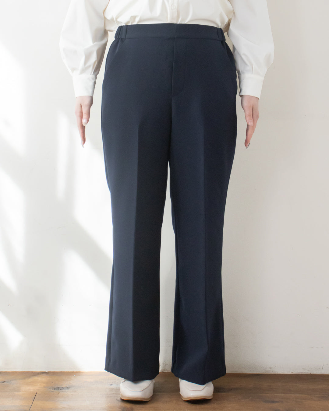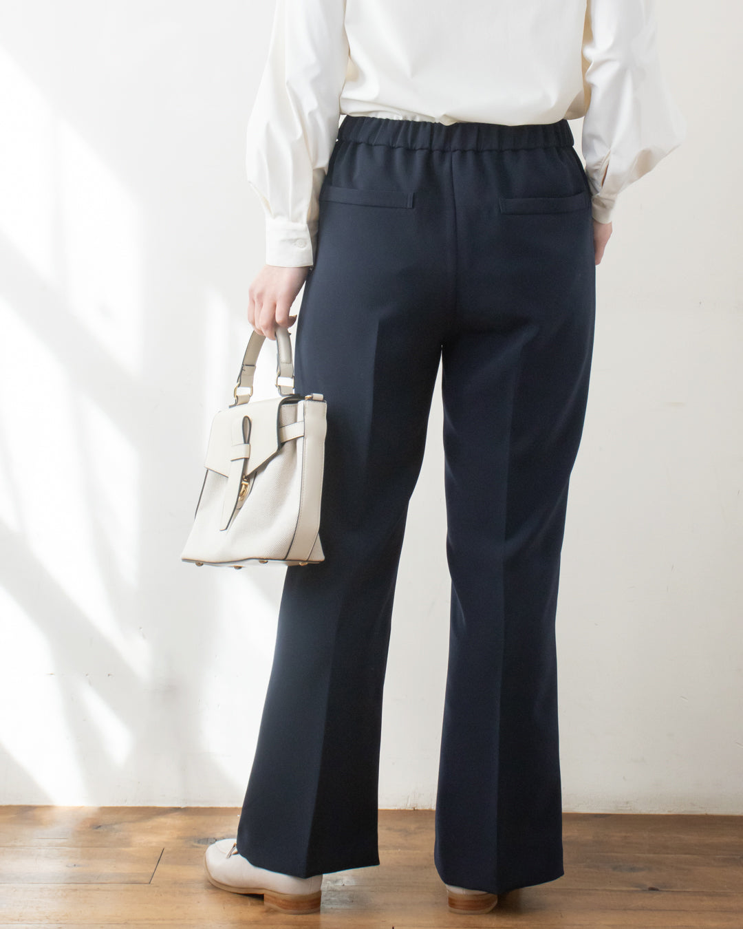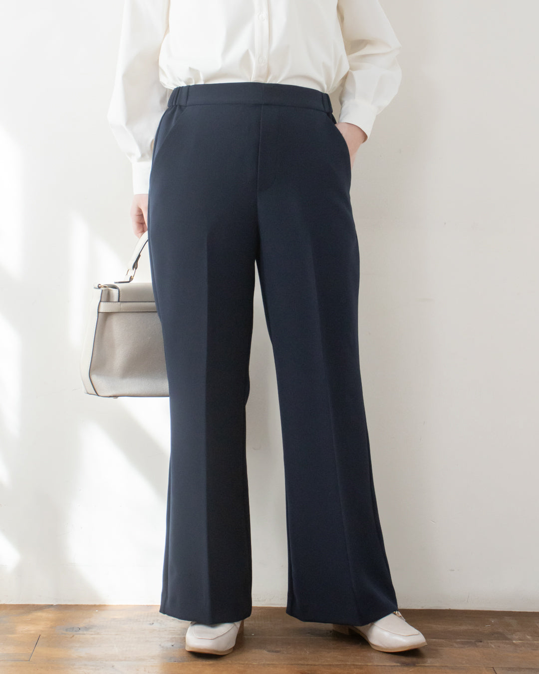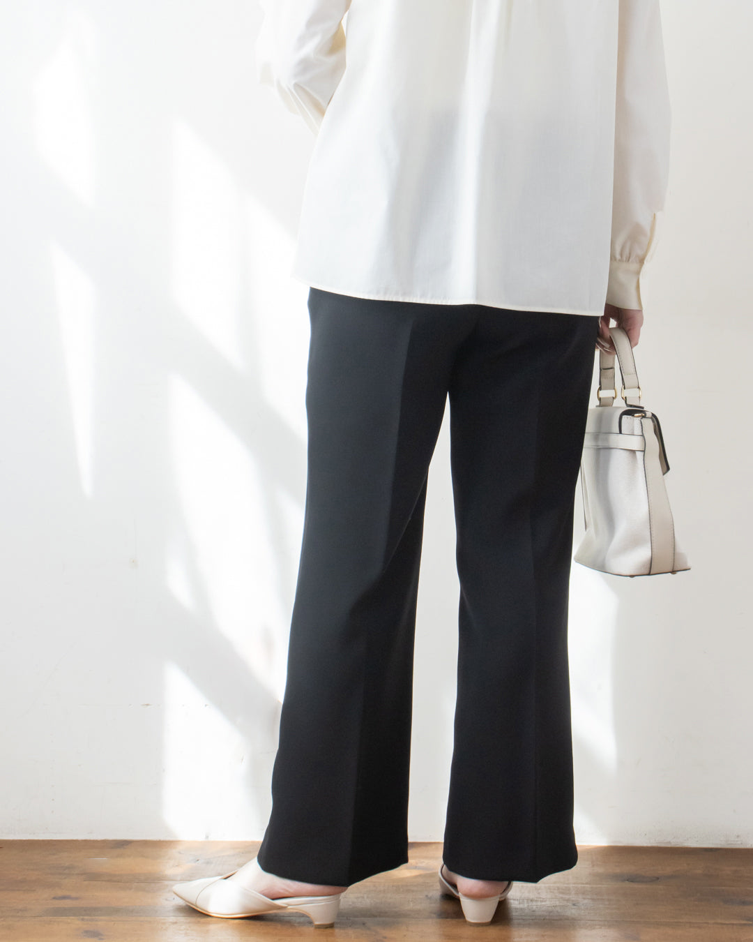 ■デザイン 高めのウエスト位置から広がるセミフレアシルエットで脚をすらっと長く見せてくれるおしゃれパンツ。 センタープレスが縦ラインを強調し、自然なスタイルアップを叶えます。 ストレッチ性のある綺麗見えダブルクロス素材を使用し、シワになりにくく、UVカット効果も◎ 前脇側からゴム仕様で楽な履き心地ながら、腰回りの張り感を軽減。 飾りポケットでヒップアップ効果もあり、セレモニーからデイリーまで幅広く活躍します。