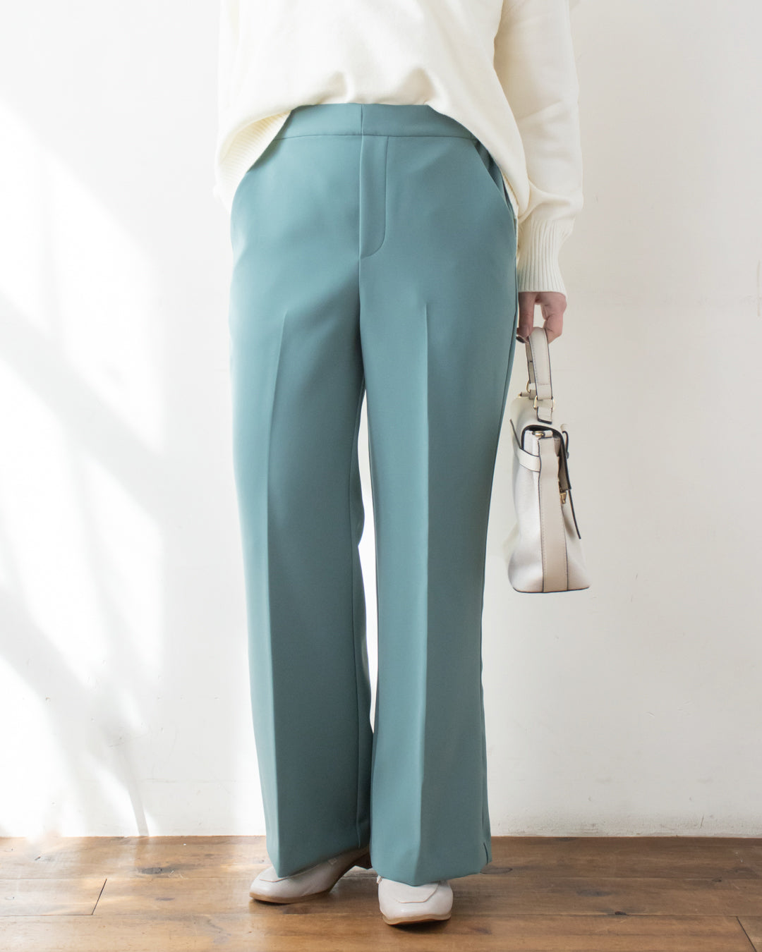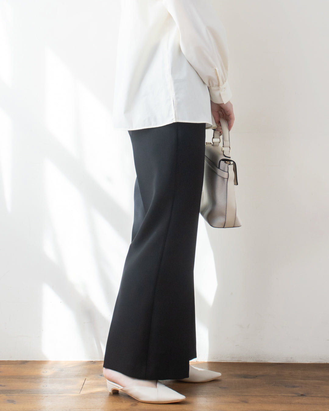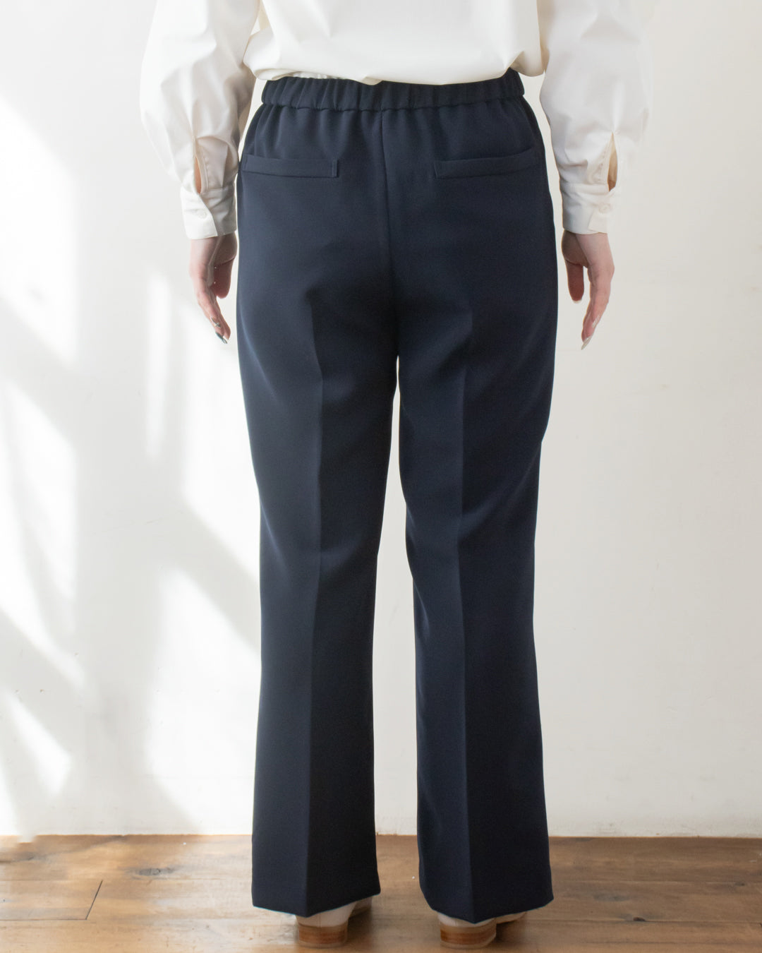 ■デザイン 高めのウエスト位置から広がるセミフレアシルエットで脚をすらっと長く見せてくれるおしゃれパンツ。 センタープレスが縦ラインを強調し、自然なスタイルアップを叶えます。 ストレッチ性のある綺麗見えダブルクロス素材を使用し、シワになりにくく、UVカット効果も◎ 前脇側からゴム仕様で楽な履き心地ながら、腰回りの張り感を軽減。 飾りポケットでヒップアップ効果もあり、セレモニーからデイリーまで幅広く活躍します。