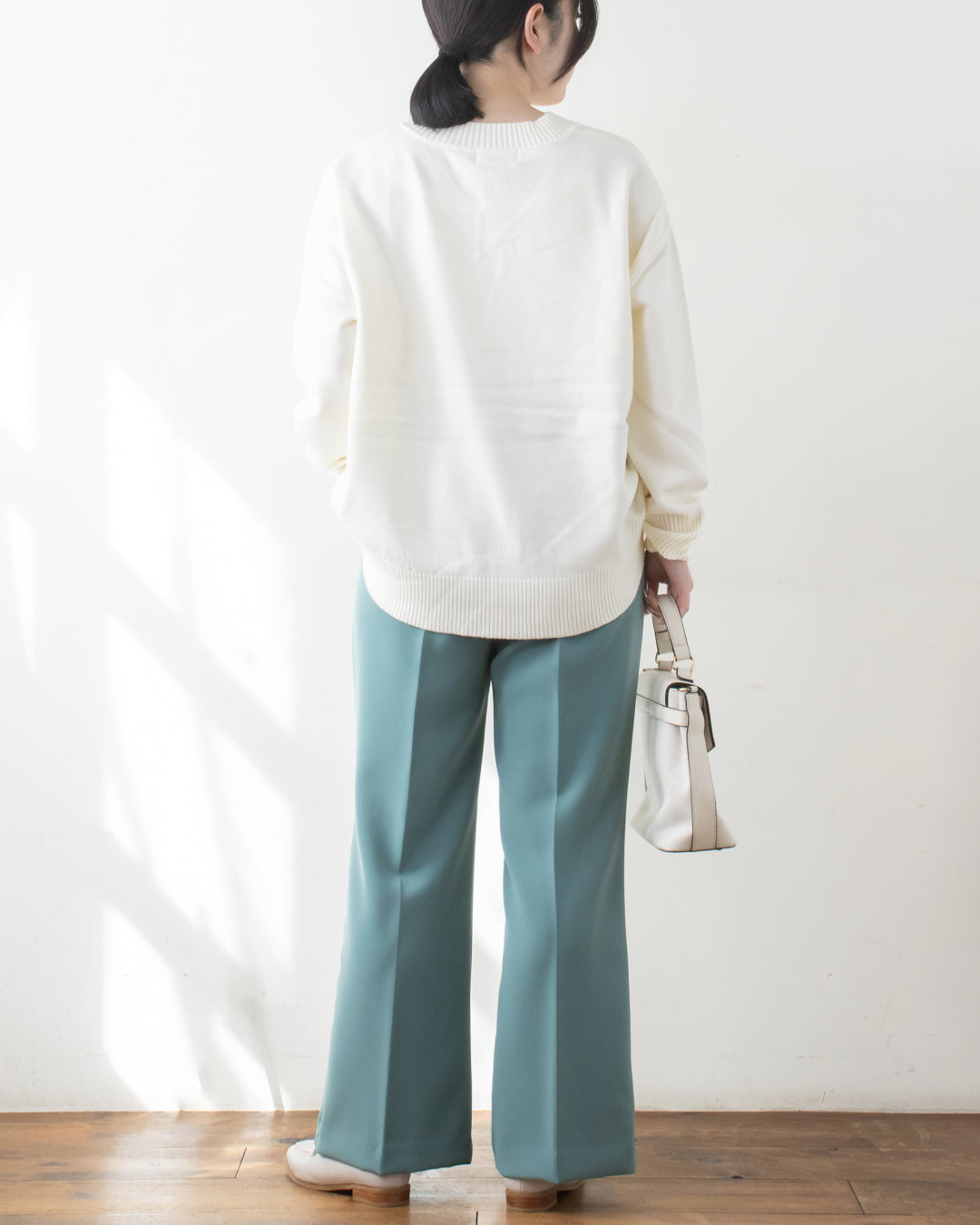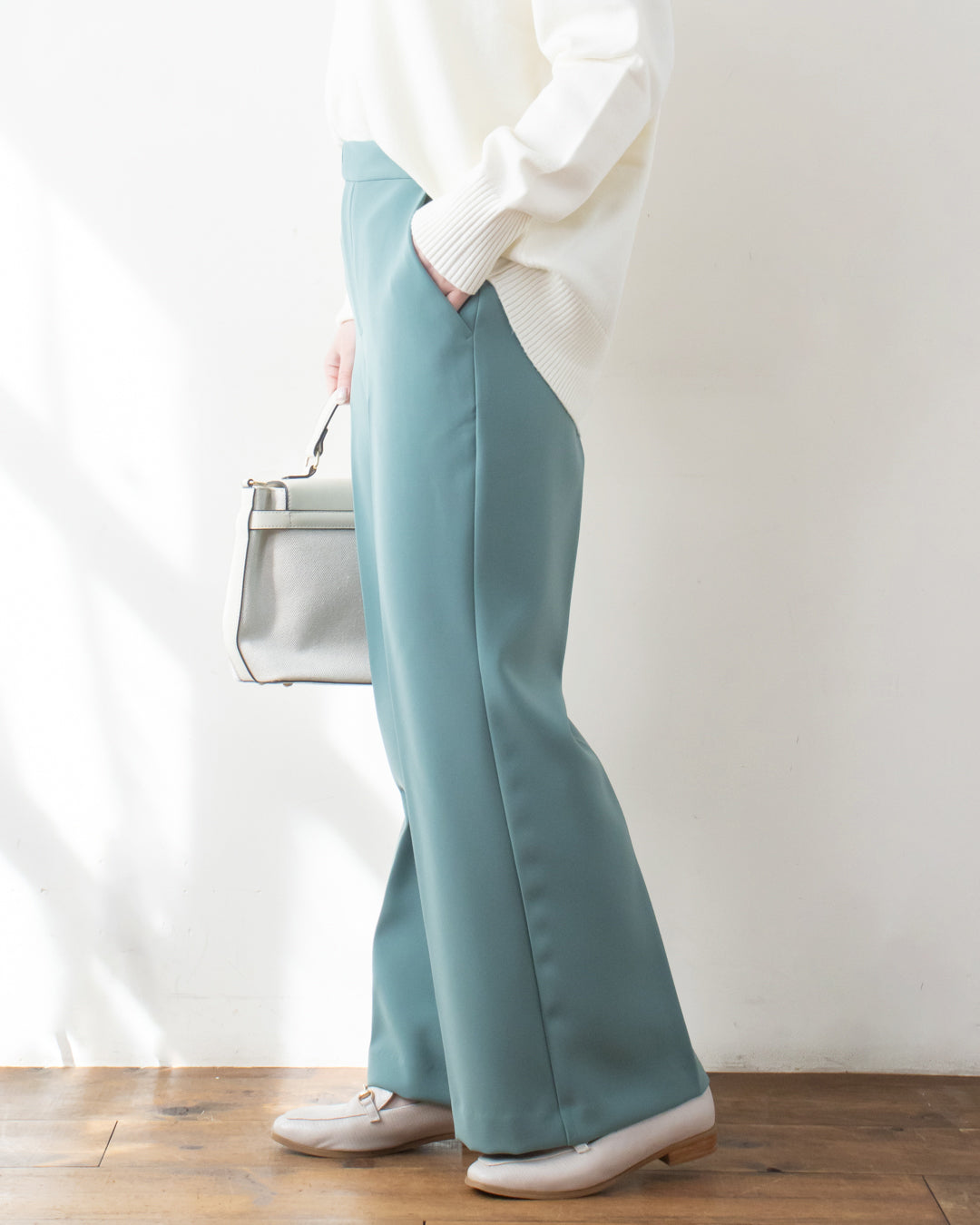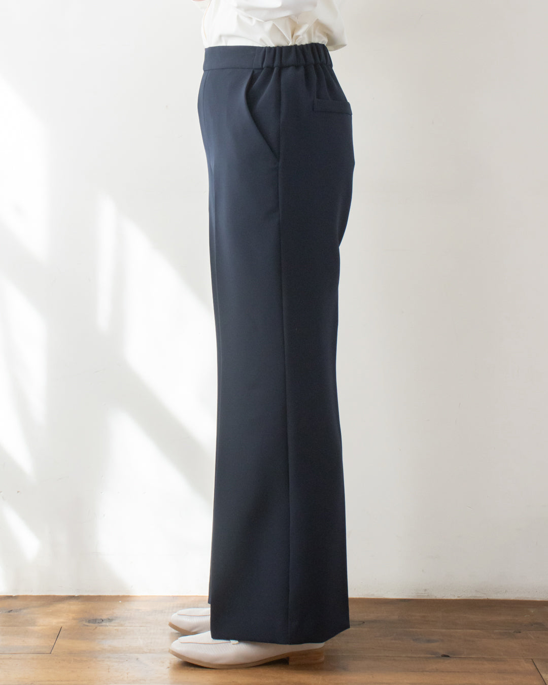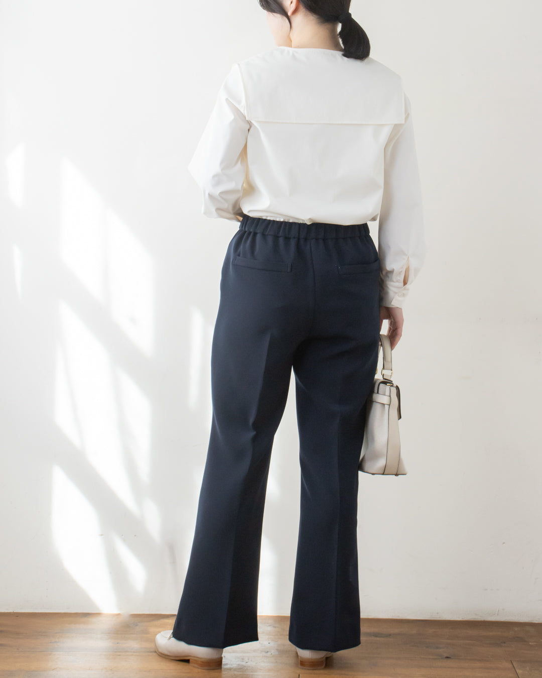 ■デザイン 高めのウエスト位置から広がるセミフレアシルエットで脚をすらっと長く見せてくれるおしゃれパンツ。 センタープレスが縦ラインを強調し、自然なスタイルアップを叶えます。 ストレッチ性のある綺麗見えダブルクロス素材を使用し、シワになりにくく、UVカット効果も◎ 前脇側からゴム仕様で楽な履き心地ながら、腰回りの張り感を軽減。 飾りポケットでヒップアップ効果もあり、セレモニーからデイリーまで幅広く活躍します。