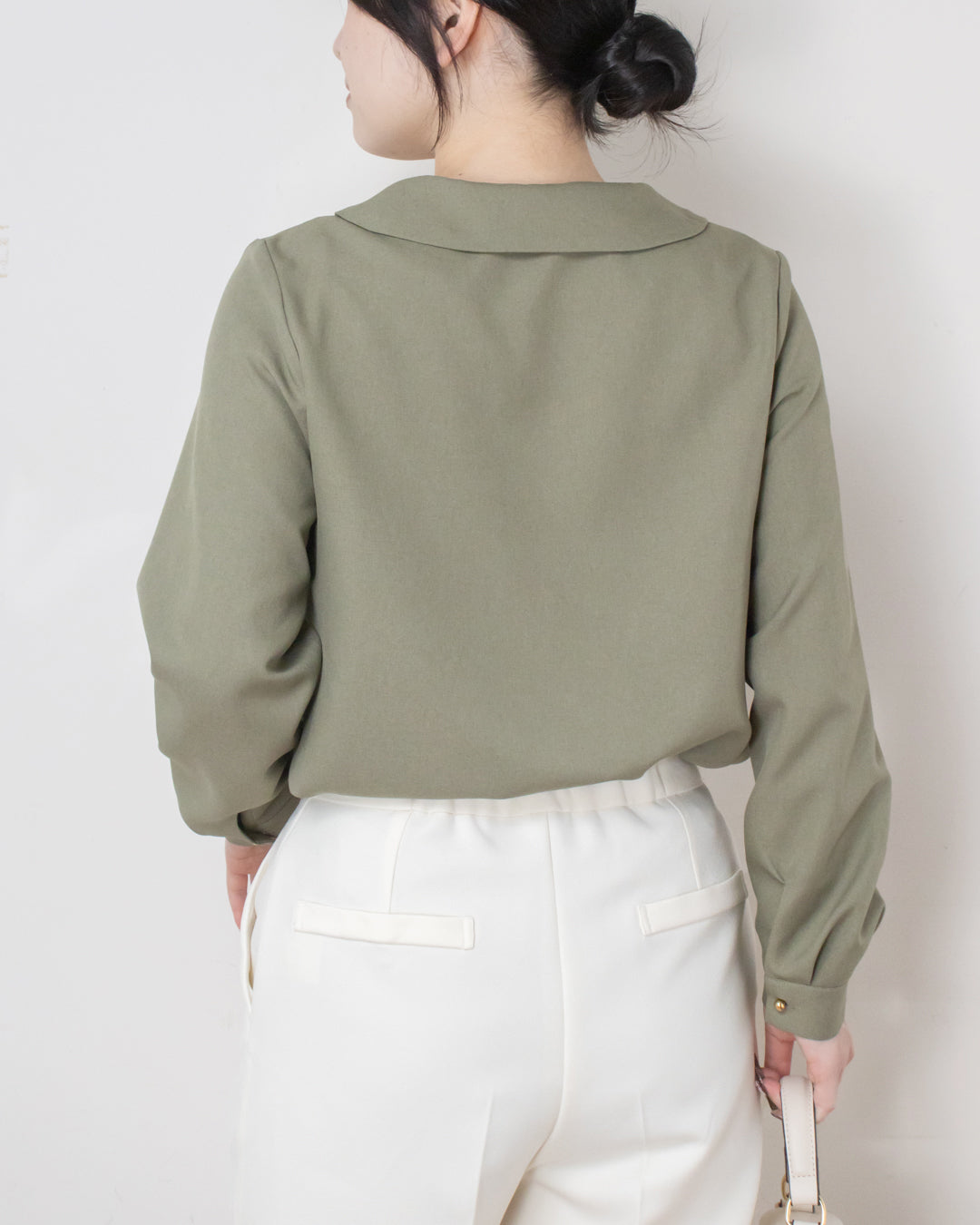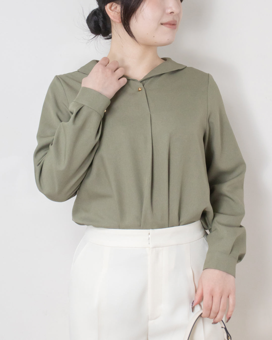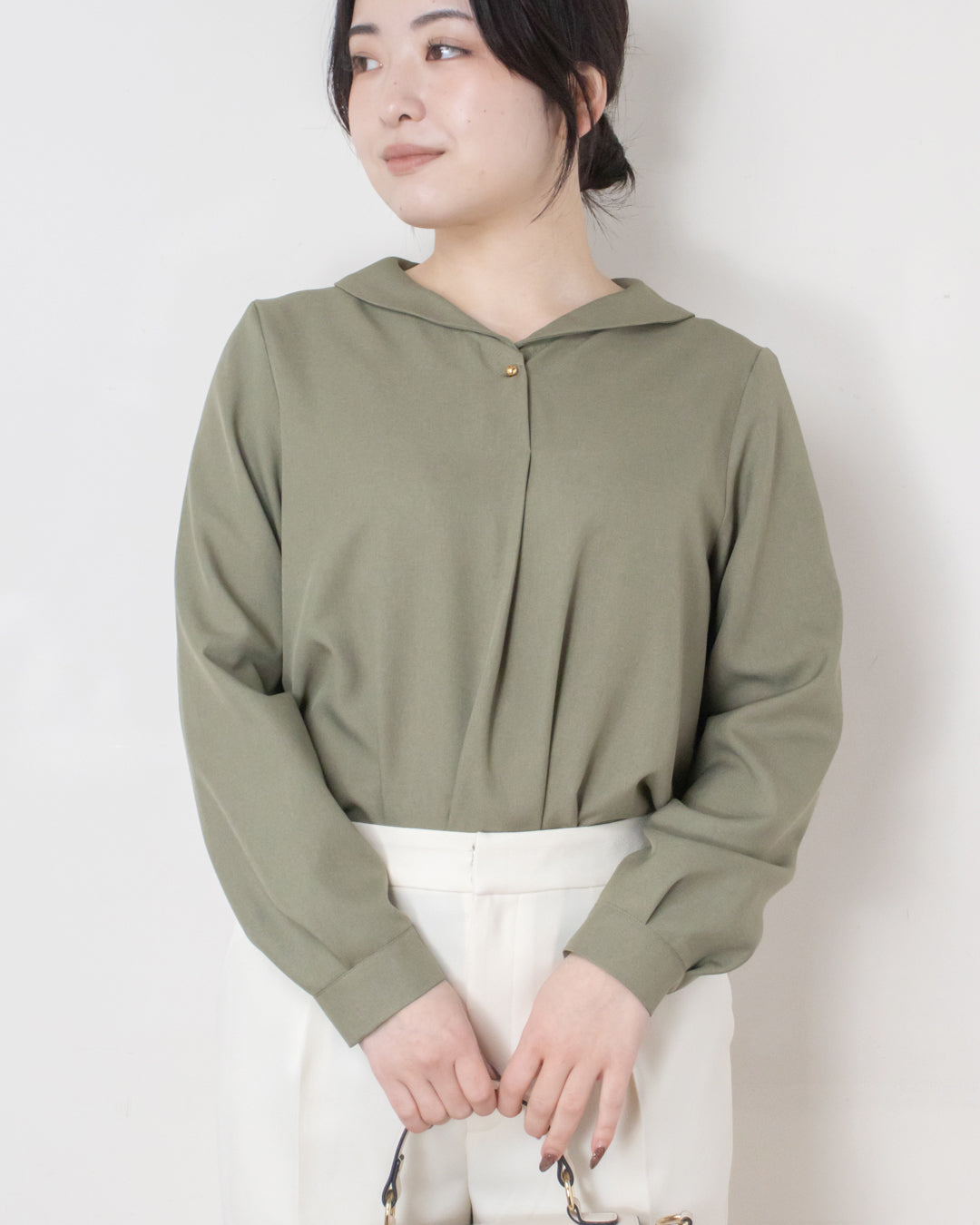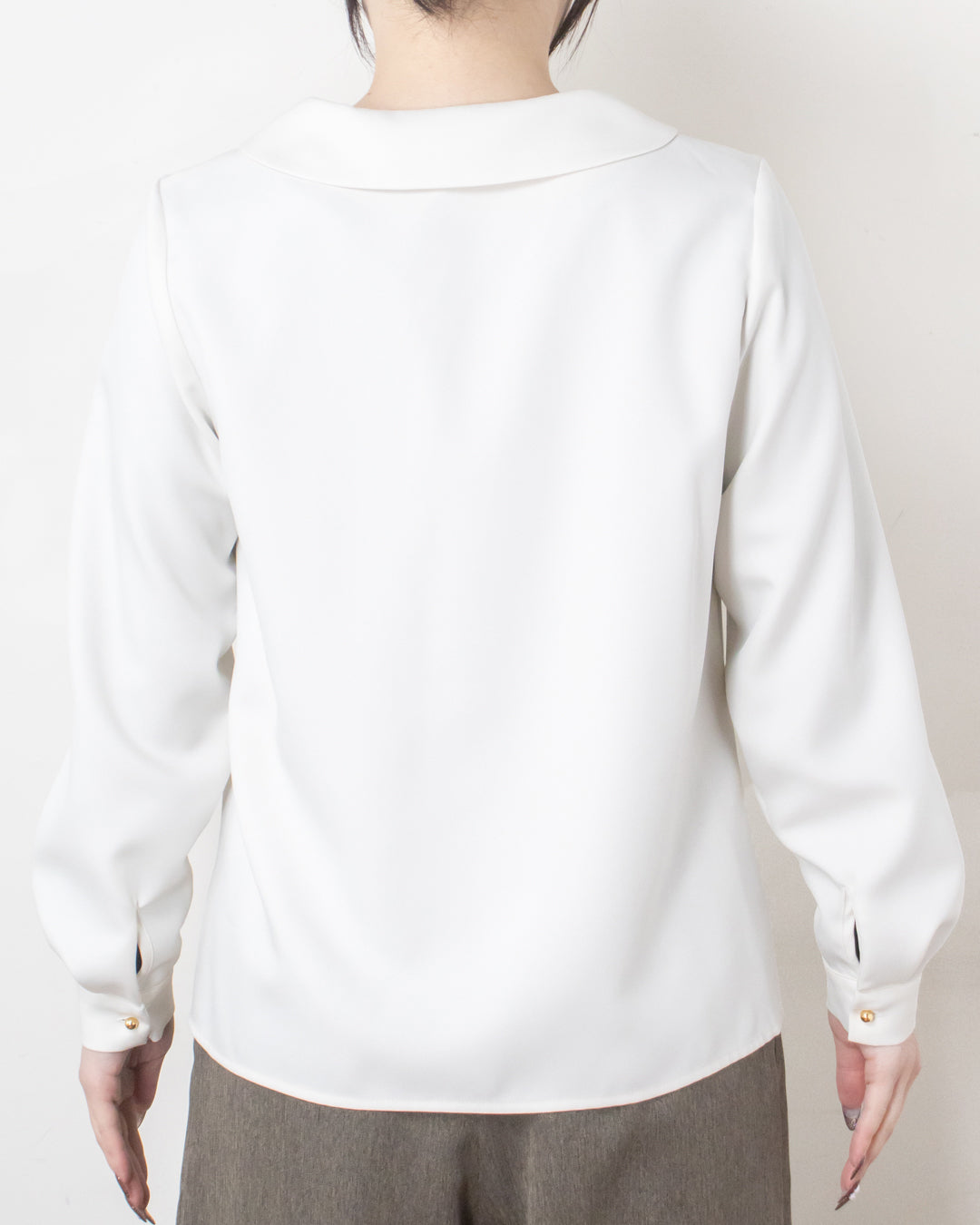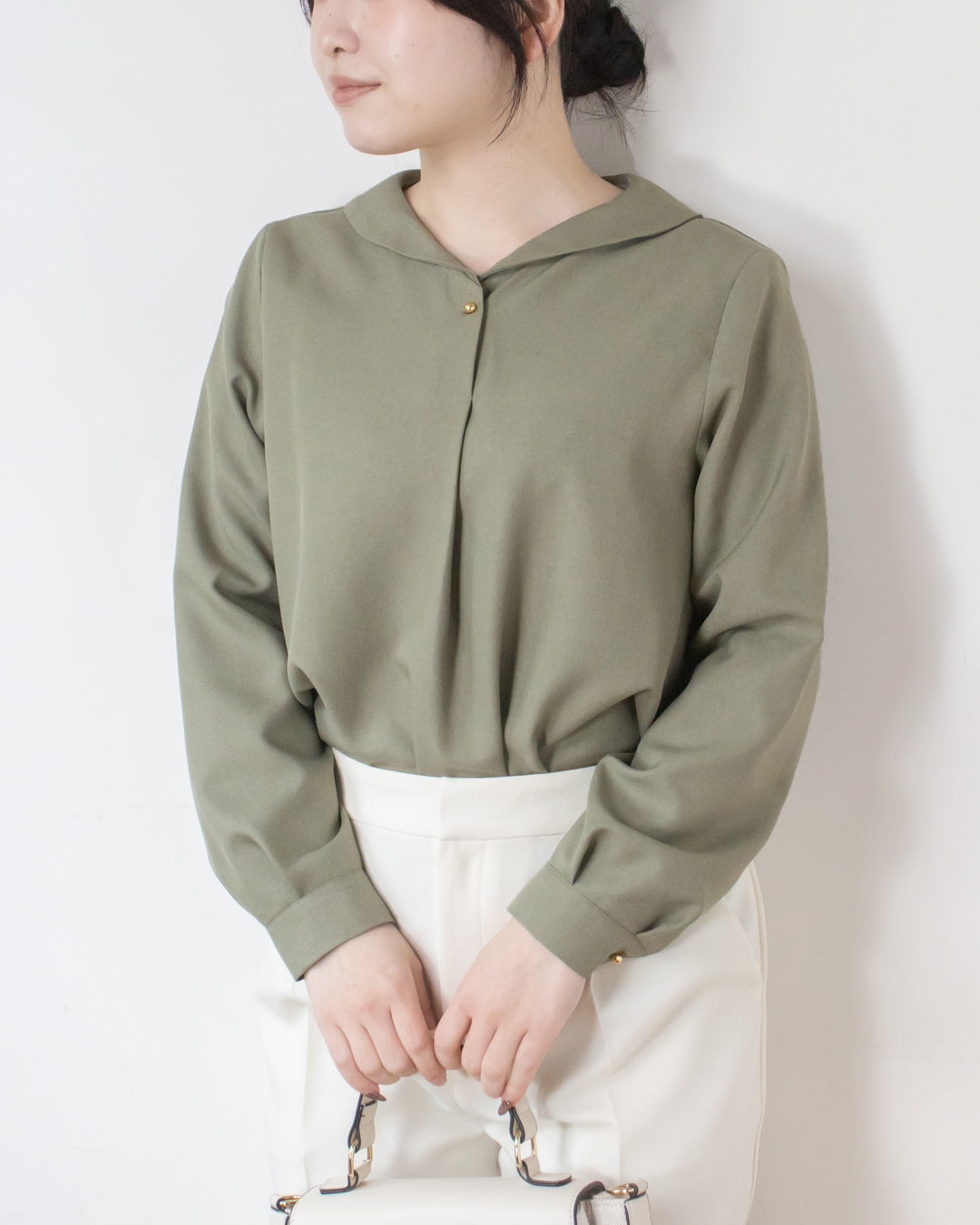 ■デザイン 小さめショールカラーが上品な印象のシンプルブラウス。 前あき仕様で、さりげなく目を引く球体の金ボタンがアクセントになります。 厚手のポリエステル素材を使用しており、シワになりにくくイージーケアなのも嬉しいポイント。 きれいめな雰囲気でお仕事シーンにも取り入れやすく、ジャケットインにも使える便利な一枚です。