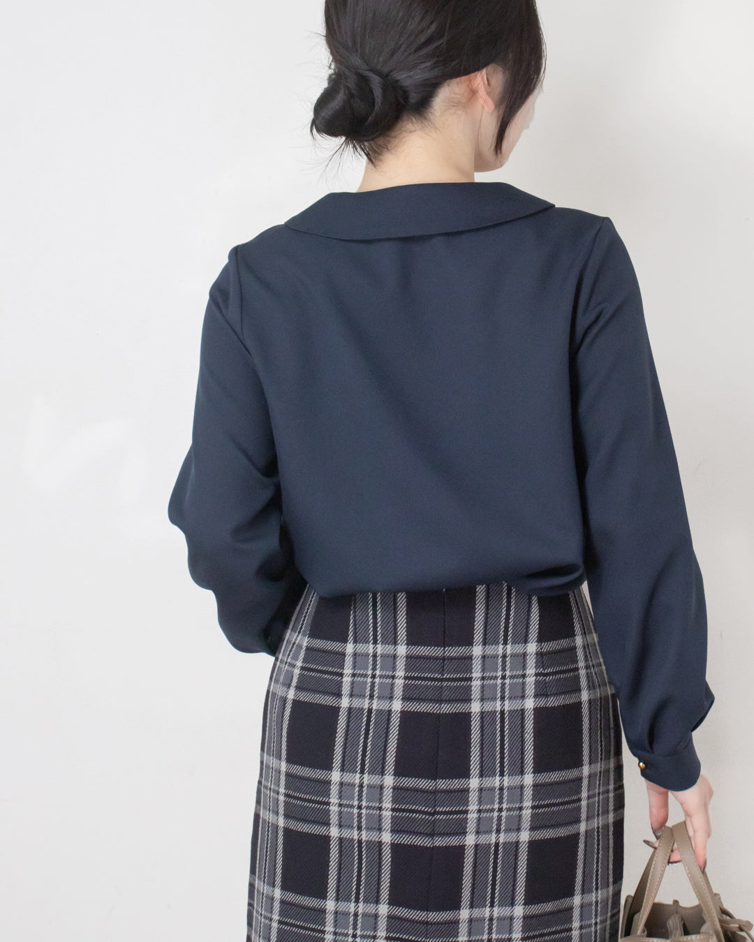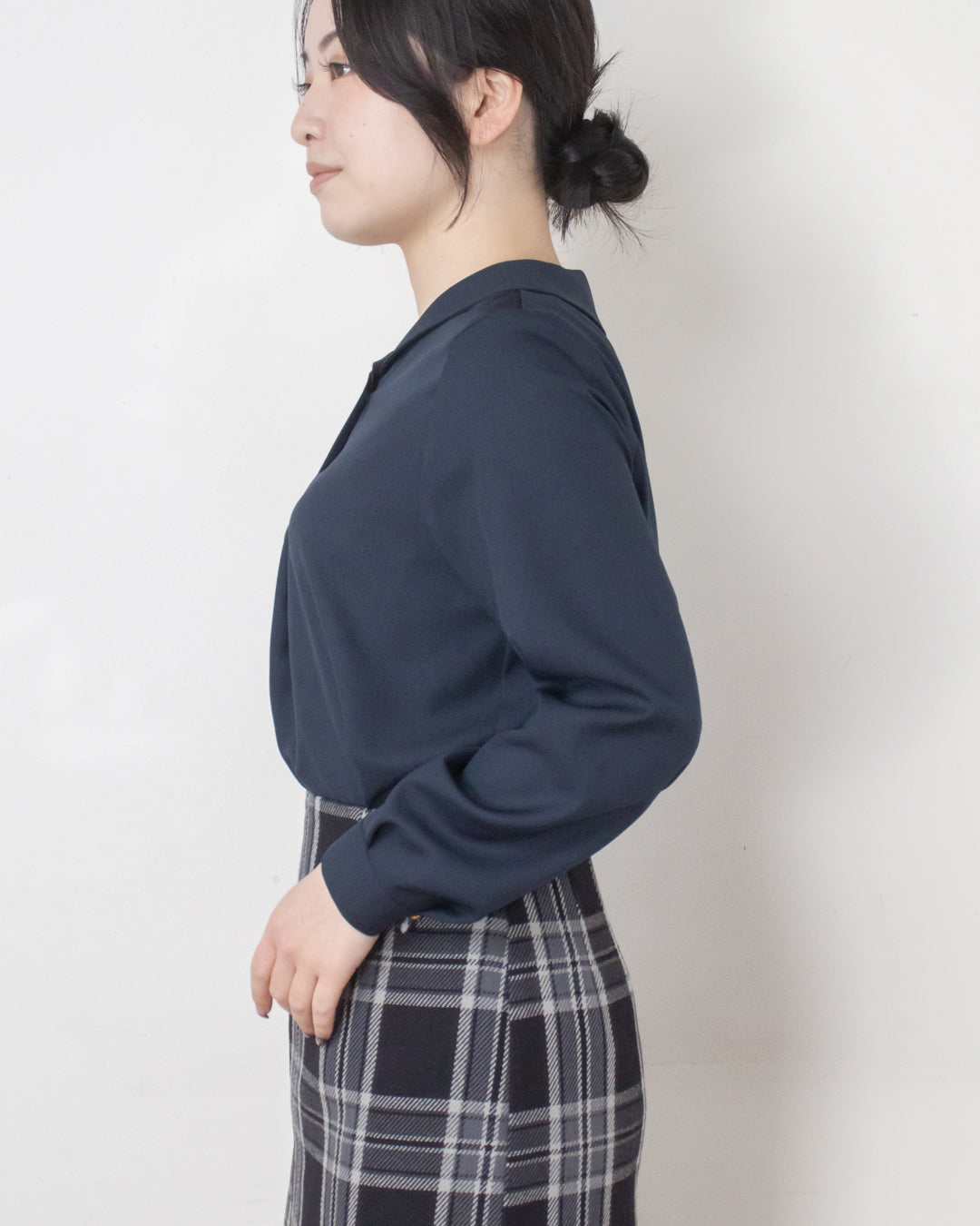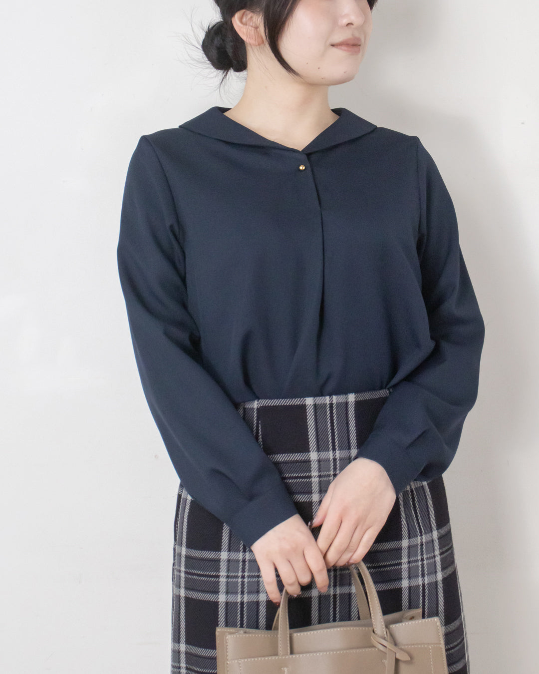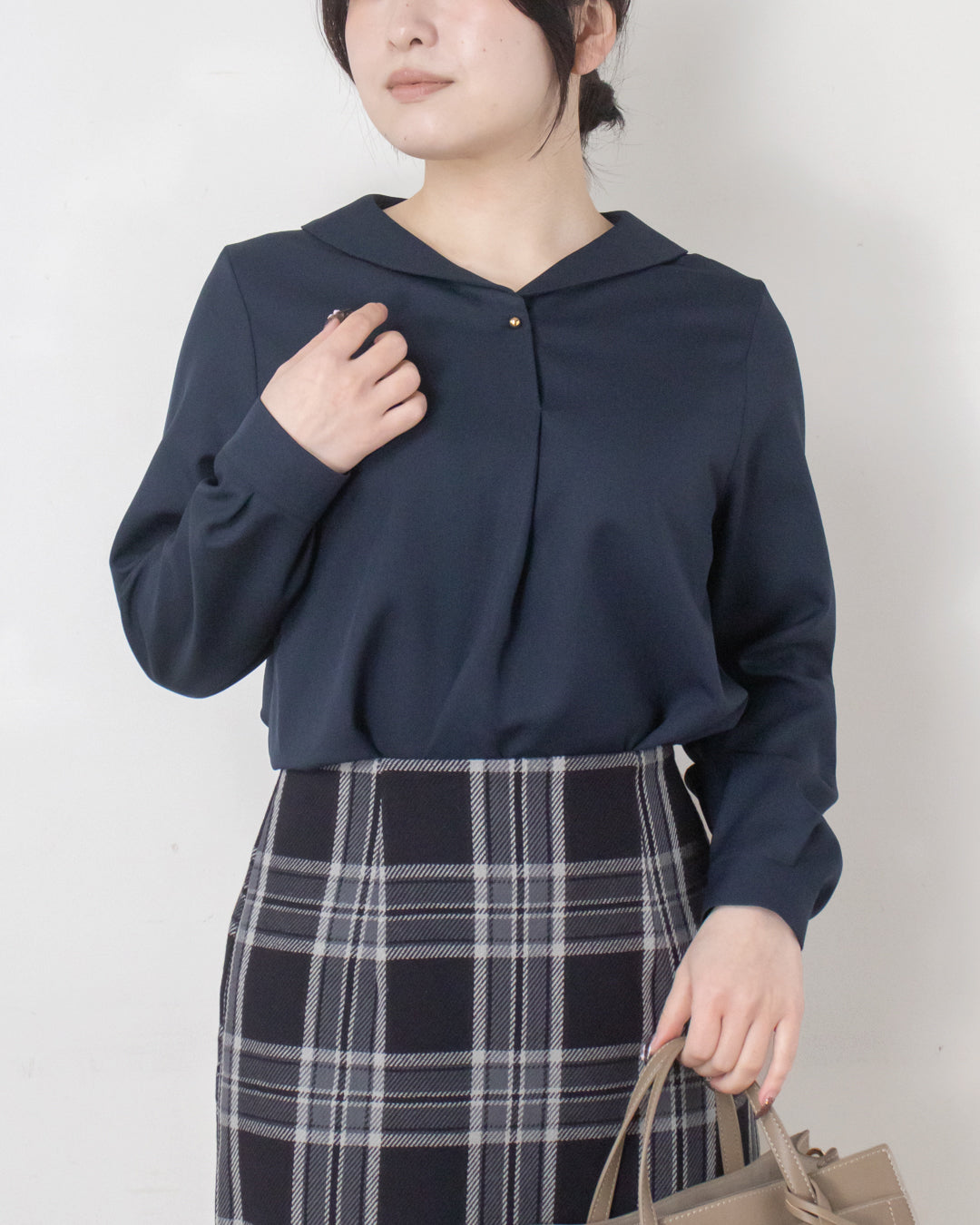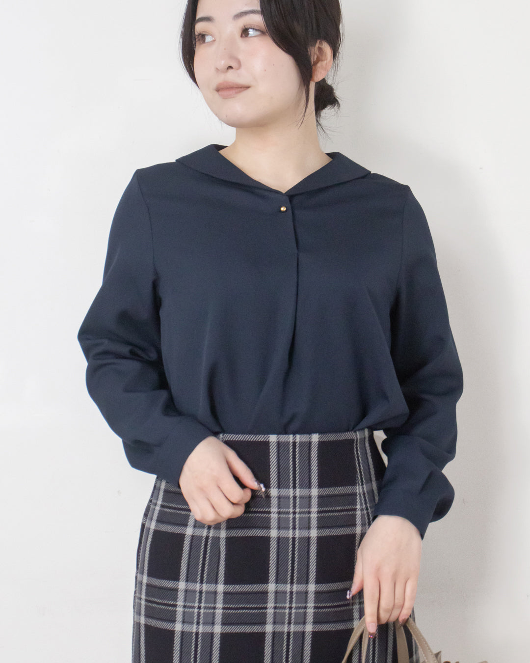■デザイン 小さめショールカラーが上品な印象のシンプルブラウス。 前あき仕様で、さりげなく目を引く球体の金ボタンがアクセントになります。 厚手のポリエステル素材を使用しており、シワになりにくくイージーケアなのも嬉しいポイント。 きれいめな雰囲気でお仕事シーンにも取り入れやすく、ジャケットインにも使える便利な一枚です。