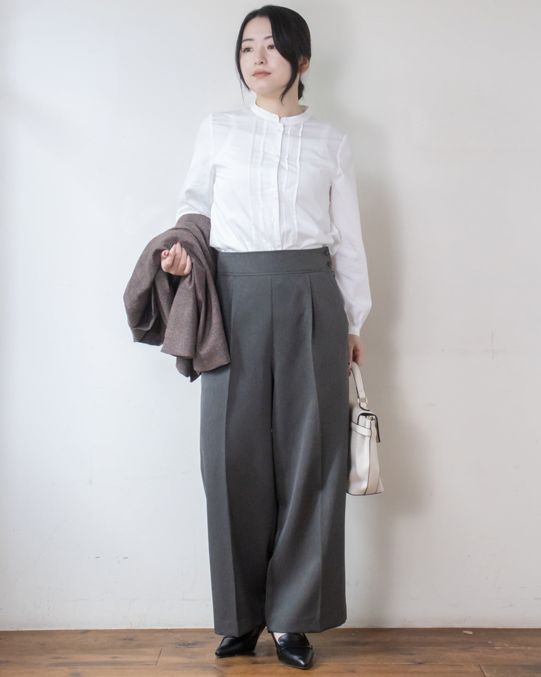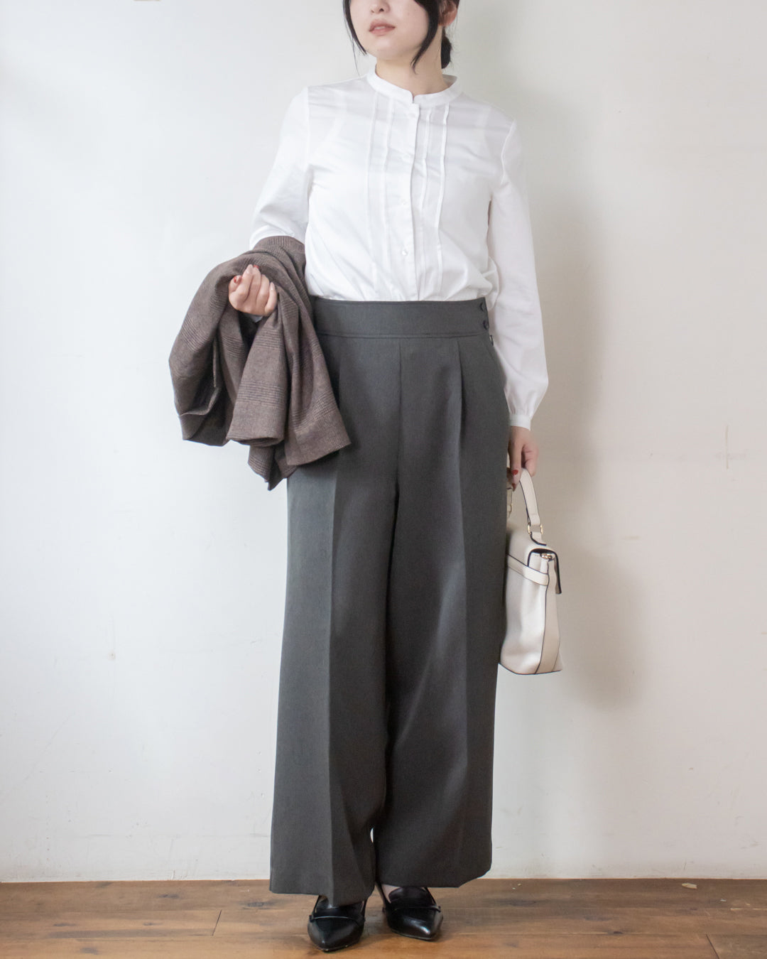 ■コーディネート ・コットンライクロールカラーブラウス ・パウダリーシャーリングシャツ ・2WAYシャーリングブラウス