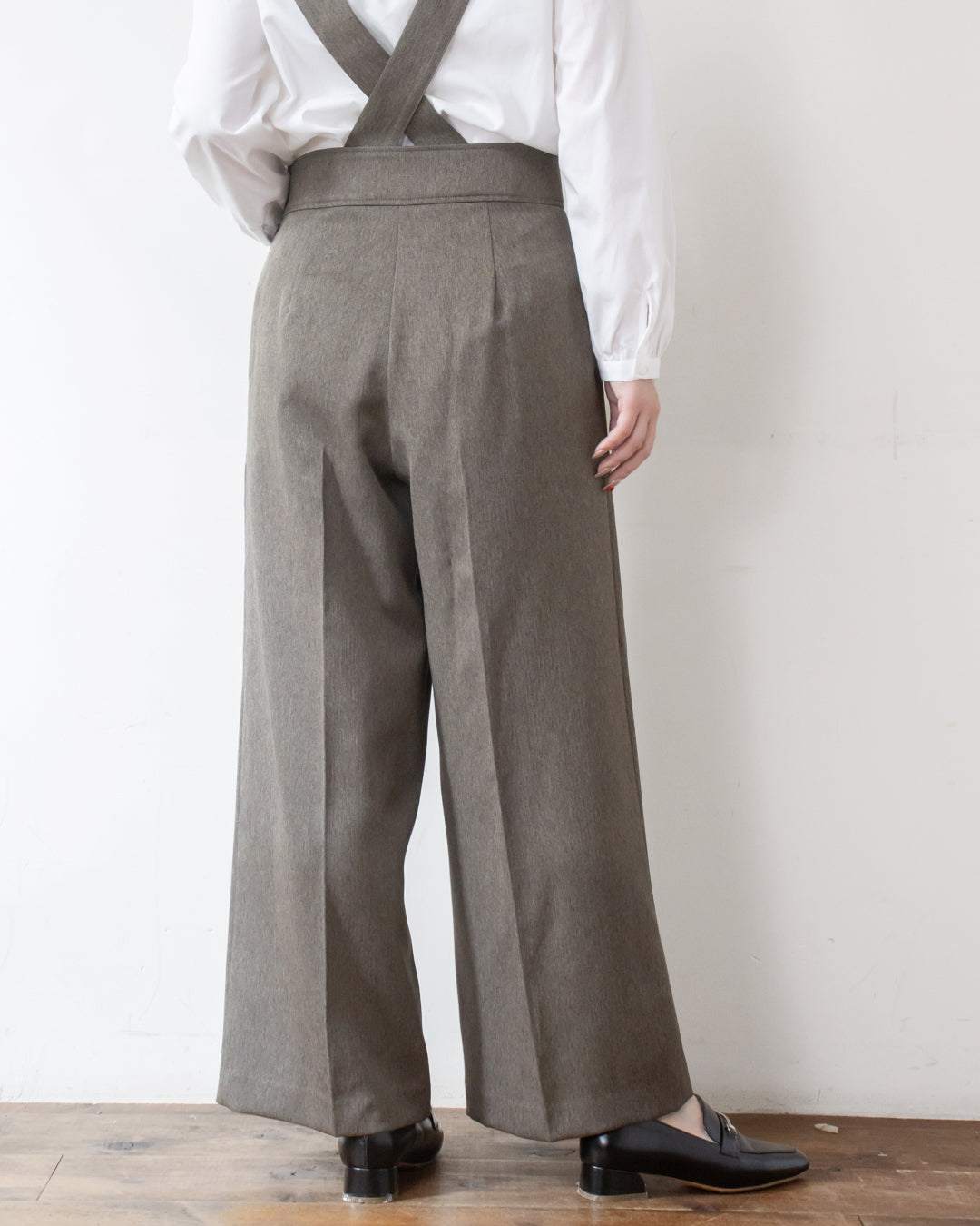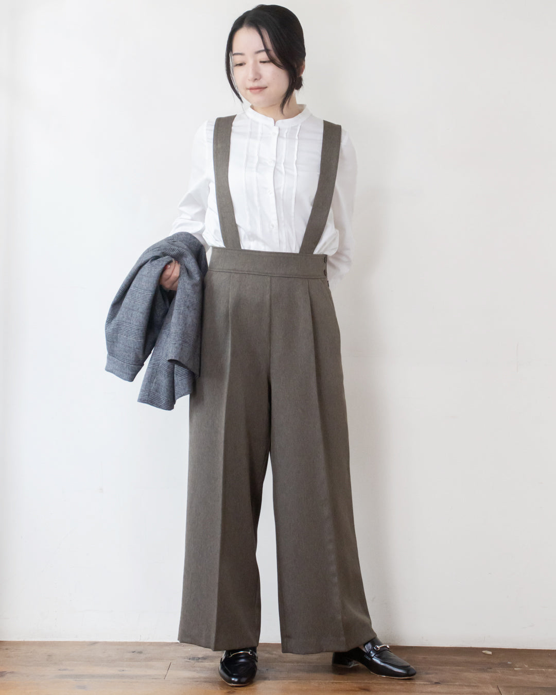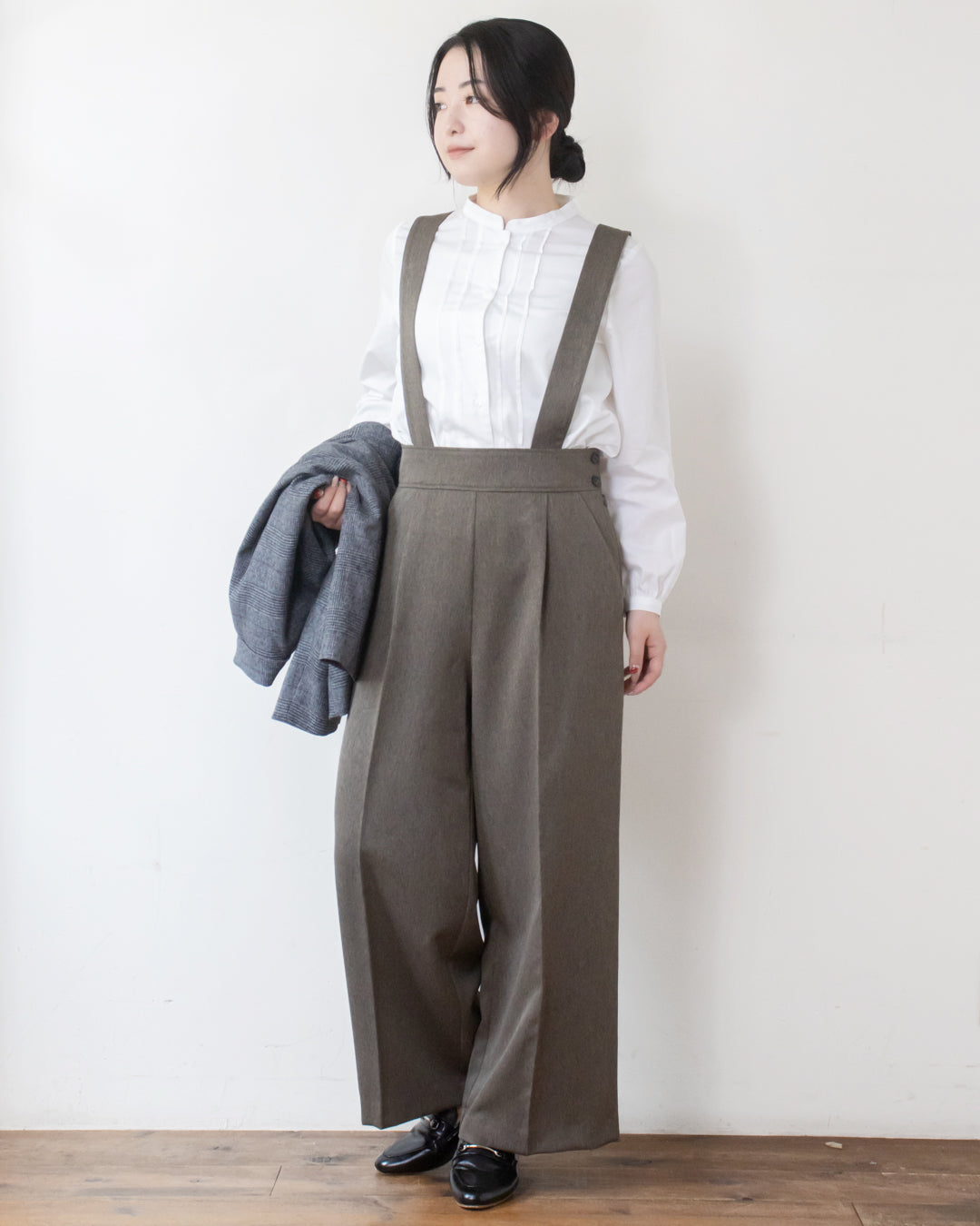 ■デザイン 小さめのへリンボン柄が大人可愛い吊りパンツ。 吊り紐はボタンホール付きで長さ調節が出来、さらに取り外し可能なのでパンツ単体としても着用いただけます。 太めのウエストベルトとセンタープレスがスタイルをきれいに見せてくれるのも嬉しいポイント。 サイドのボタンがさりげないアクセントになり、シンプルながらもおしゃれ感をプラス。 ポリエステル素材なのでシワになりにくくお手入れしやすいのも魅力です。