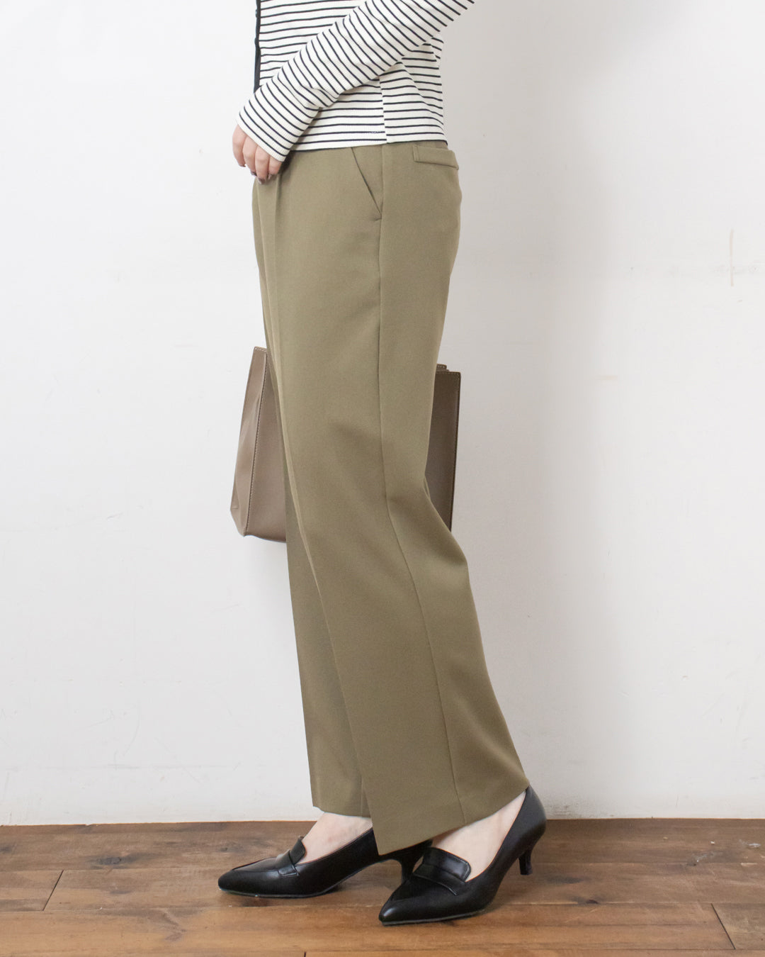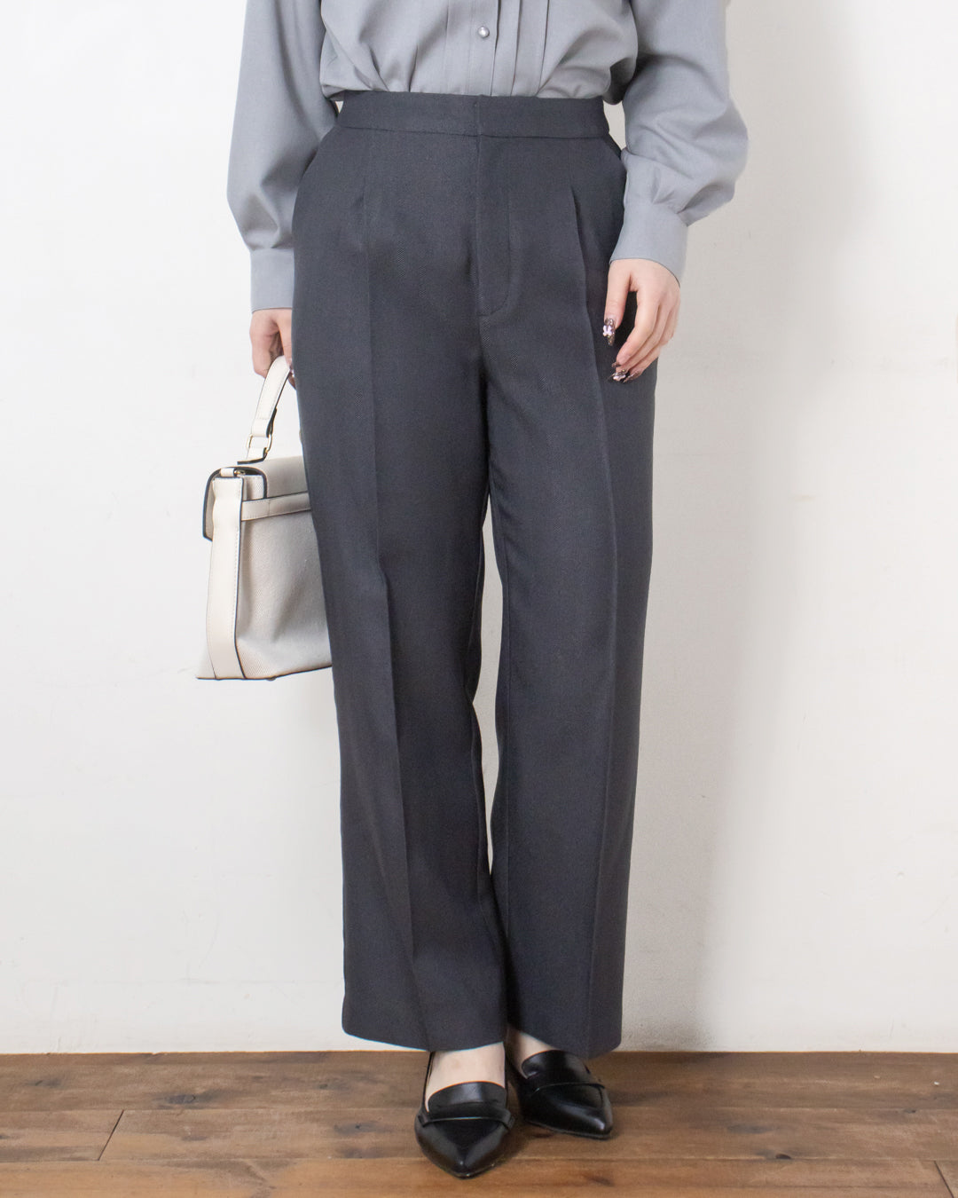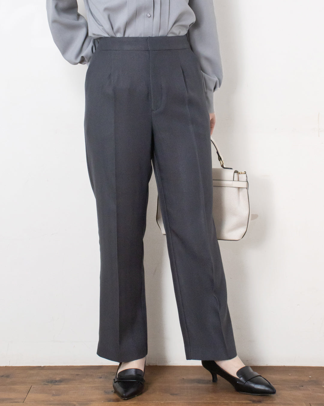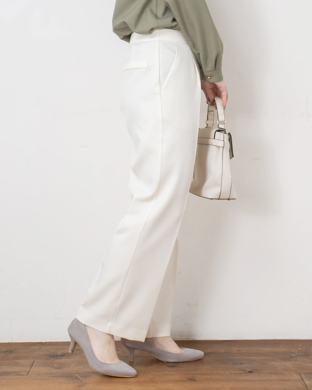 ■デザイン ウールライクな厚手ポリエステル素材を使用したセンタープレスパンツ。 ベーシックなストレートシルエットでトップスを選ばない1着です。 後ろ側にはダミーの箱ポケットがついており、ヒップアップ効果も◎ 後ろは部分ゴムが入っており、多少のゆとりが嬉しいポイントです。