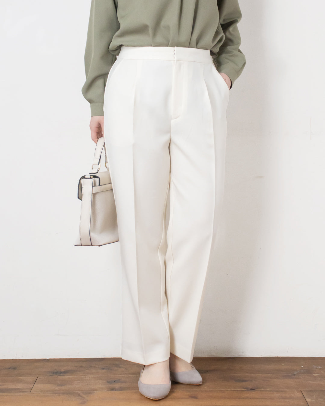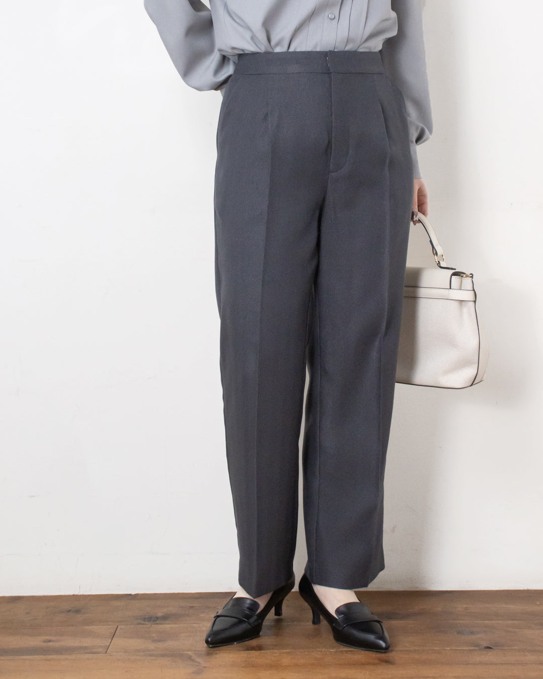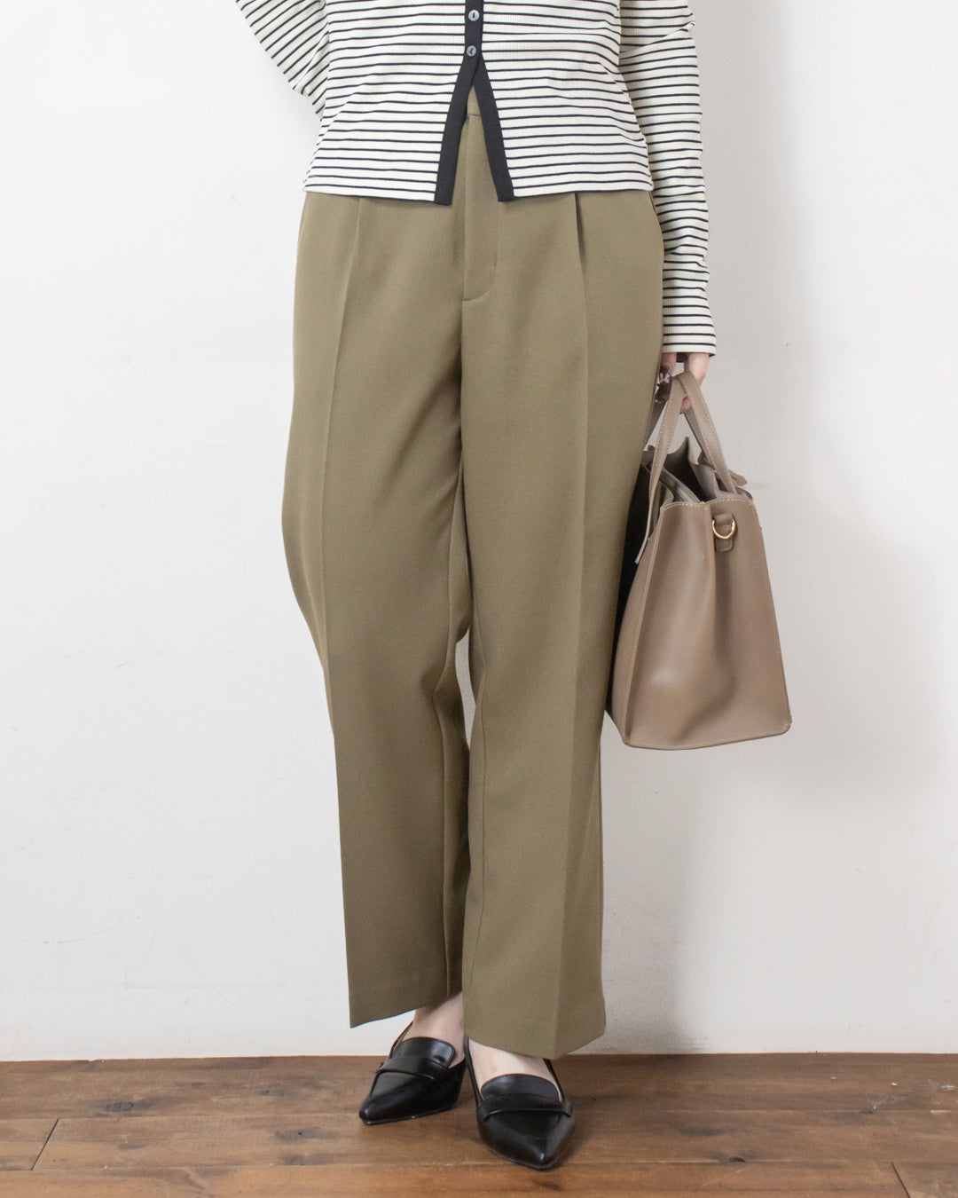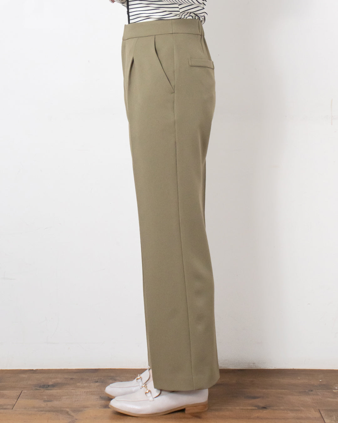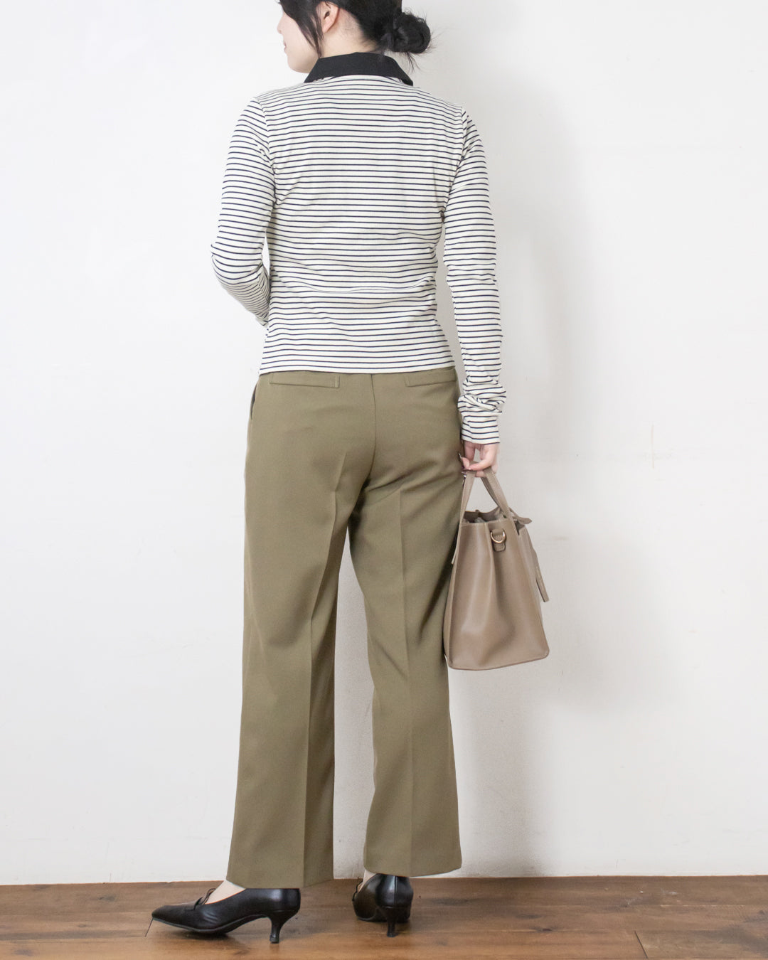 ■デザイン ウールライクな厚手ポリエステル素材を使用したセンタープレスパンツ。 ベーシックなストレートシルエットでトップスを選ばない1着です。 後ろ側にはダミーの箱ポケットがついており、ヒップアップ効果も◎ 後ろは部分ゴムが入っており、多少のゆとりが嬉しいポイントです。