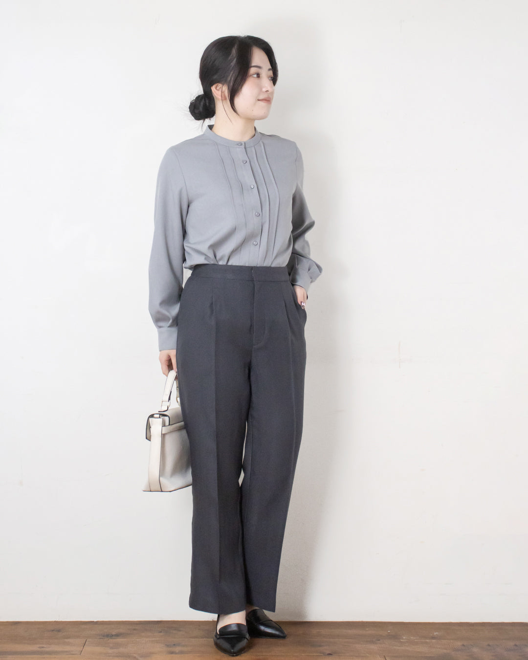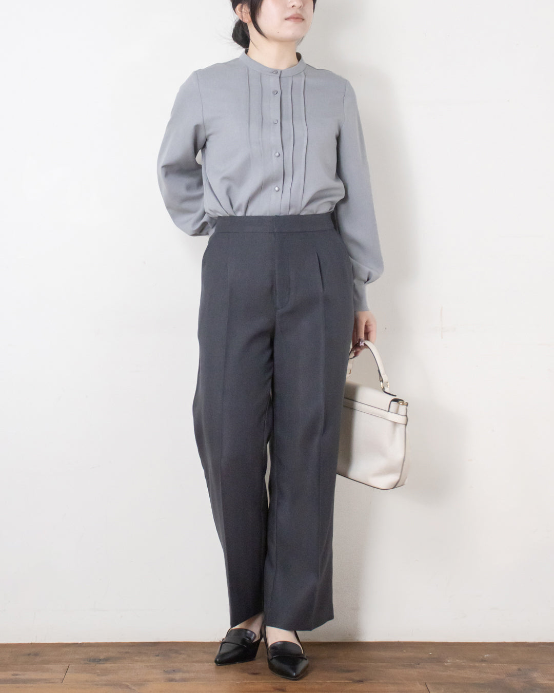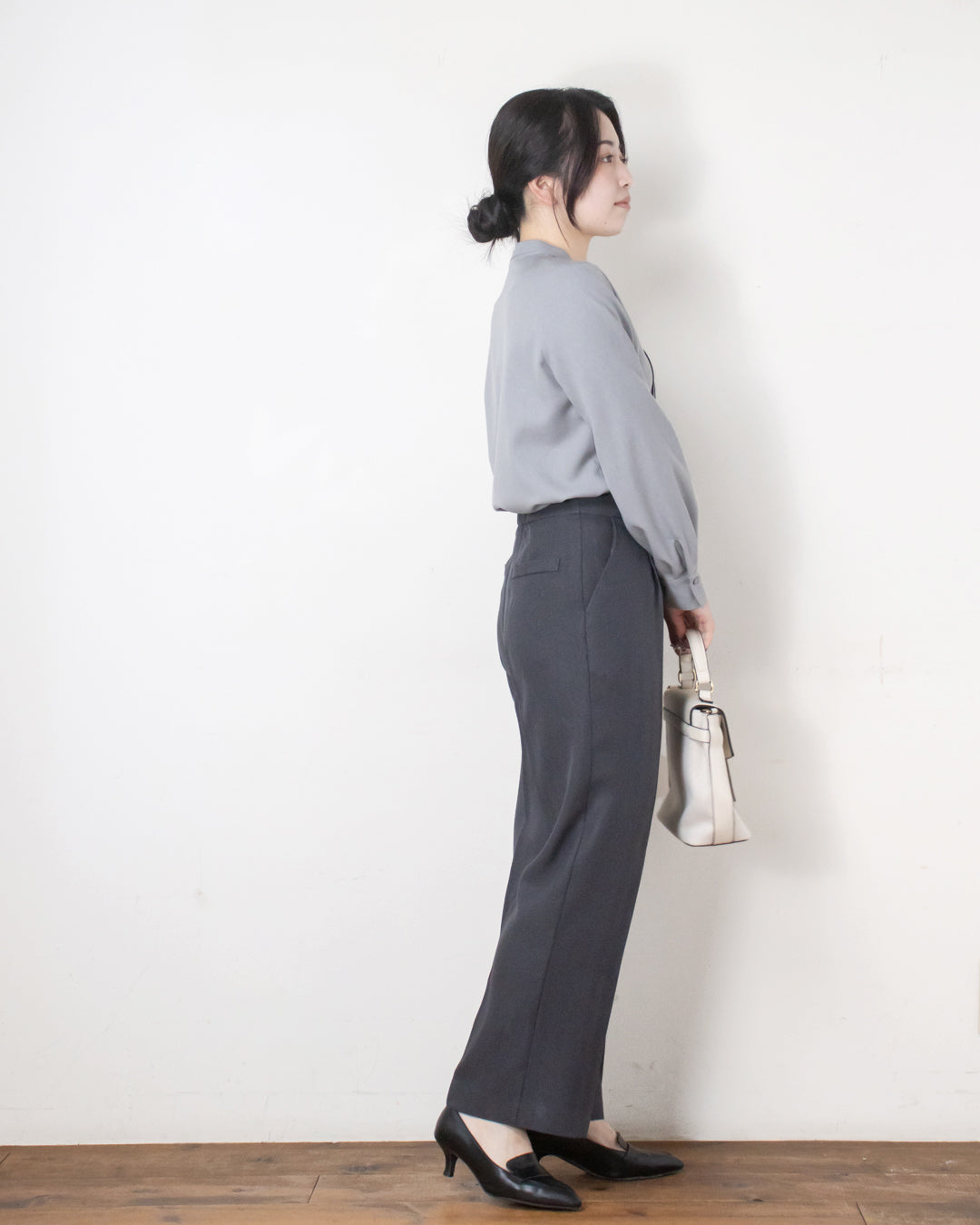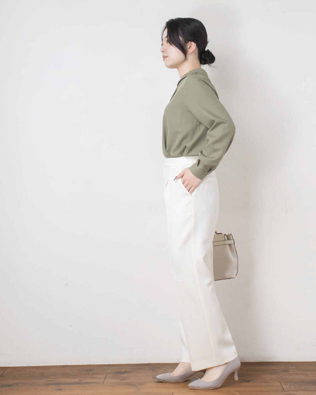 ■デザイン ウールライクな厚手ポリエステル素材を使用したセンタープレスパンツ。 ベーシックなストレートシルエットでトップスを選ばない1着です。 後ろ側にはダミーの箱ポケットがついており、ヒップアップ効果も◎ 後ろは部分ゴムが入っており、多少のゆとりが嬉しいポイントです。