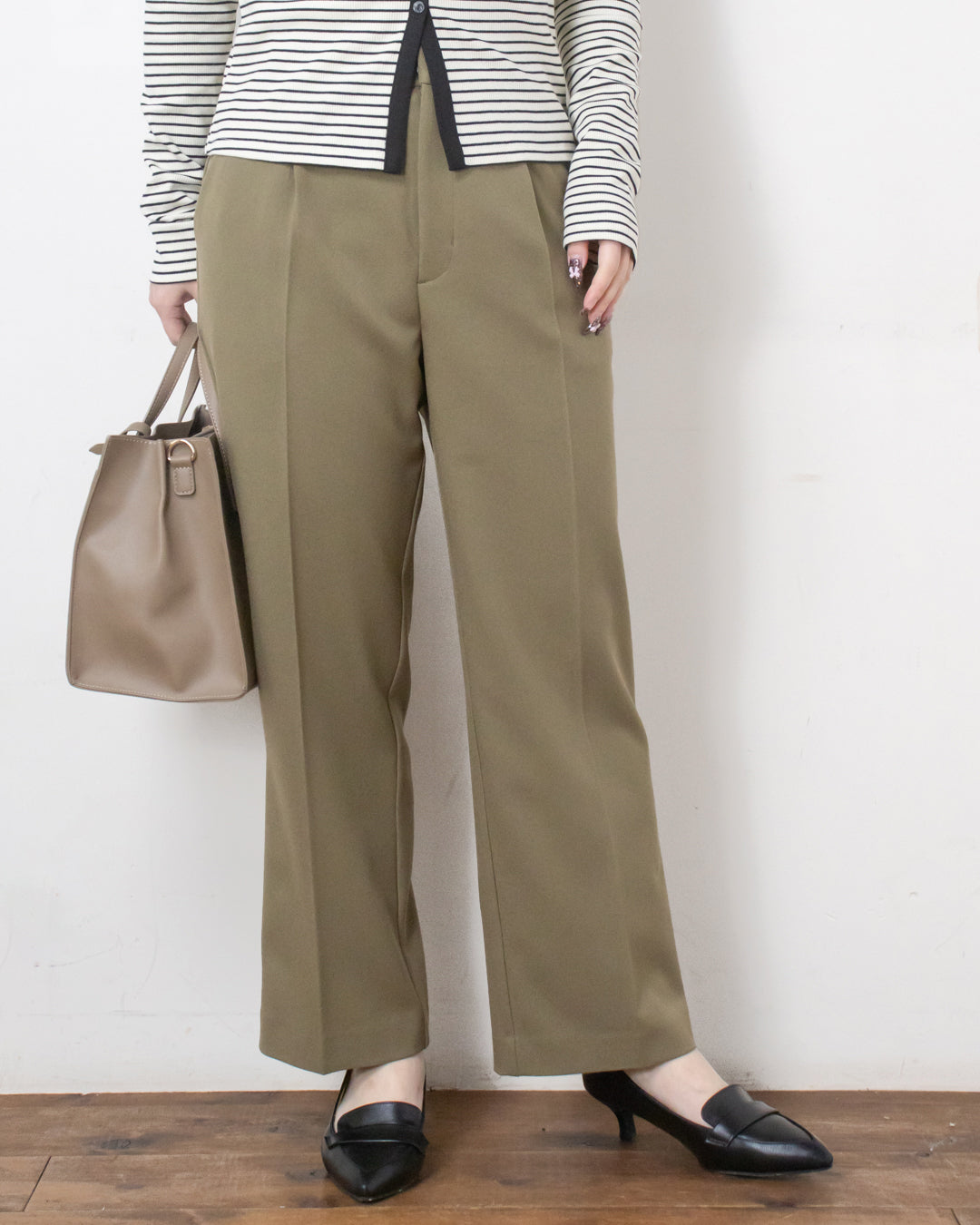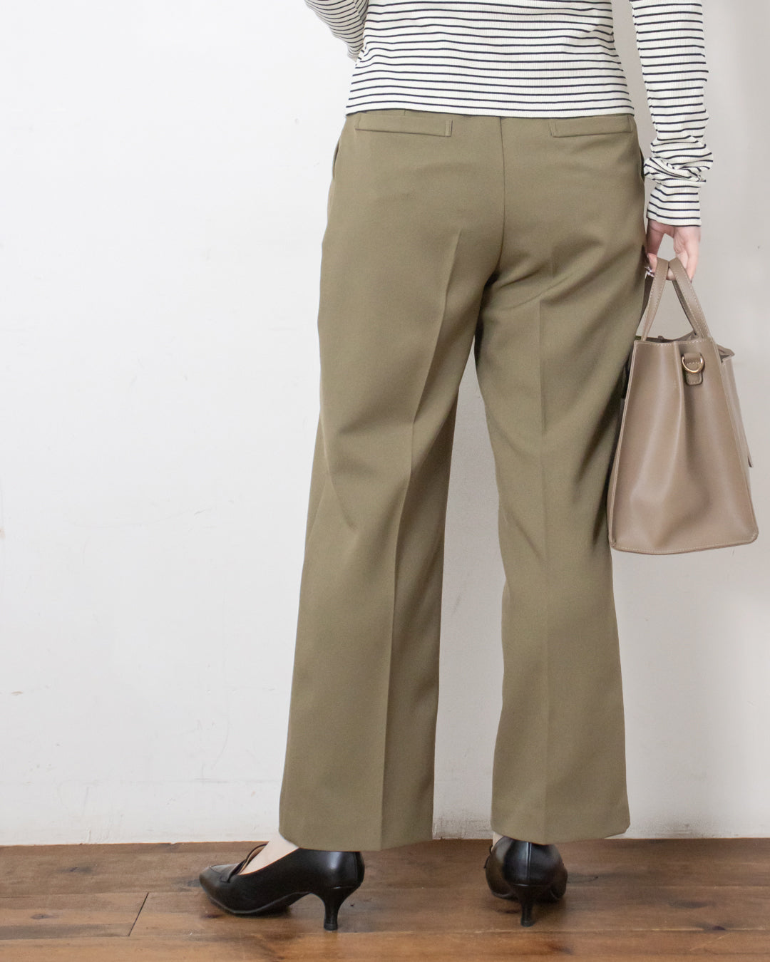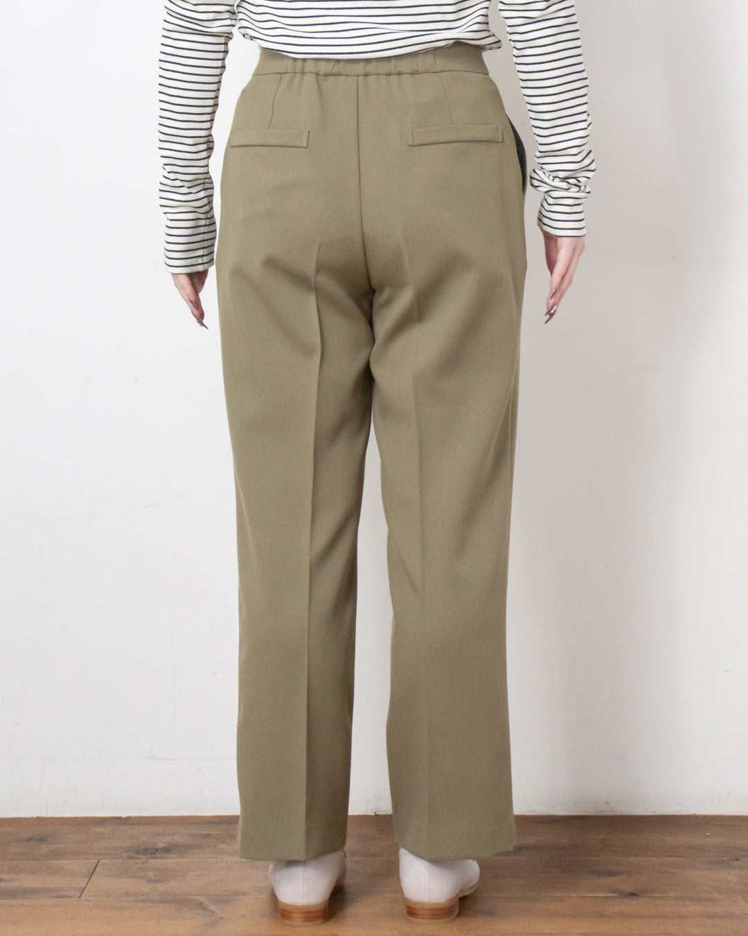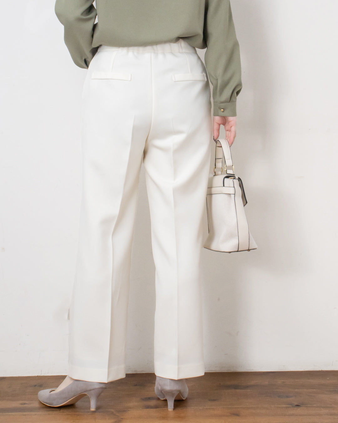 ■ポイント ・秋冬向けの厚手ポリエステル生地を使用しており、お手入れ簡単 ・ベーシックな合わせやすいシルエットが魅力 ・後ろにはダミーの箱ポケット付きでヒップアップ効果 ・後ろ部分ゴムで少しのゆとり感が嬉しいポイント ・センタープレスが縦のシルエットを強調