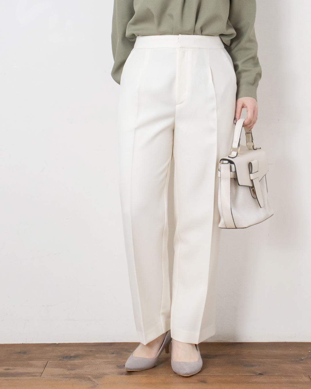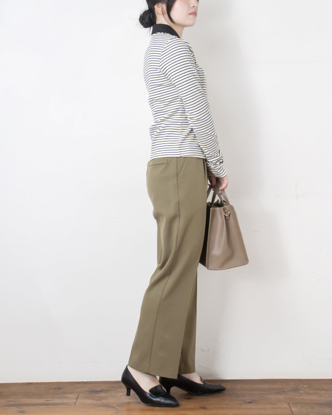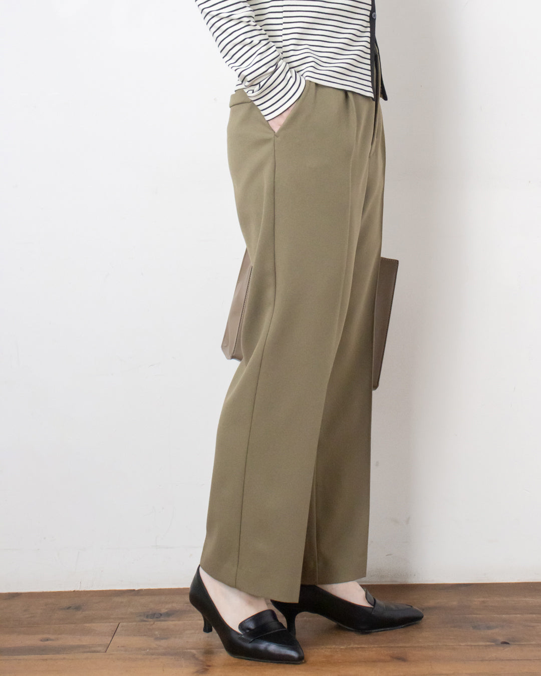 ■ポイント ・秋冬向けの厚手ポリエステル生地を使用しており、お手入れ簡単 ・ベーシックな合わせやすいシルエットが魅力 ・後ろにはダミーの箱ポケット付きでヒップアップ効果 ・後ろ部分ゴムで少しのゆとり感が嬉しいポイント ・センタープレスが縦のシルエットを強調