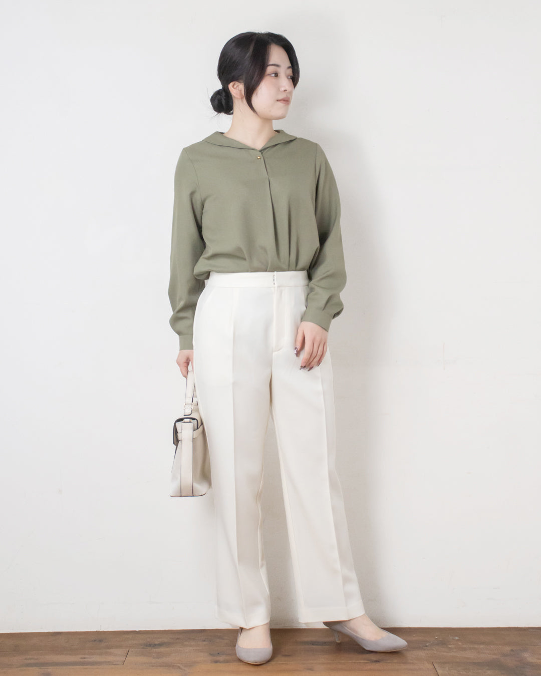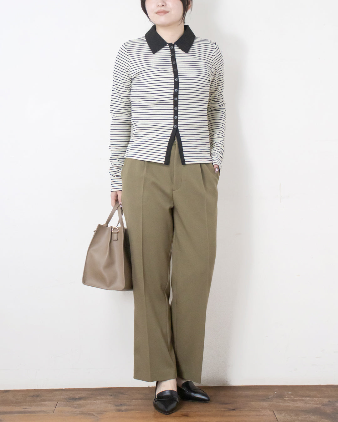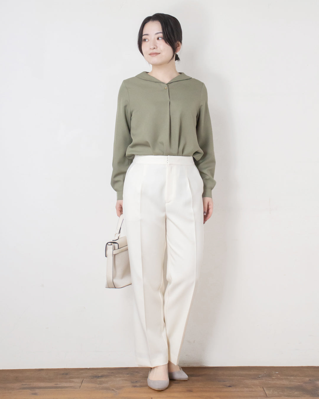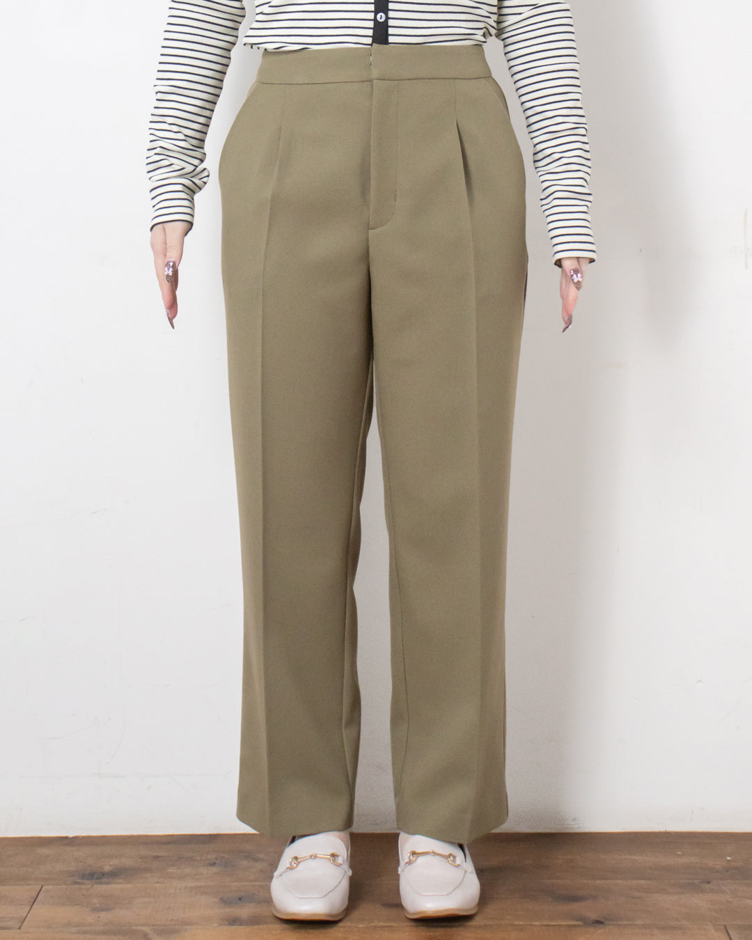 ■ポイント ・秋冬向けの厚手ポリエステル生地を使用しており、お手入れ簡単 ・ベーシックな合わせやすいシルエットが魅力 ・後ろにはダミーの箱ポケット付きでヒップアップ効果 ・後ろ部分ゴムで少しのゆとり感が嬉しいポイント ・センタープレスが縦のシルエットを強調
