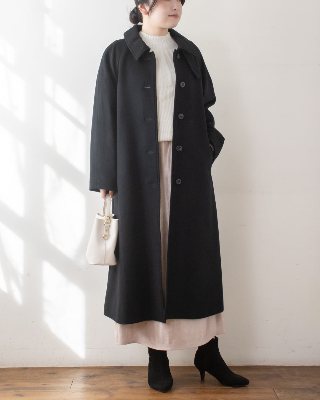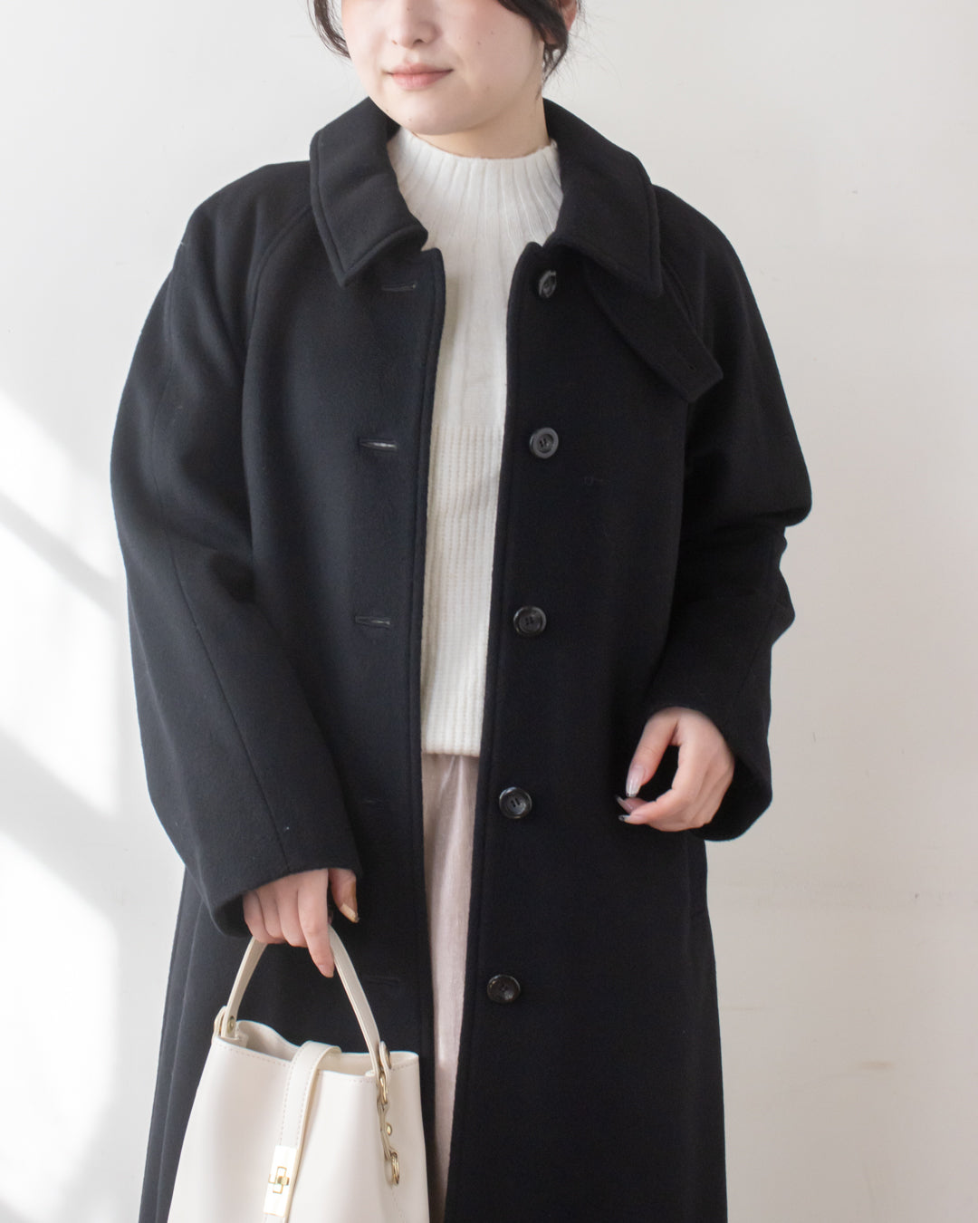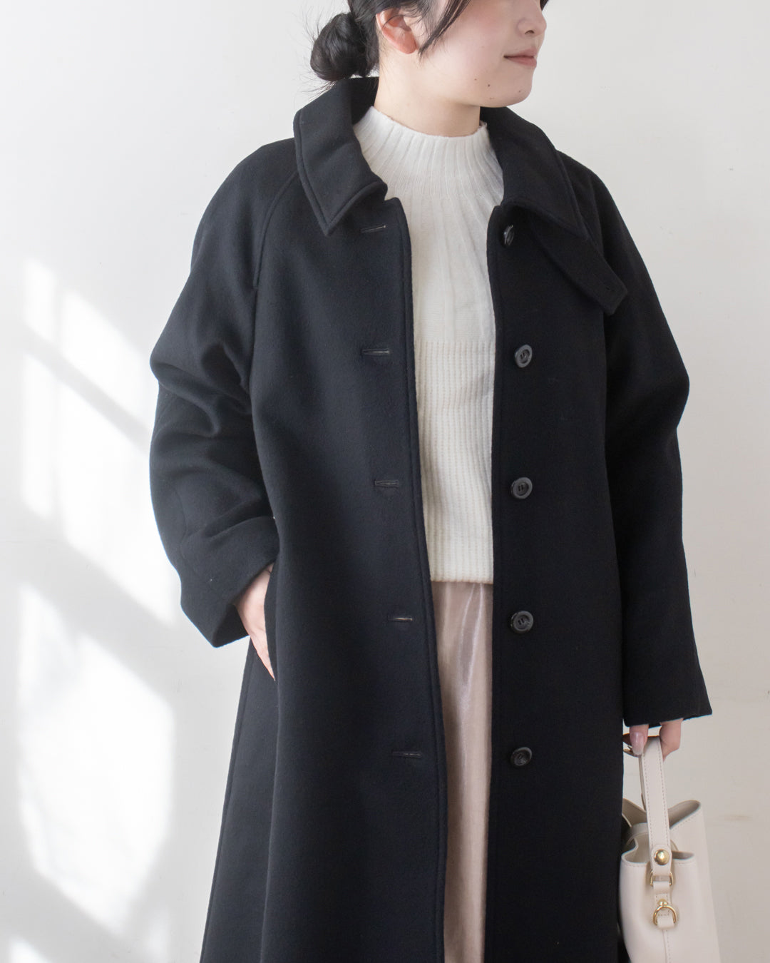 ■デザイン トレンドのステンカラーコート。 衿を立てて着用できるタイプでマフラー代わりにもなるタイプ。 スタンダードなデザインに、衿をやや大きめにして女性らしい印象を加えました。 袖はラグランスリーブにし、冬のニットが着やすい程よくゆったりしたシルエット。 大人カジュアルに欠かせないベーシックで永く愛用できるコートです。
