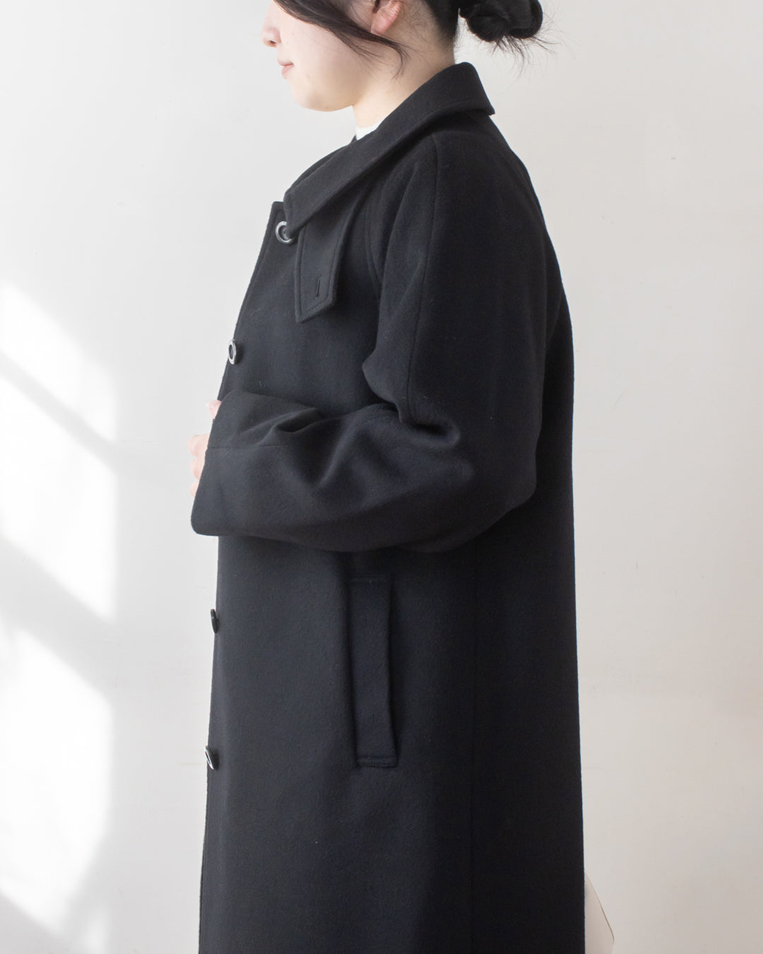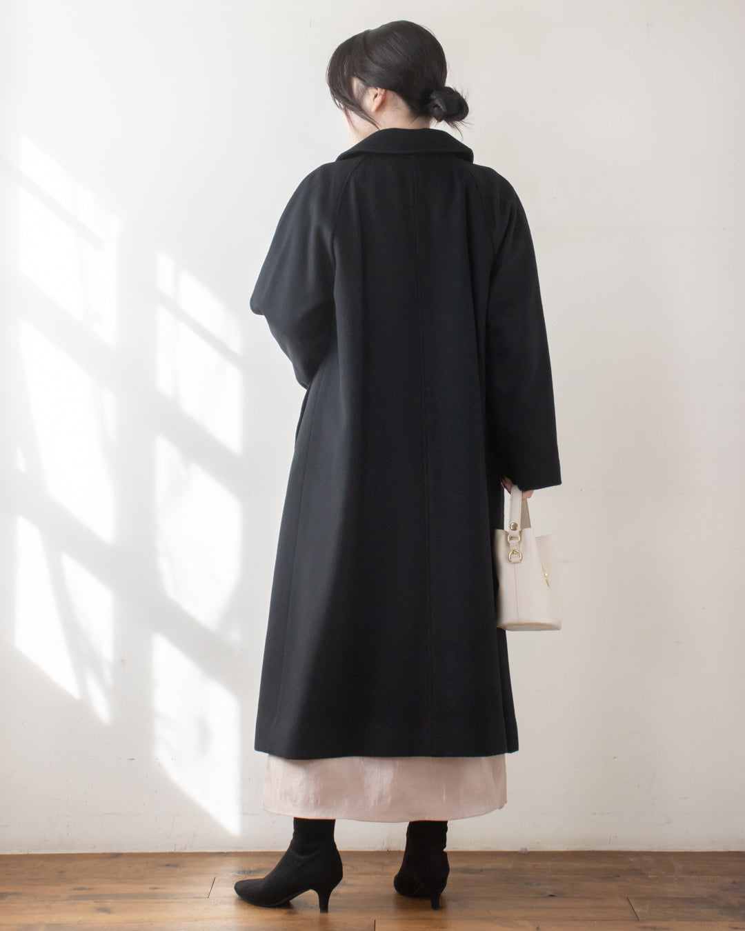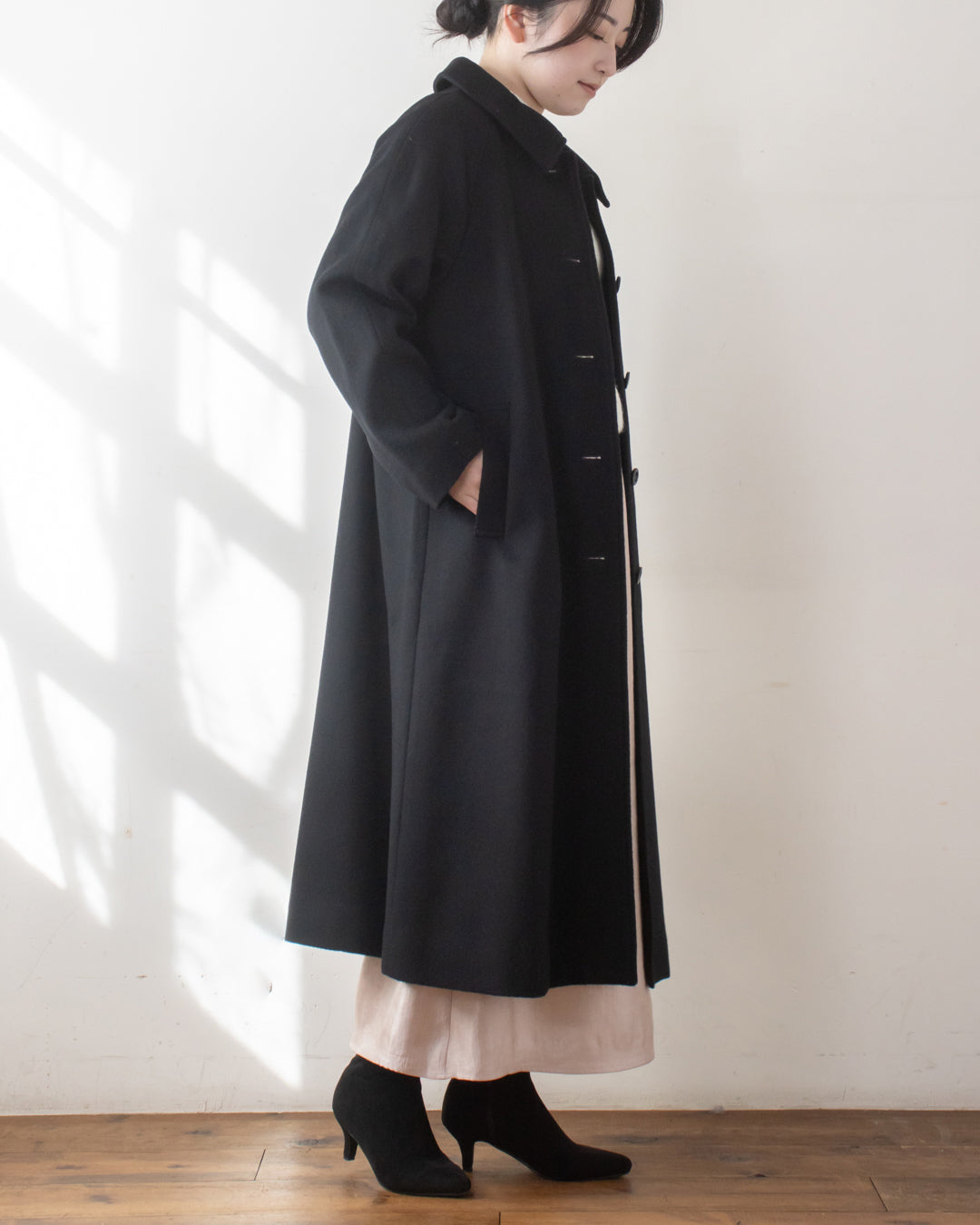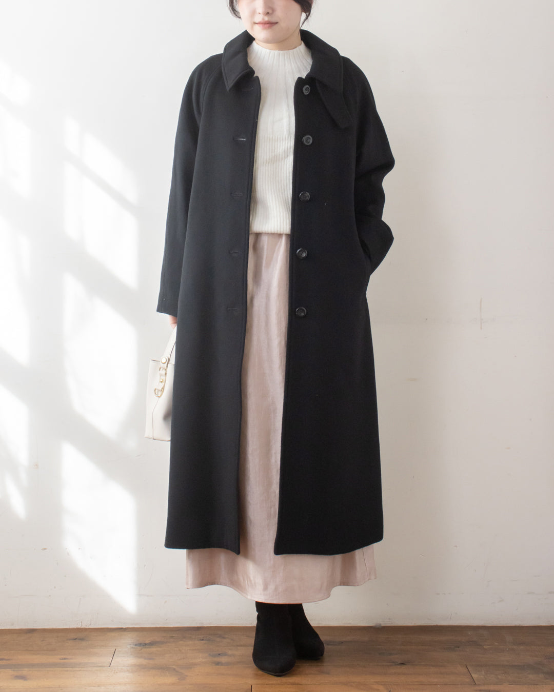 ■デザイン トレンドのステンカラーコート。 衿を立てて着用できるタイプでマフラー代わりにもなるタイプ。 スタンダードなデザインに、衿をやや大きめにして女性らしい印象を加えました。 袖はラグランスリーブにし、冬のニットが着やすい程よくゆったりしたシルエット。 大人カジュアルに欠かせないベーシックで永く愛用できるコートです。