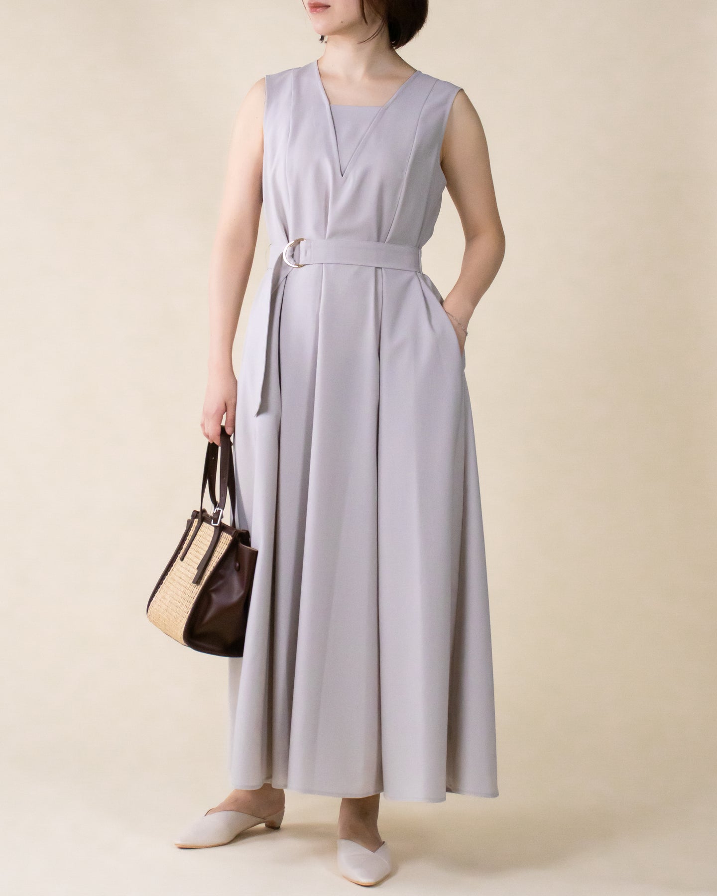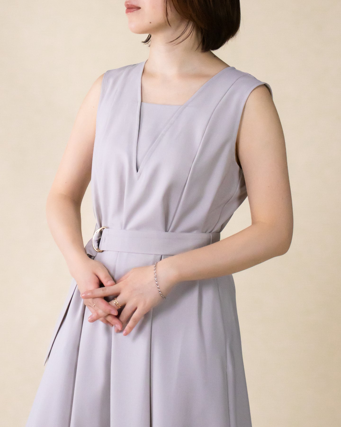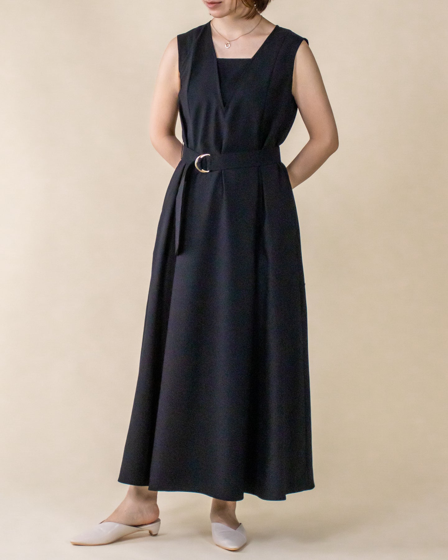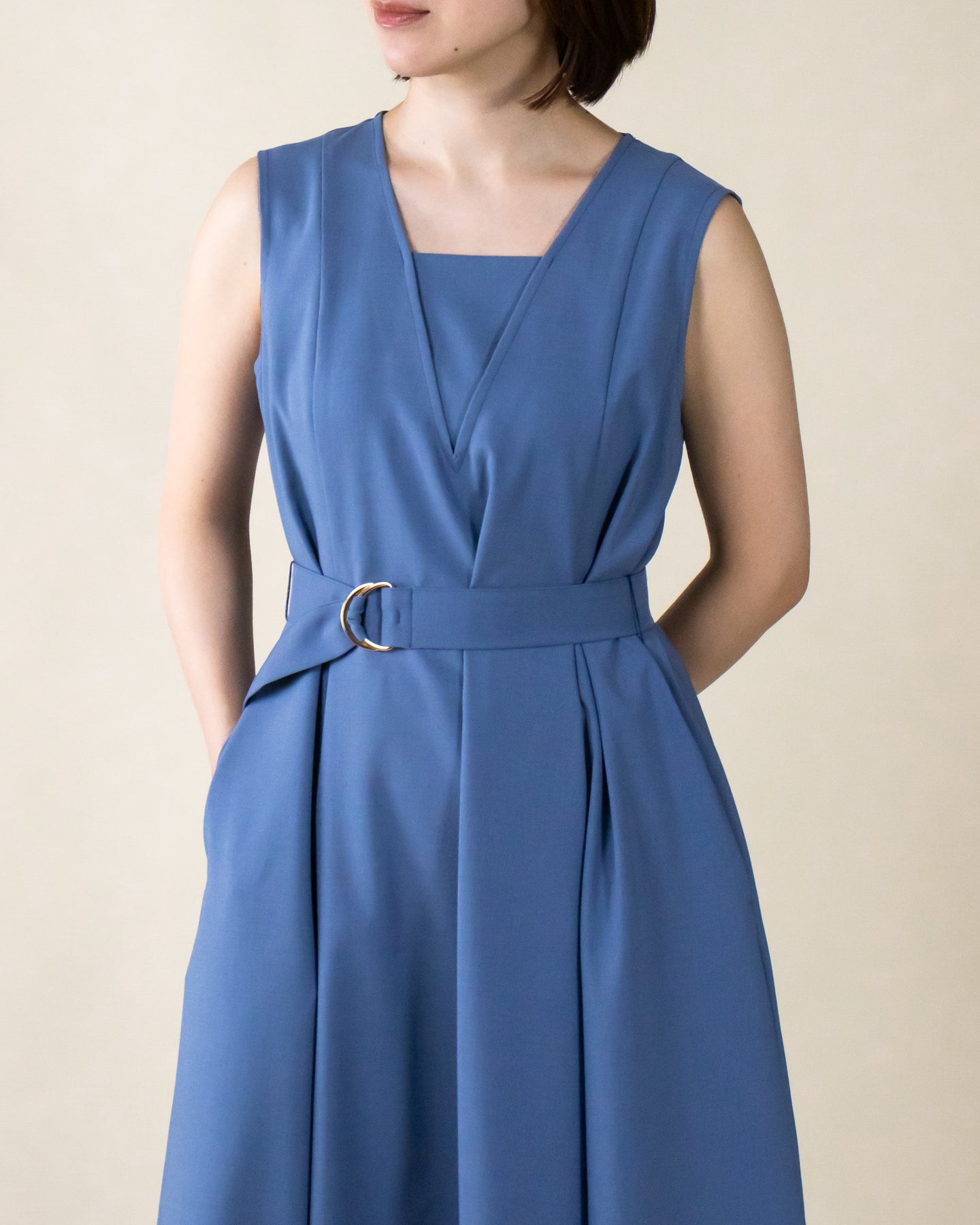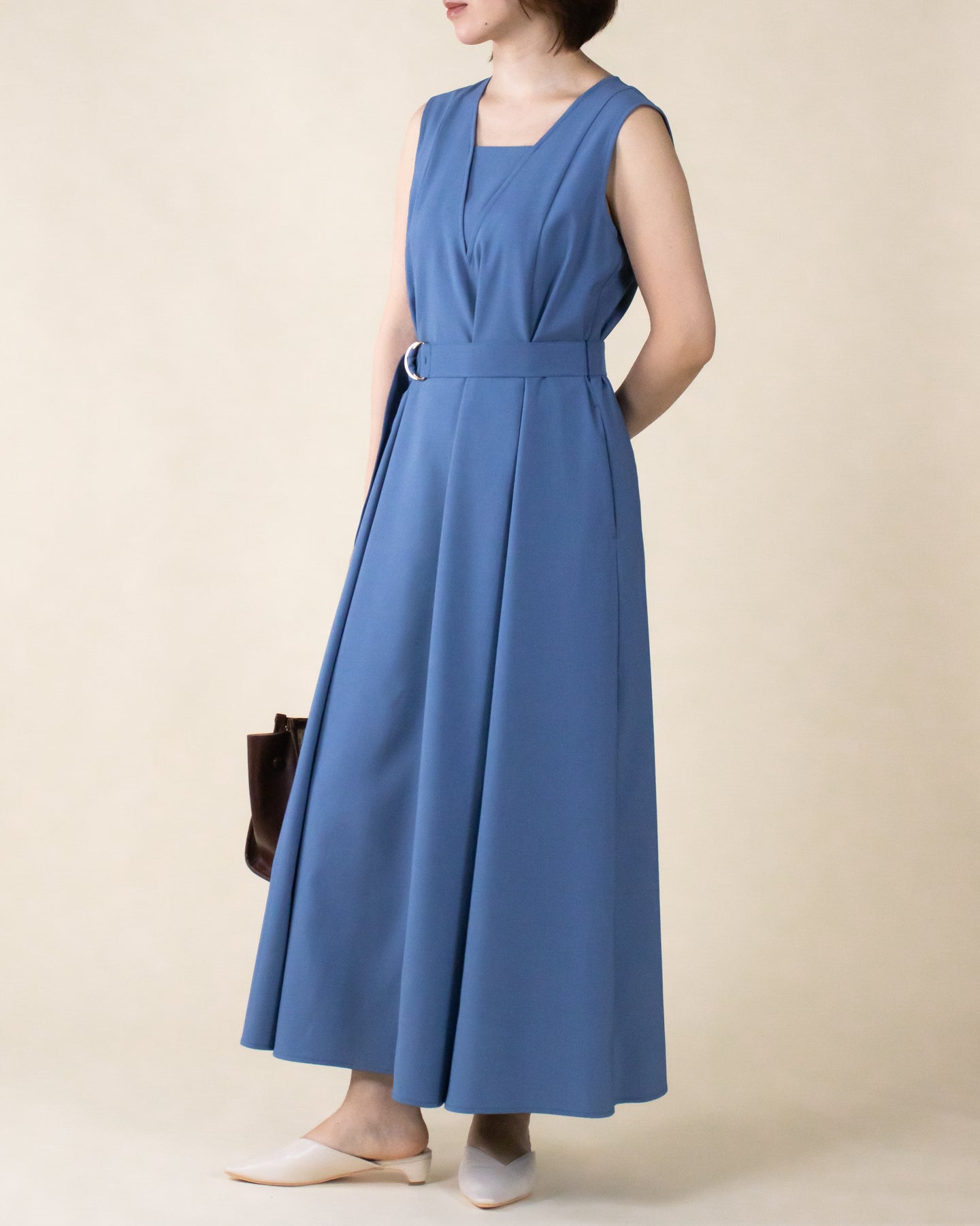 ■デザイン 夏のお出かけにぴったりなノースリーブワンピース。 重ね着したかのようなスクエアネックラインがポイントで、デコルテもすっきり綺麗に演出。 裾まで広がるフレアシルエットは優雅な印象◎ さらにベルトでウエストマークした着こなしでスタイルアップ効果も期待できます♪ シワになりにくく、汗も乾きやすい素材を使用。