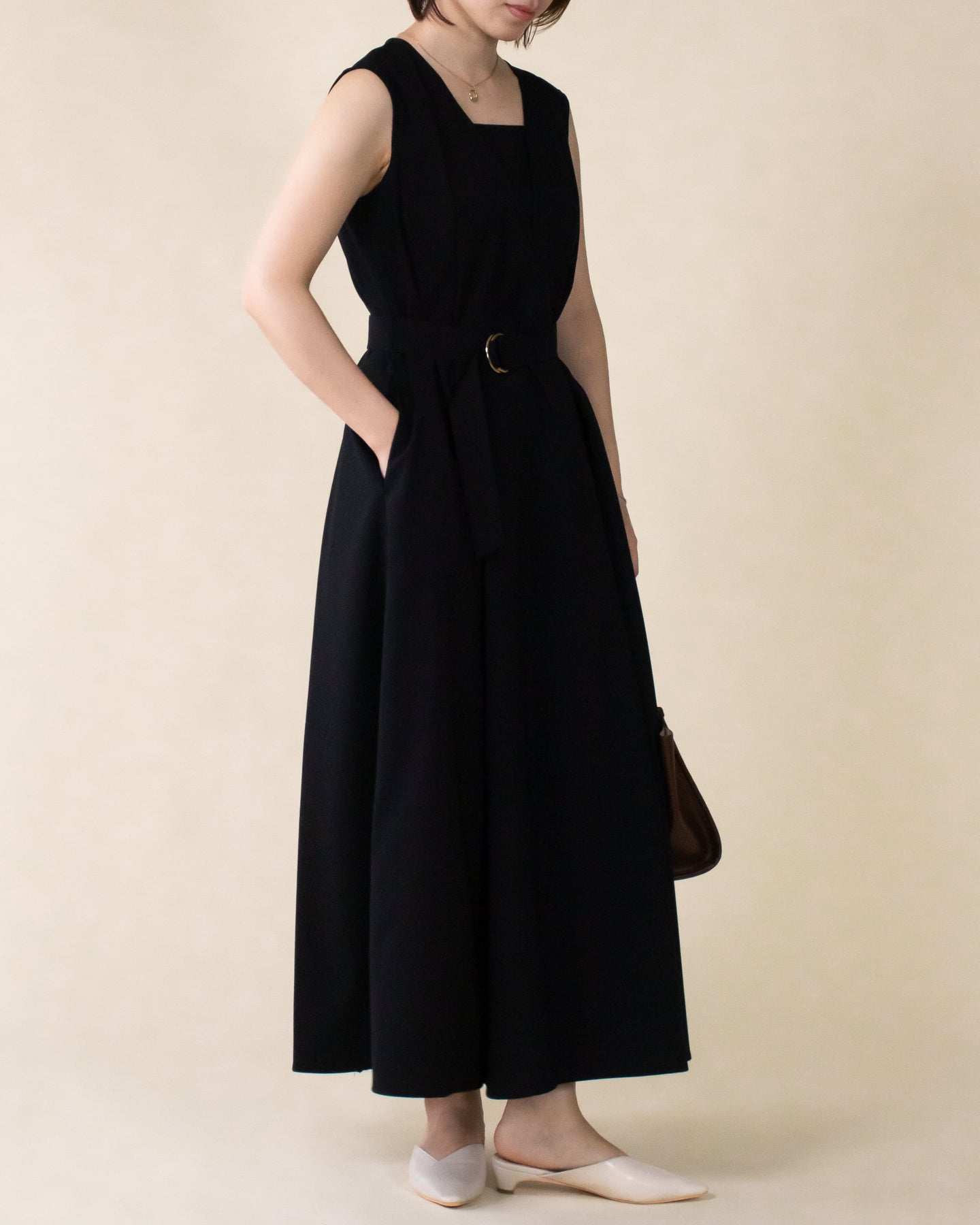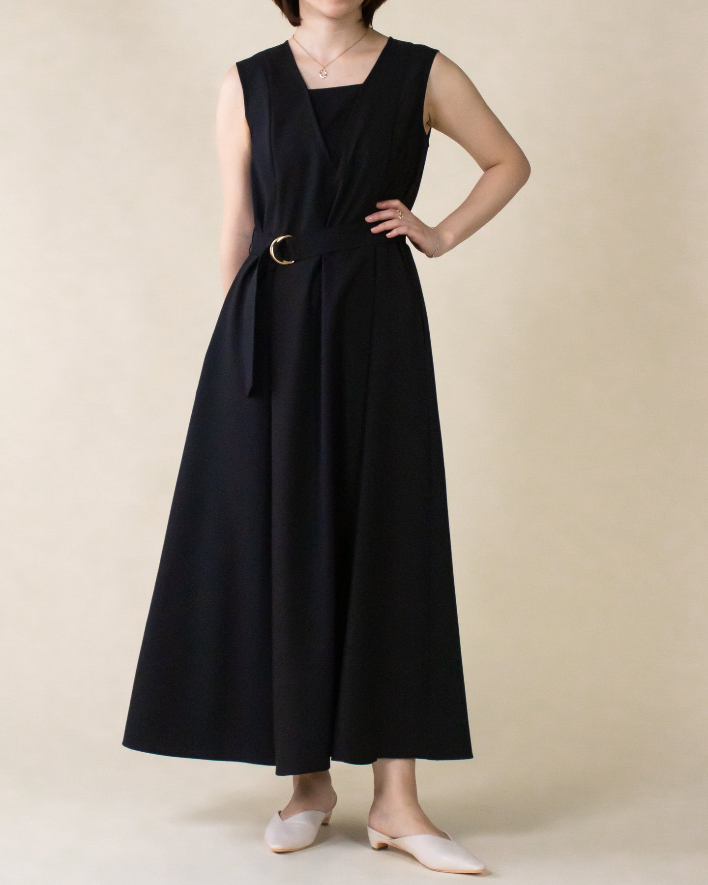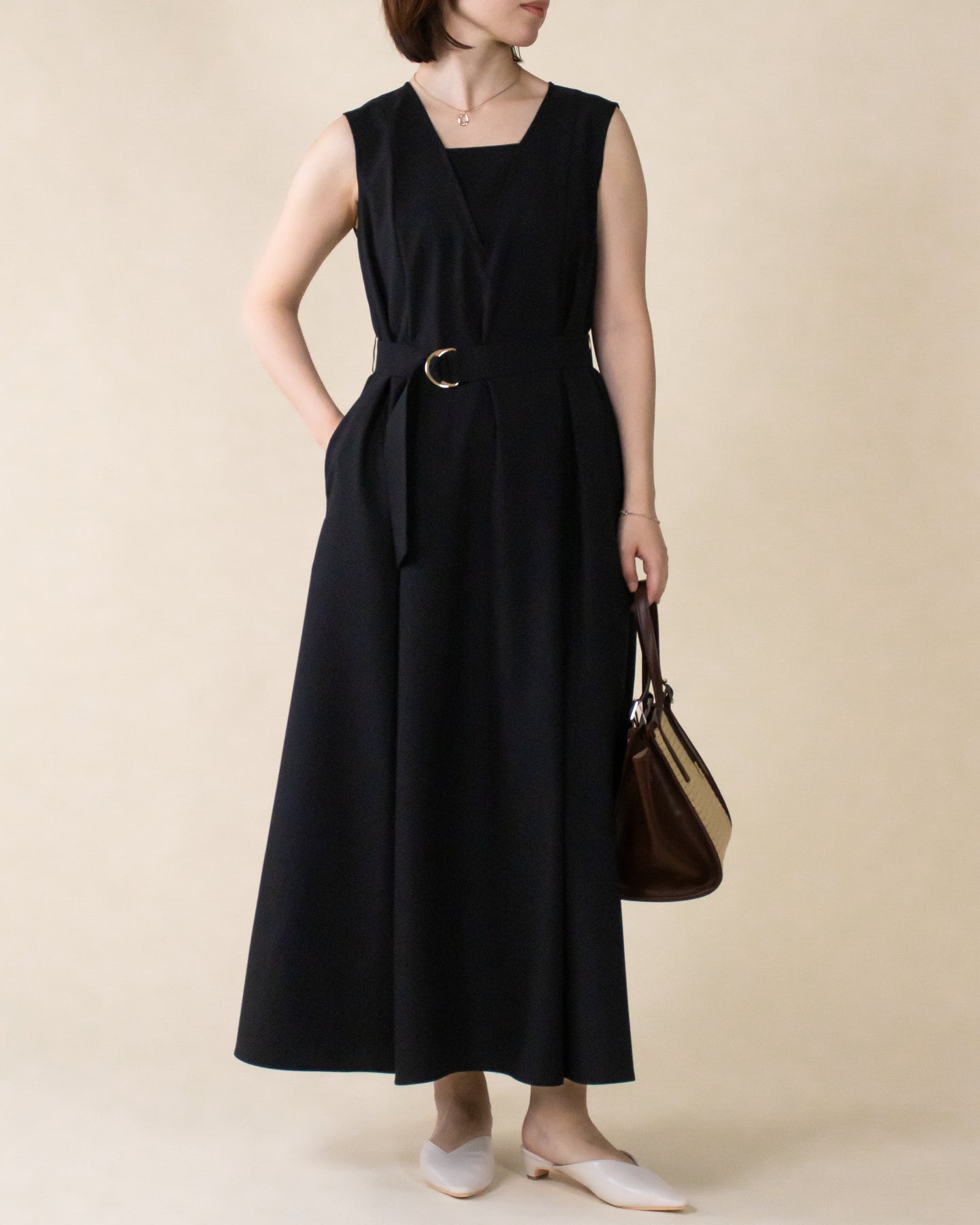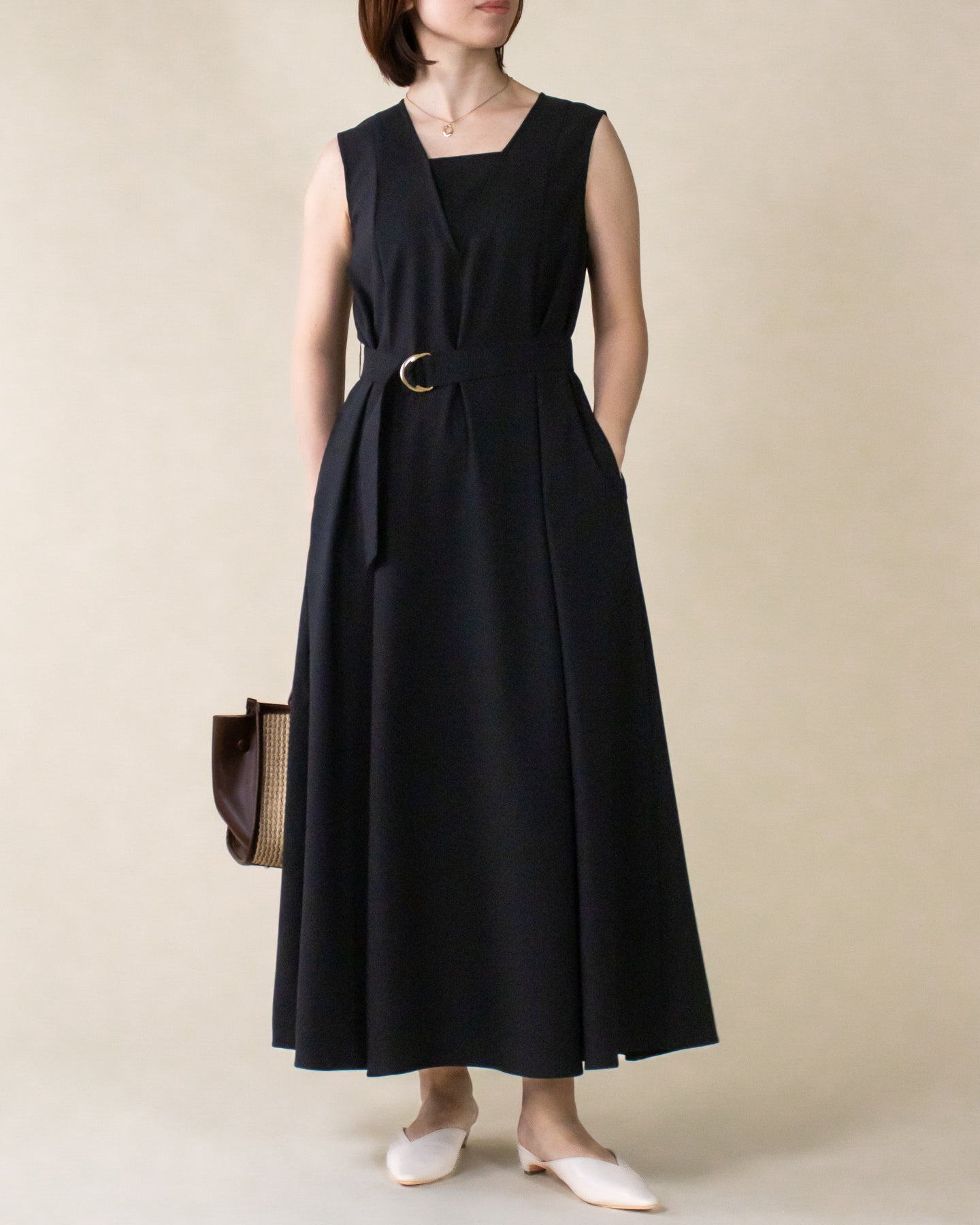■デザイン 夏のお出かけにぴったりなノースリーブワンピース。 重ね着したかのようなスクエアネックラインがポイントで、デコルテもすっきり綺麗に演出。 裾まで広がるフレアシルエットは優雅な印象◎ さらにベルトでウエストマークした着こなしでスタイルアップ効果も期待できます♪ シワになりにくく、汗も乾きやすい素材を使用。