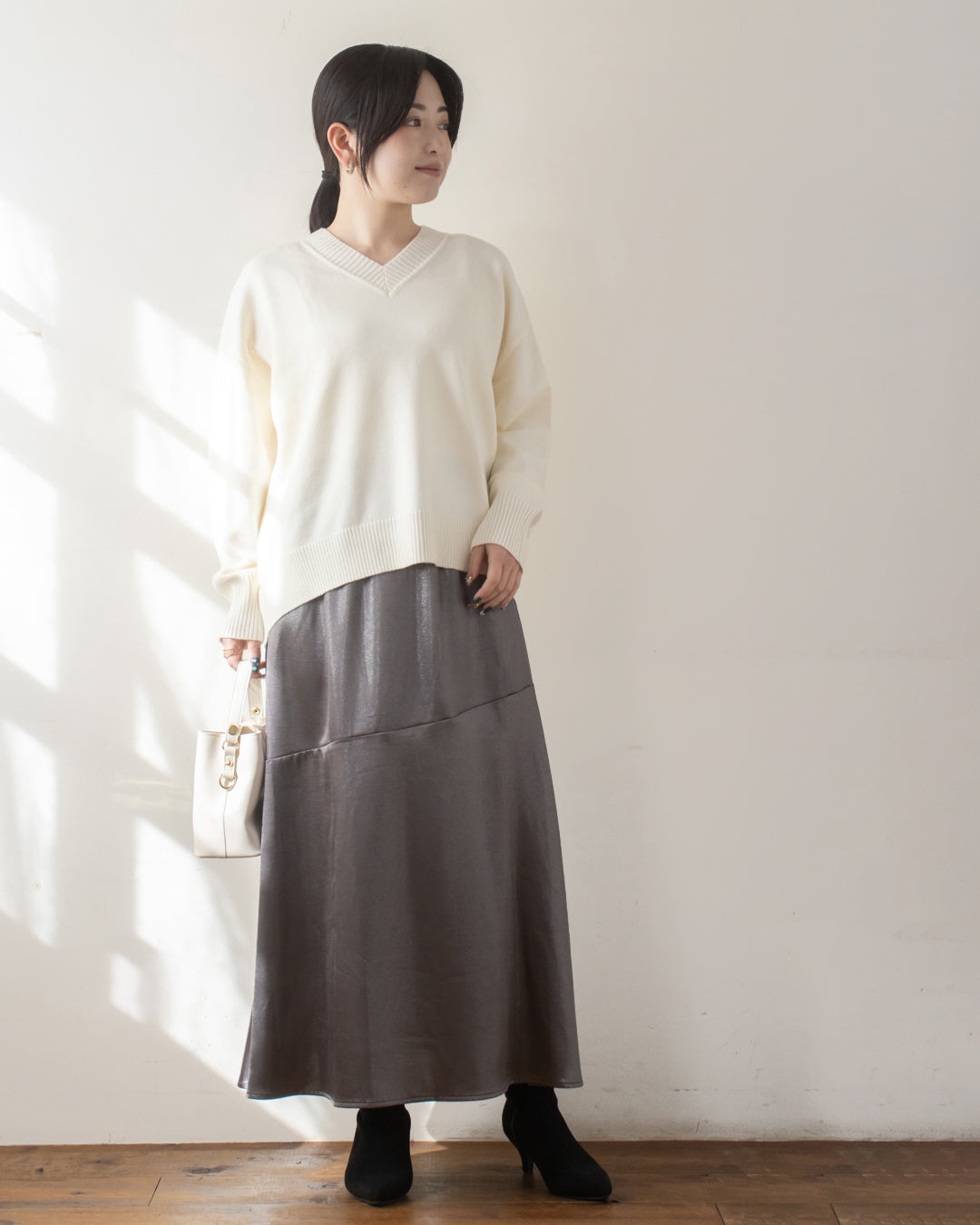 Vネックラインと後ろに向かって長くなった丈が大人の抜け感を演出してくれます。